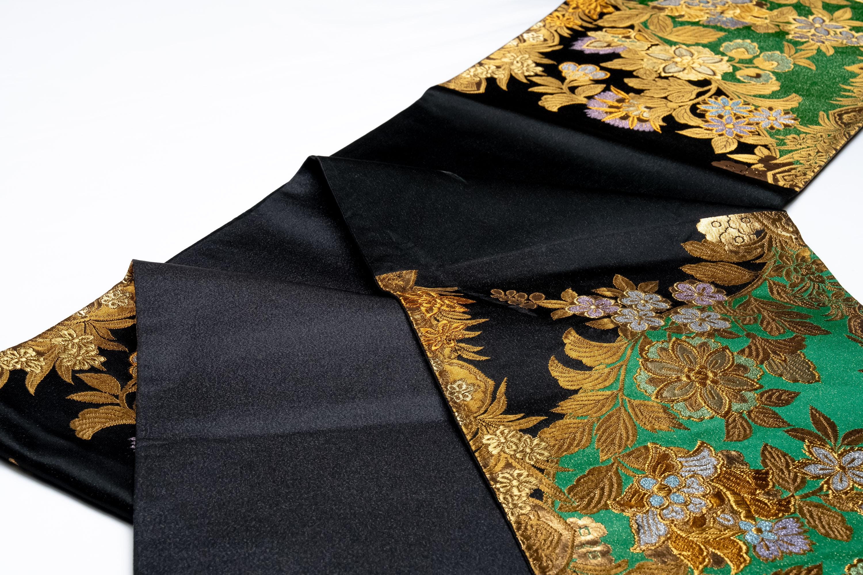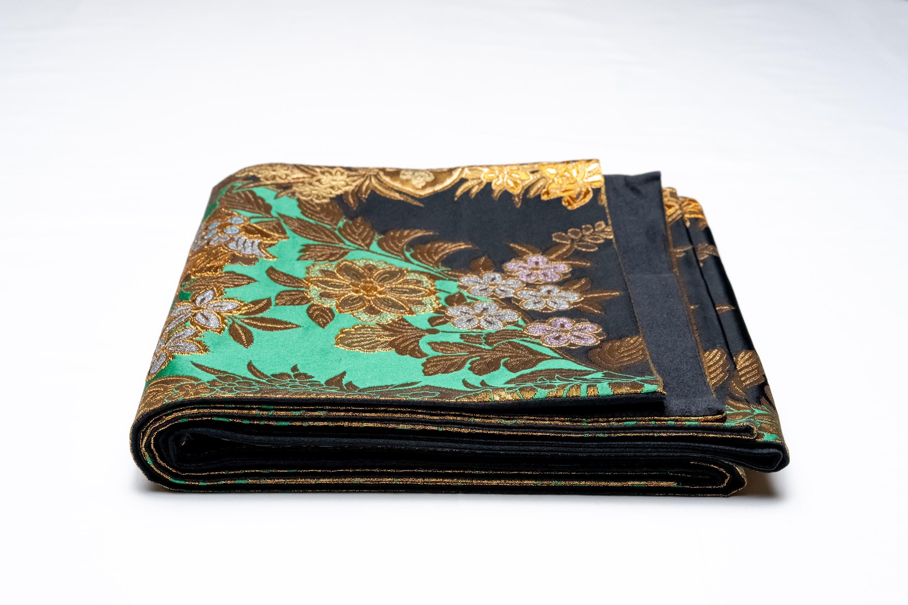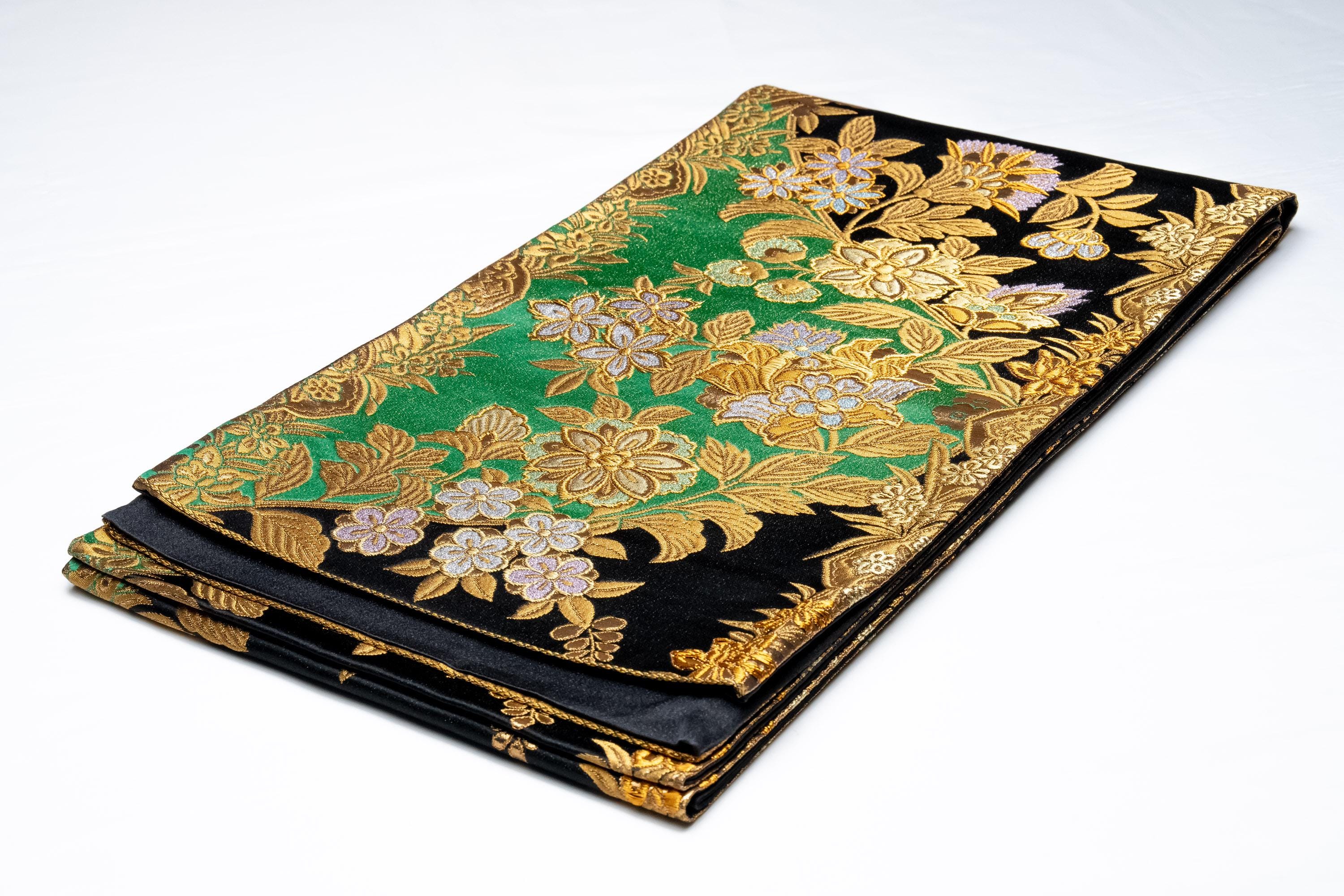 Fukuro Obi is a full-size sash belt that wraps around the torso in women's formal Kimono wearing. It is wider, longer and heavier than other informal Obis and serves the purpose of keeping the Kimono front closed securely, drawing up excess fabric to adjust the length of Kimono, and decorative expressions.