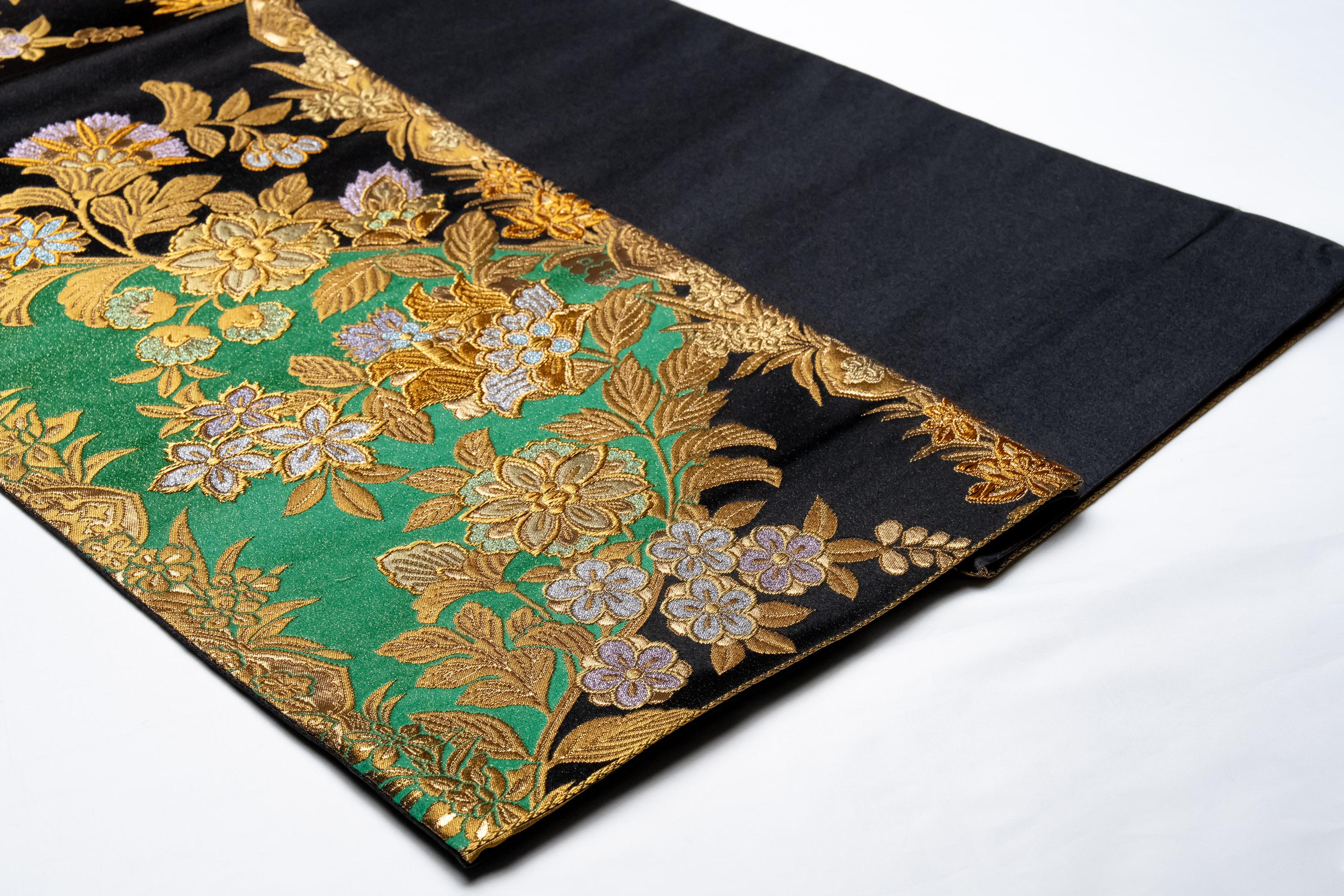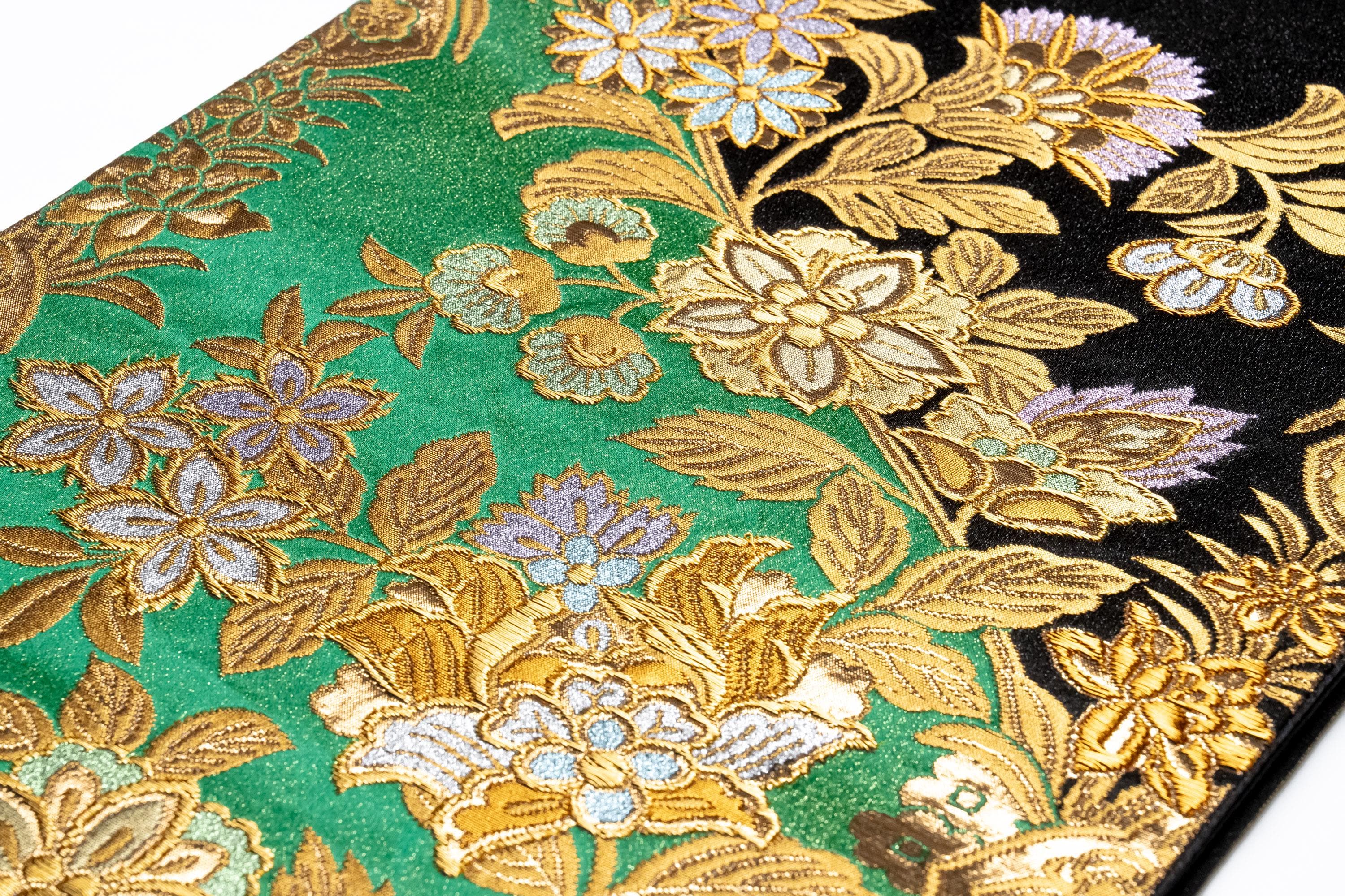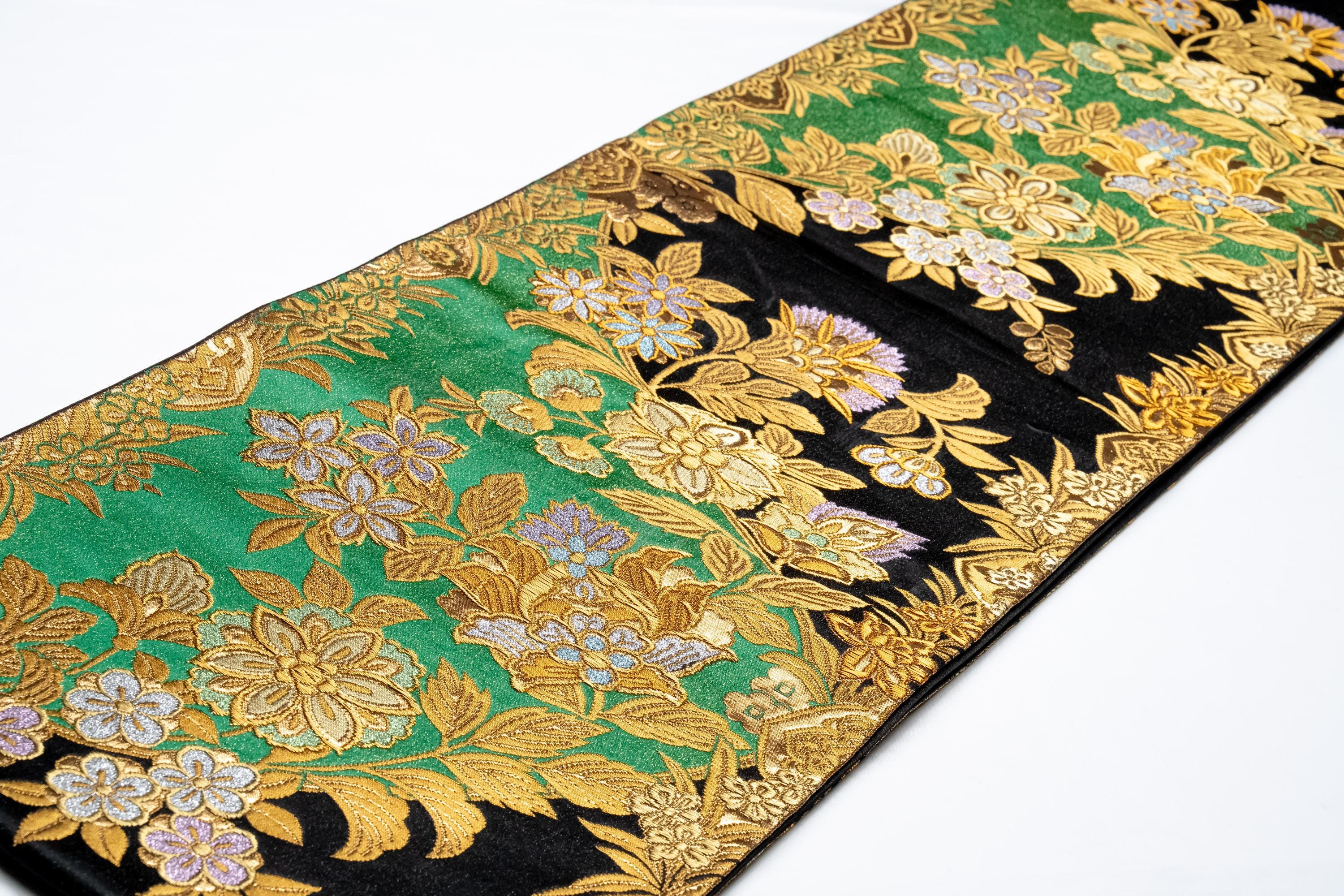 Fukuro Obi is a full-size sash belt that wraps around the torso in women's formal Kimono wearing. It is wider, longer and heavier than other informal Obis and serves the purpose of keeping the Kimono front closed securely, drawing up excess fabric to adjust the length of Kimono, and decorative expressions.