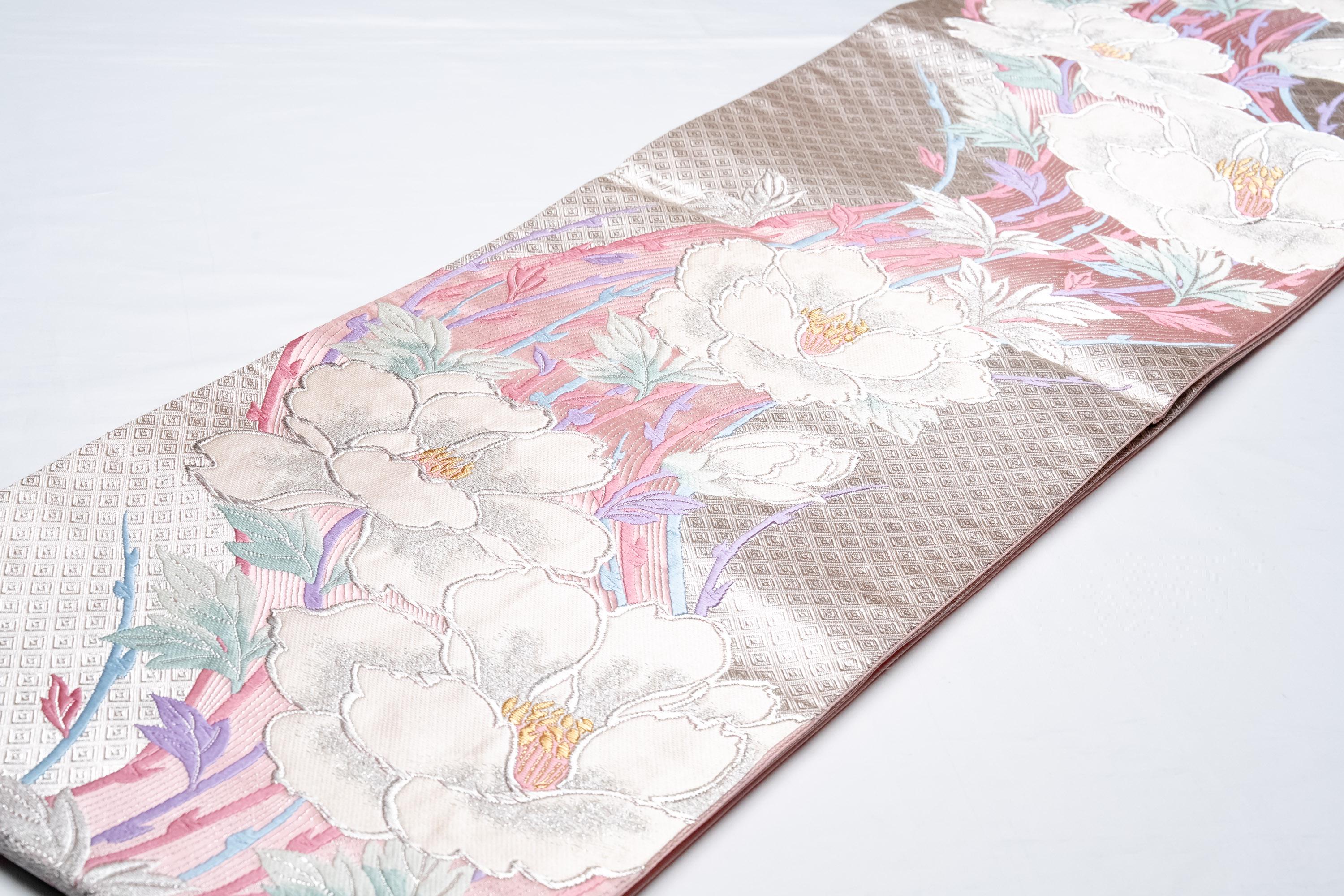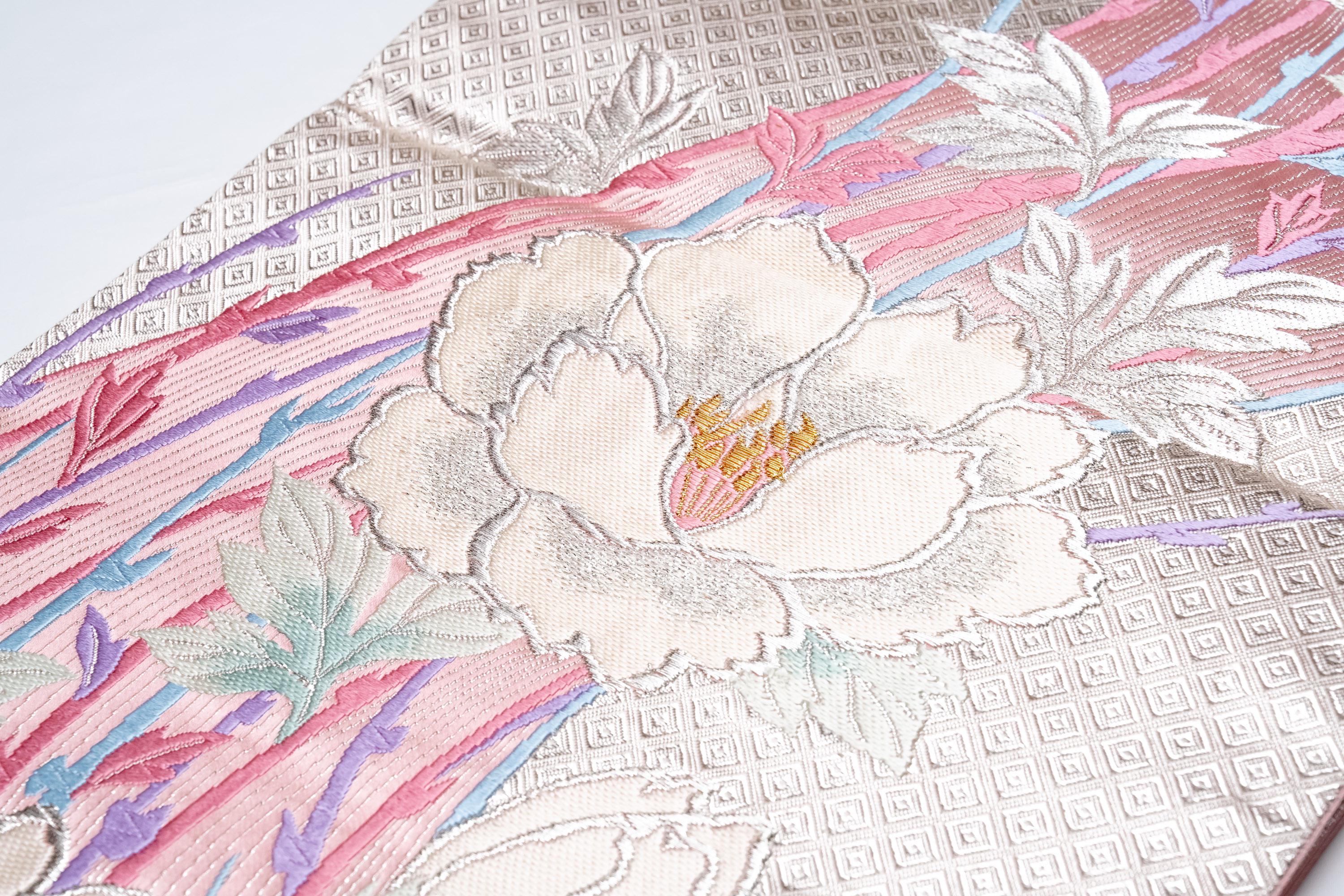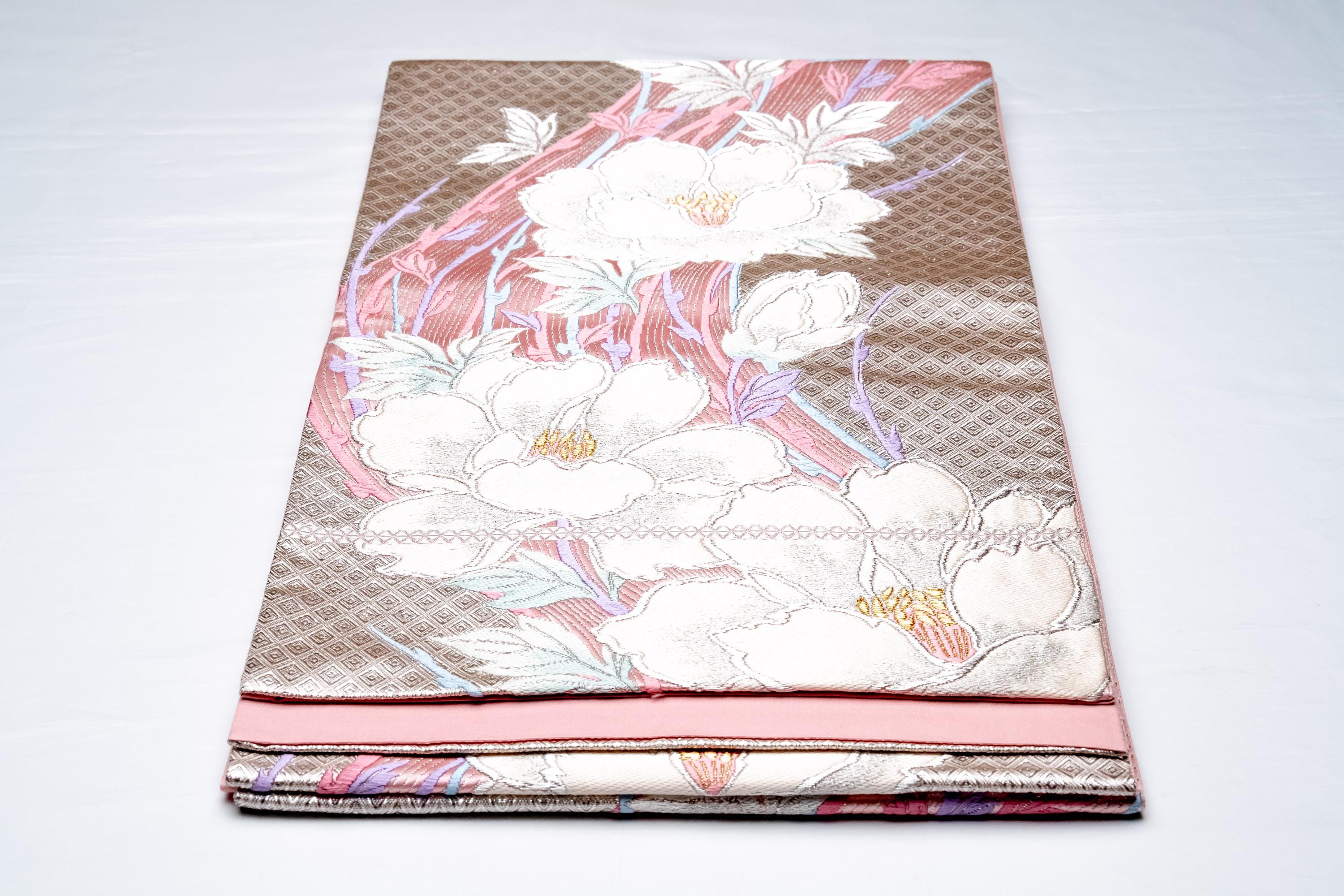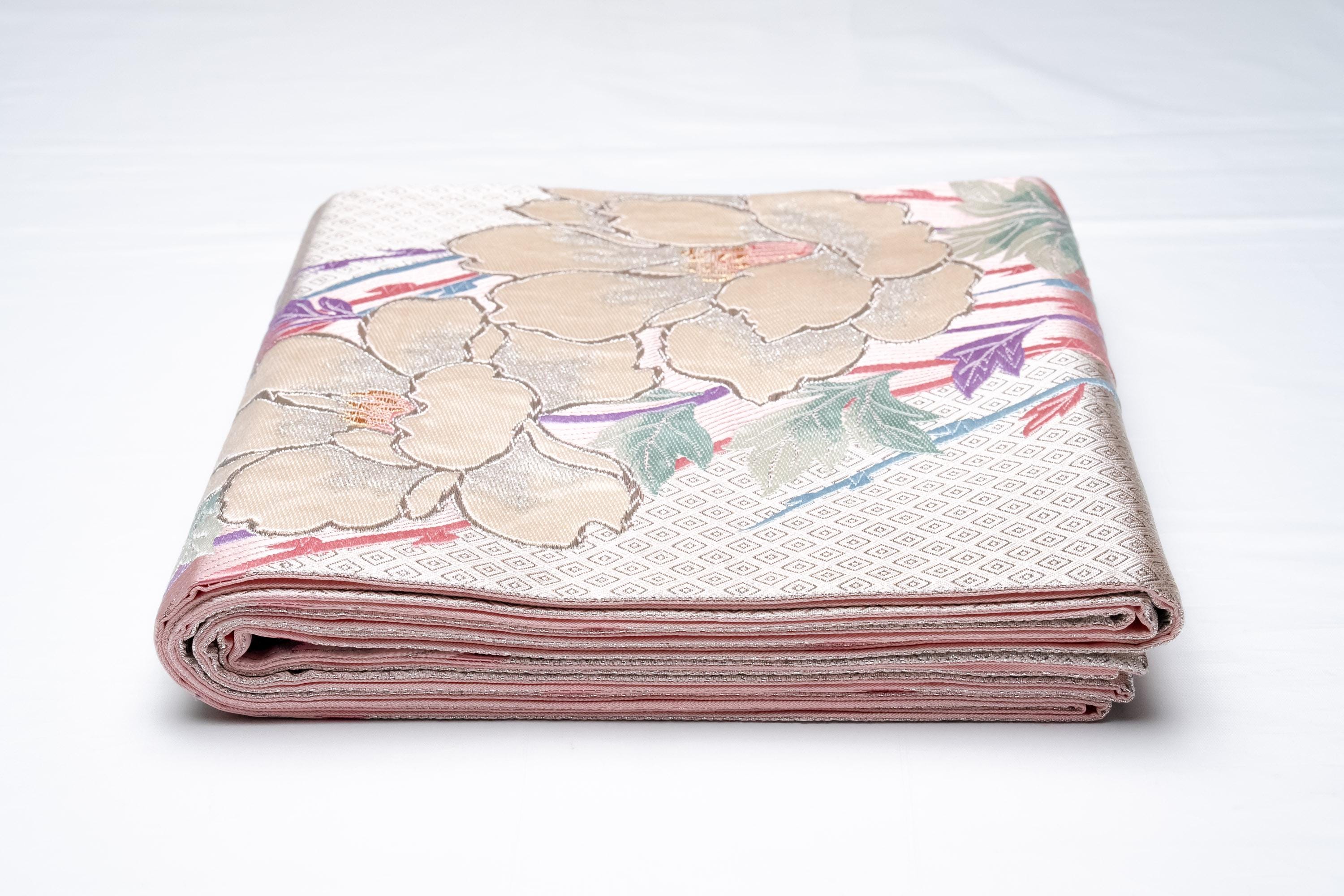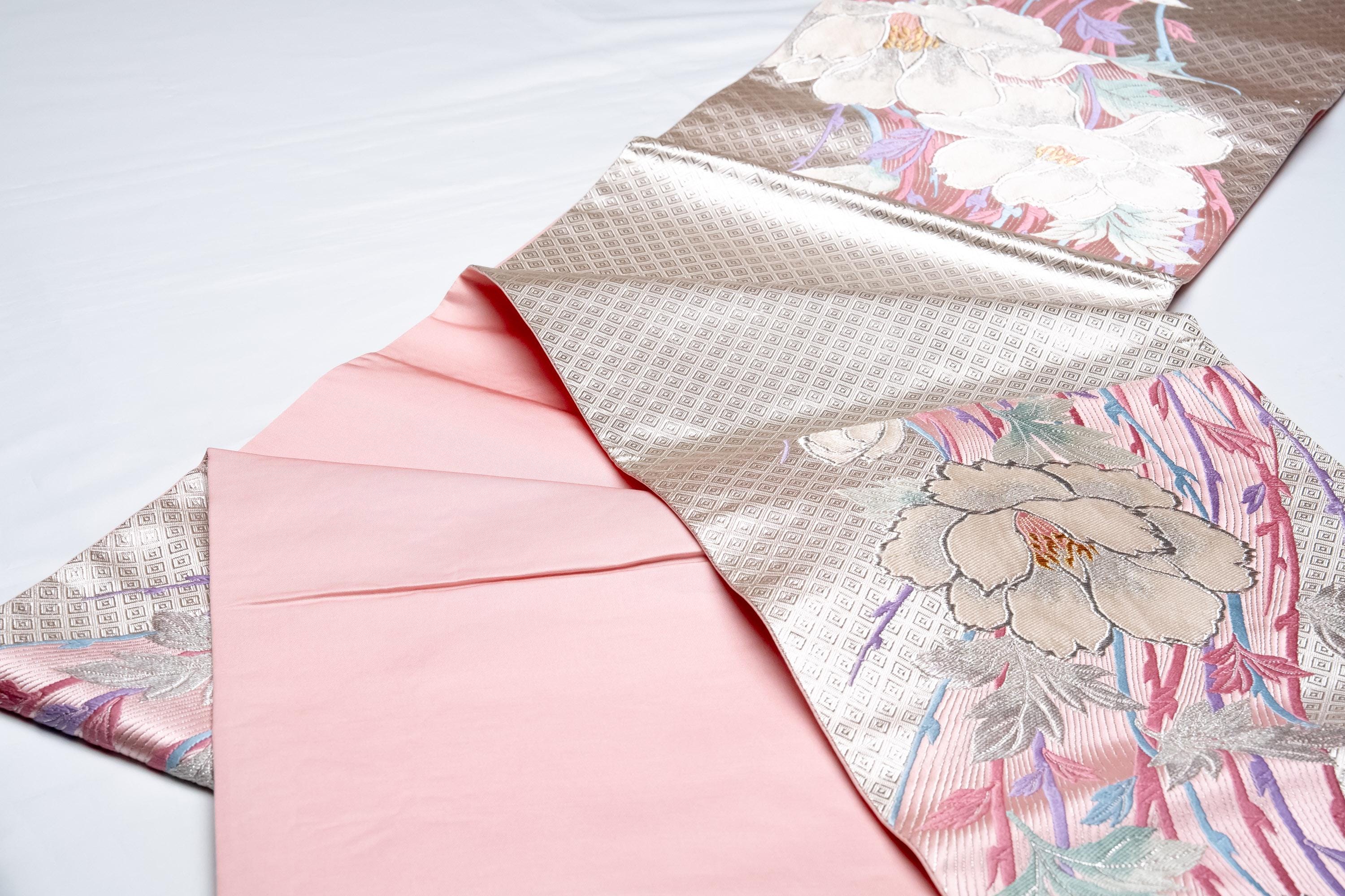 Fukuro Obi is a full-size sash belt that wraps around the torso in women's formal Kimono wearing. It is wider, longer and heavier than other informal Obis and serves the purpose of keeping the Kimono front closed securely, drawing up excess fabric to adjust the length of Kimono, and decorative expressions.