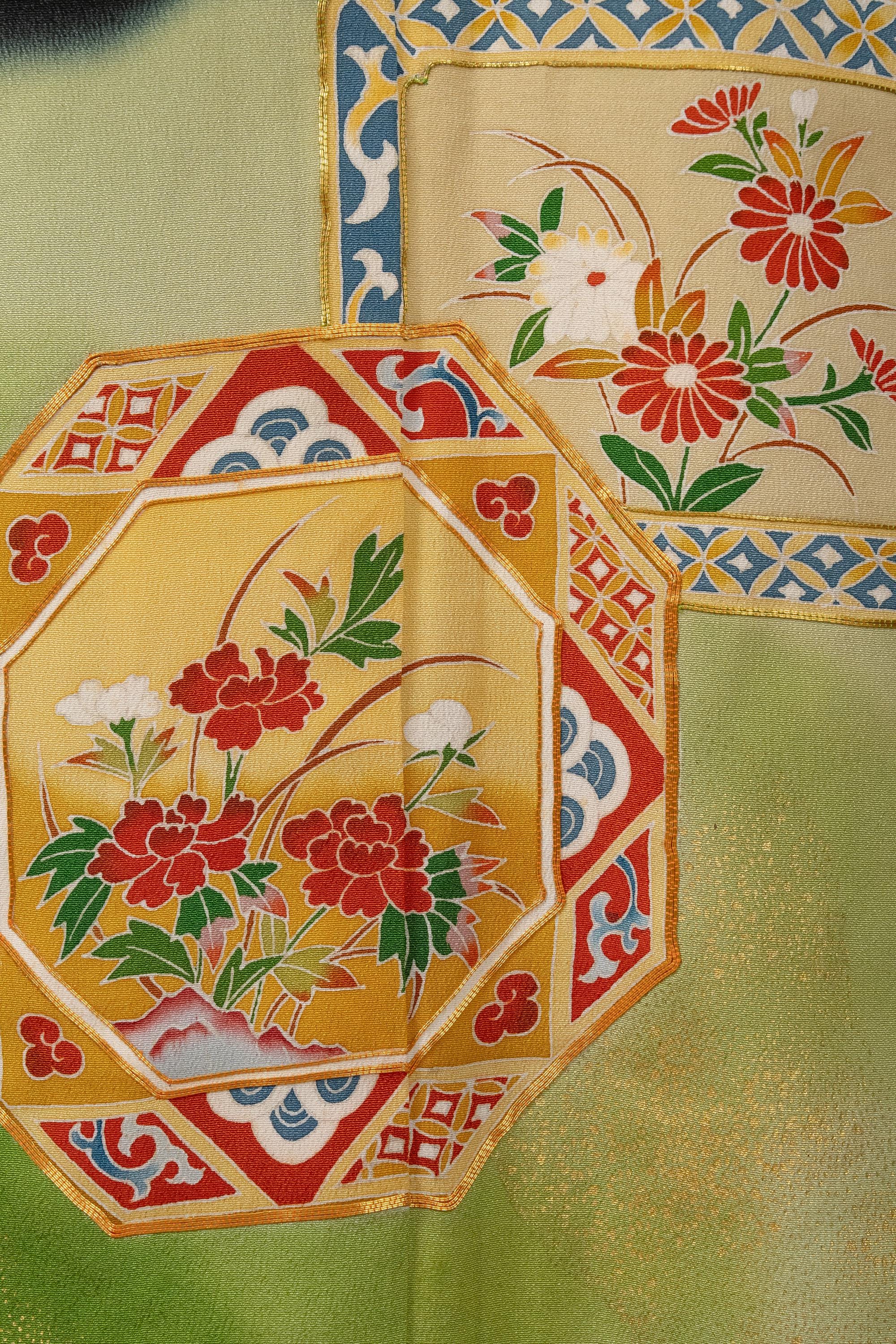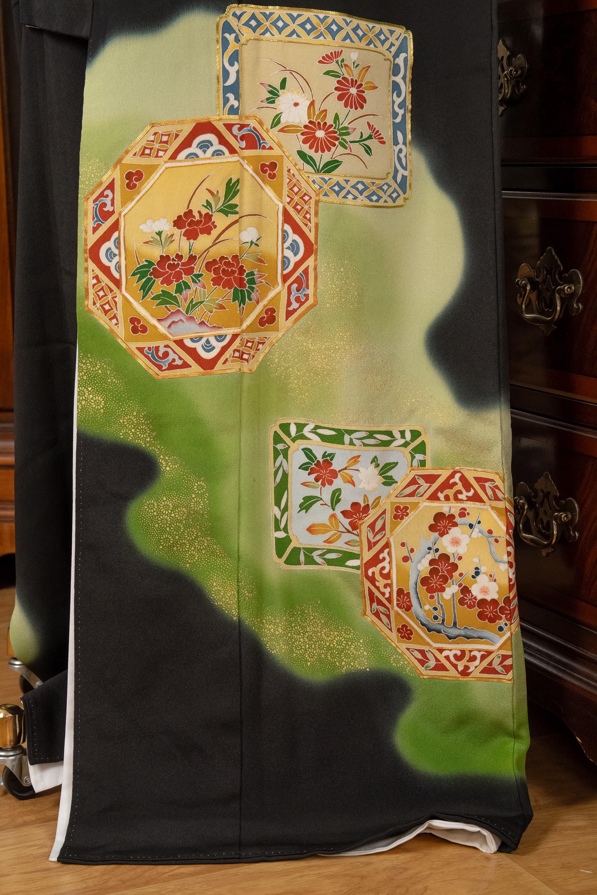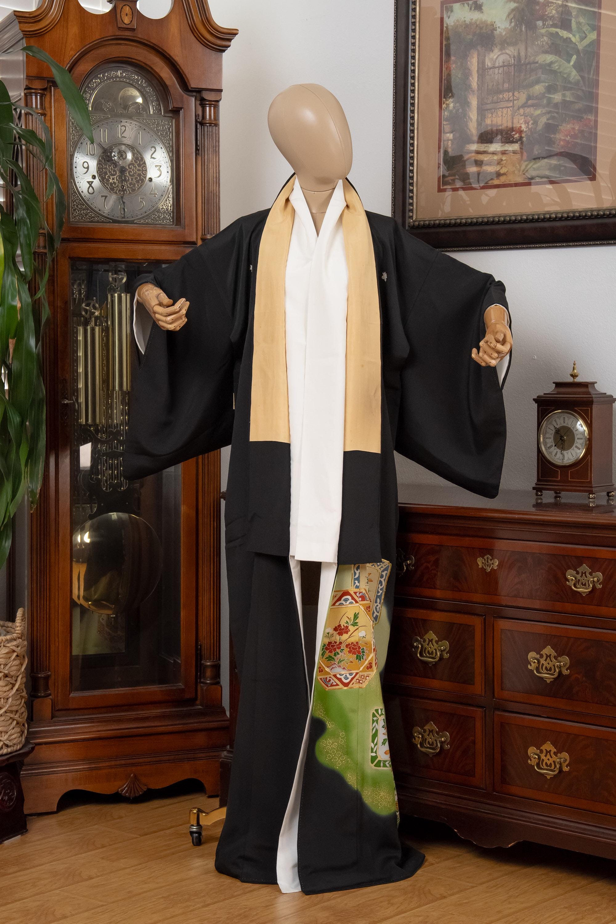 Tomesode is the most formal, high class Kimono for all ceremonies and occasions. Black ones are worn by married women and colored ones are worn by both married and unmarried women. Distinct characteristics of Tomesode are family crests and surrounding patterns around the hem. Numbers of family crests specify formality and rank.