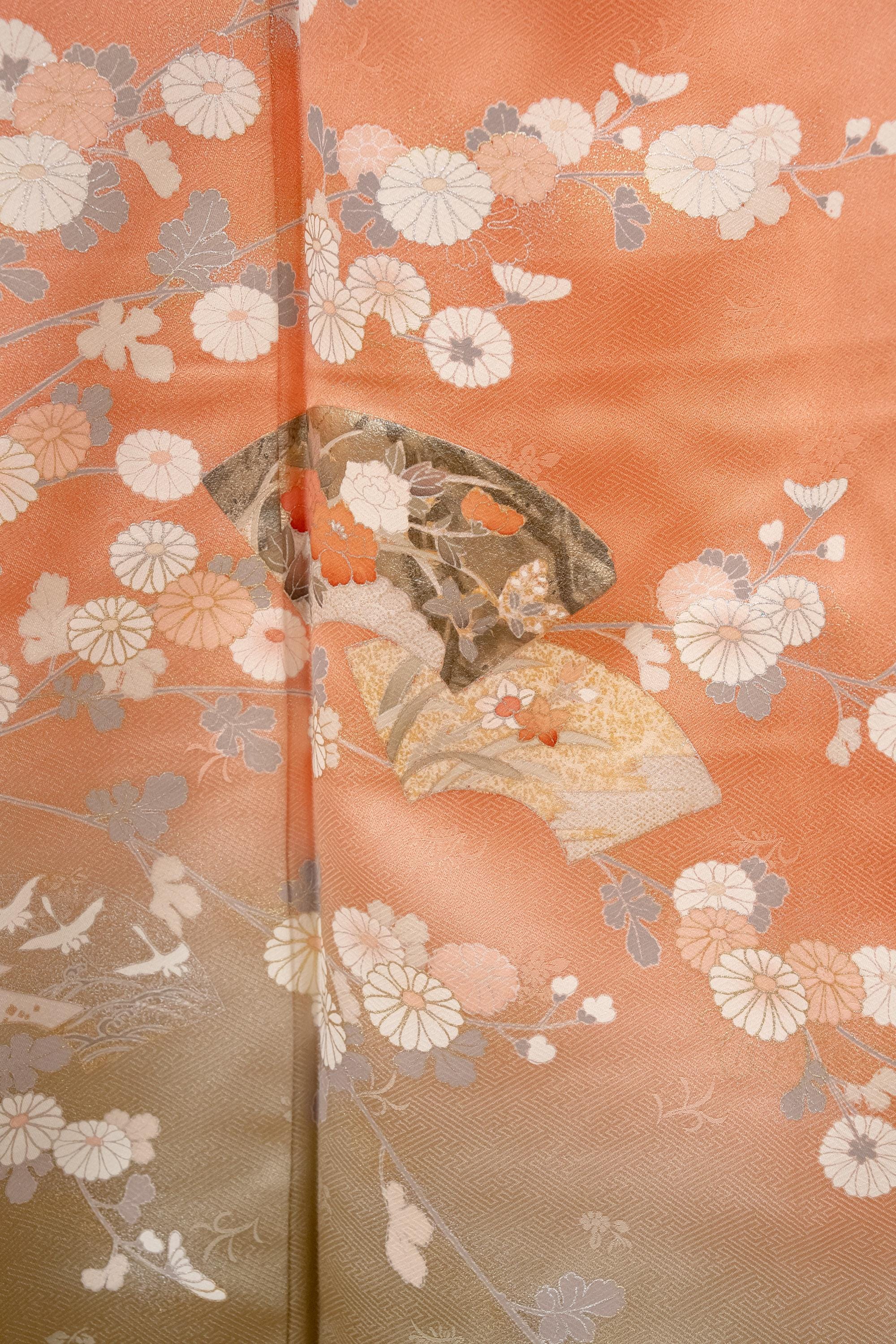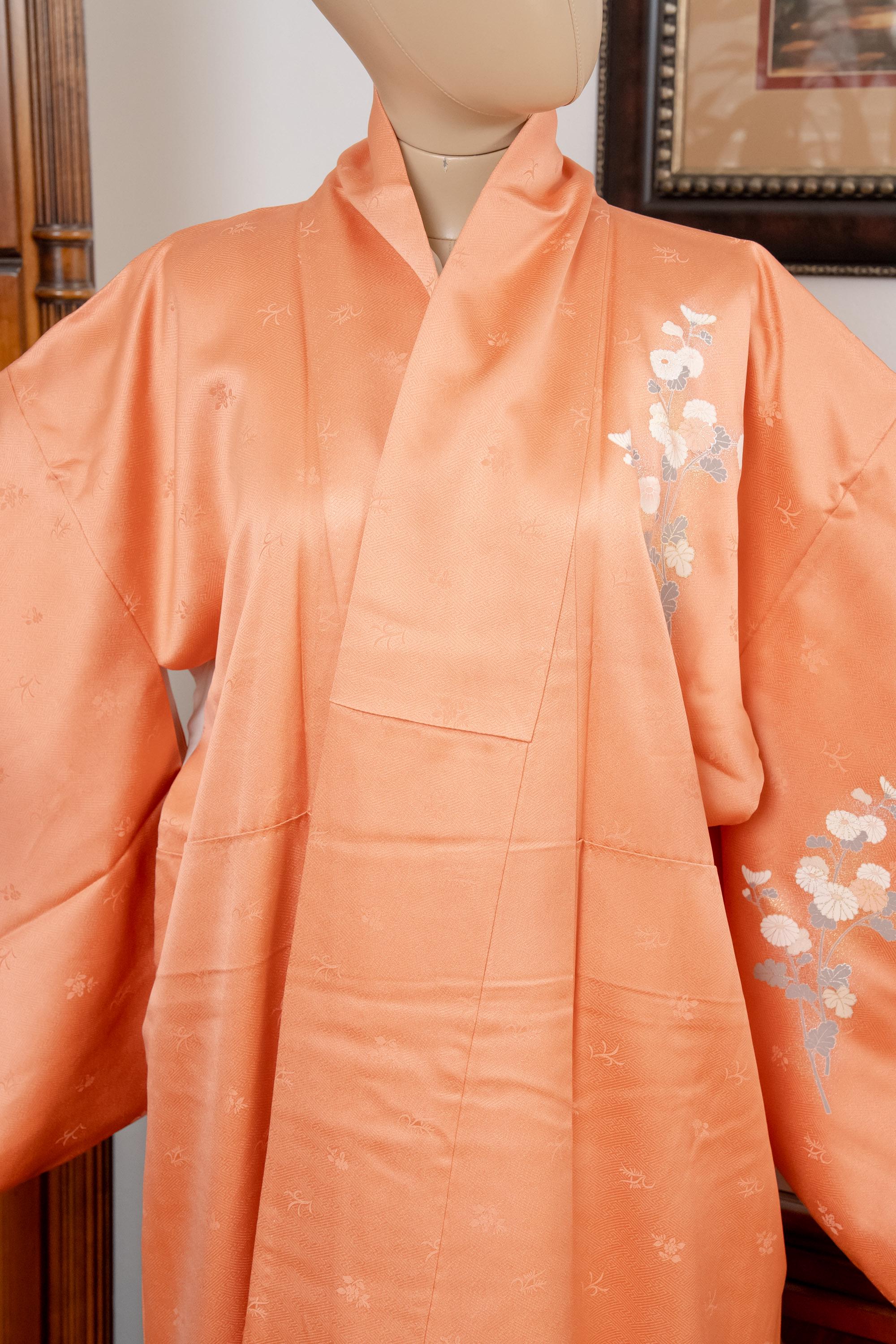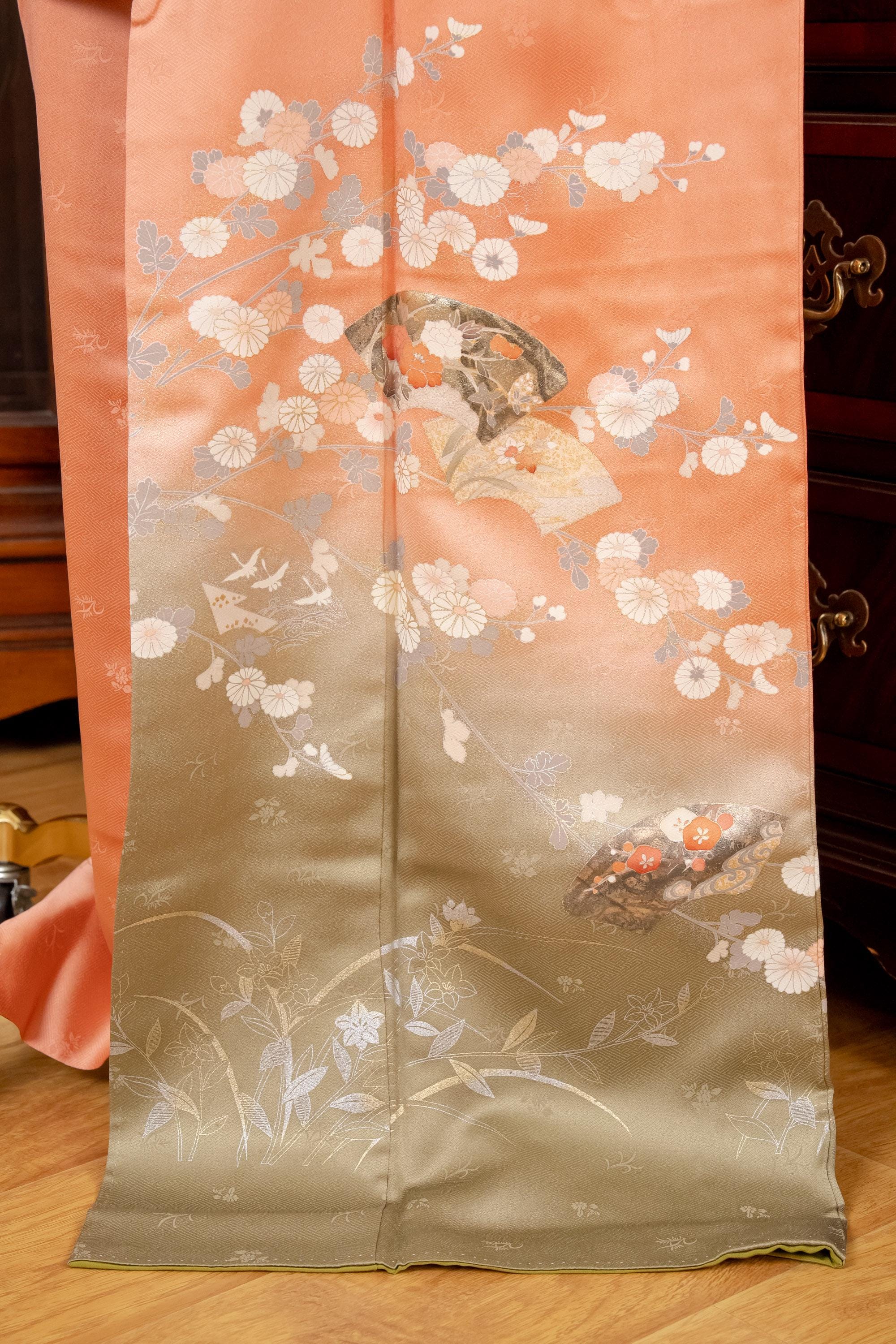 Homongi is a high-class formal Kimono for official visits that became very popular in Meiji period among upper-class females. It is commonly worn as a festive garment for ceremonies and parties by both married and unmarried women. Linked patterns on the chest, shoulder, sleeves and family crests are distinct characteristics of Homongi Kimono.