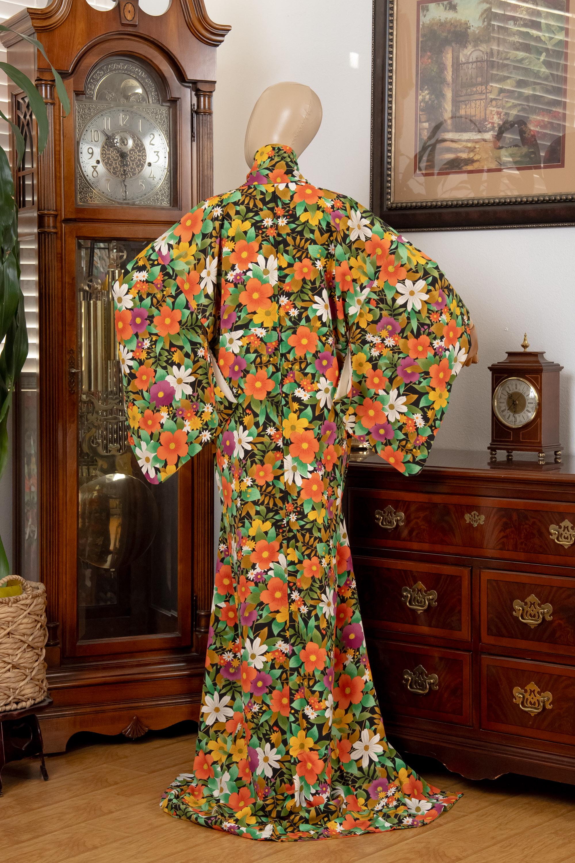 Please keep in mind that female Kimonos are supposed to fit long. You will need to adjust the length to your size by tying with Kitsuke accessories and Obi belt.
