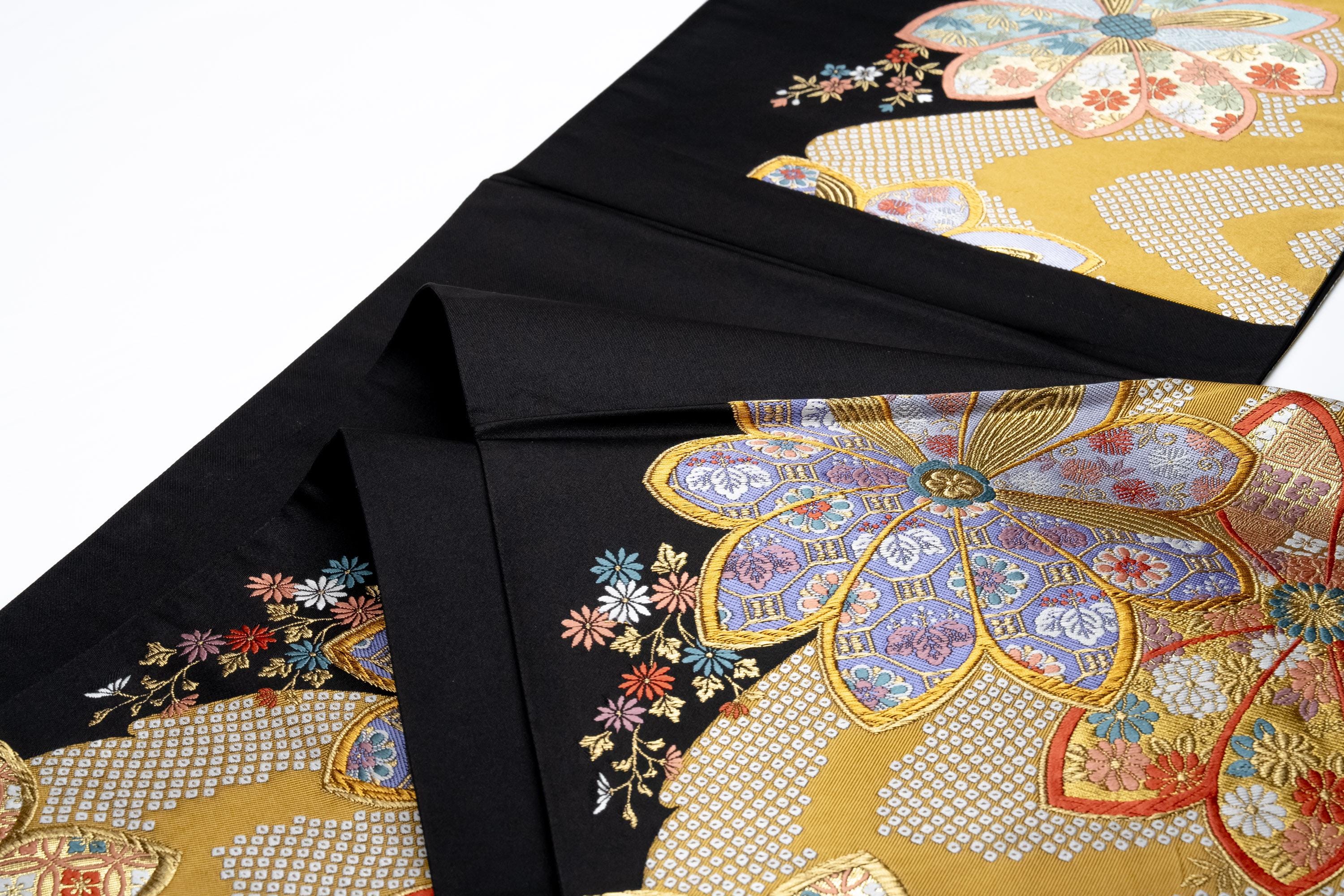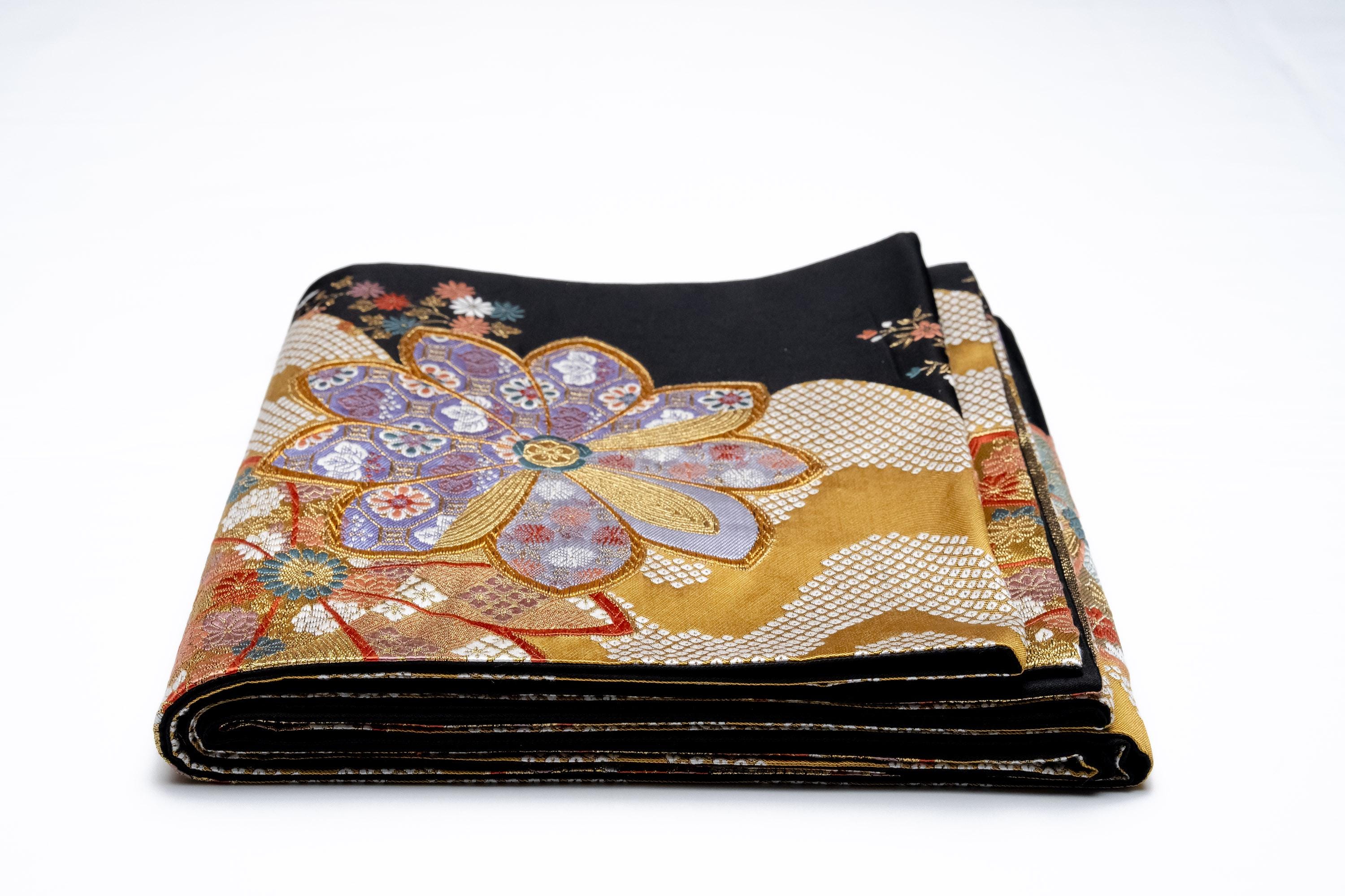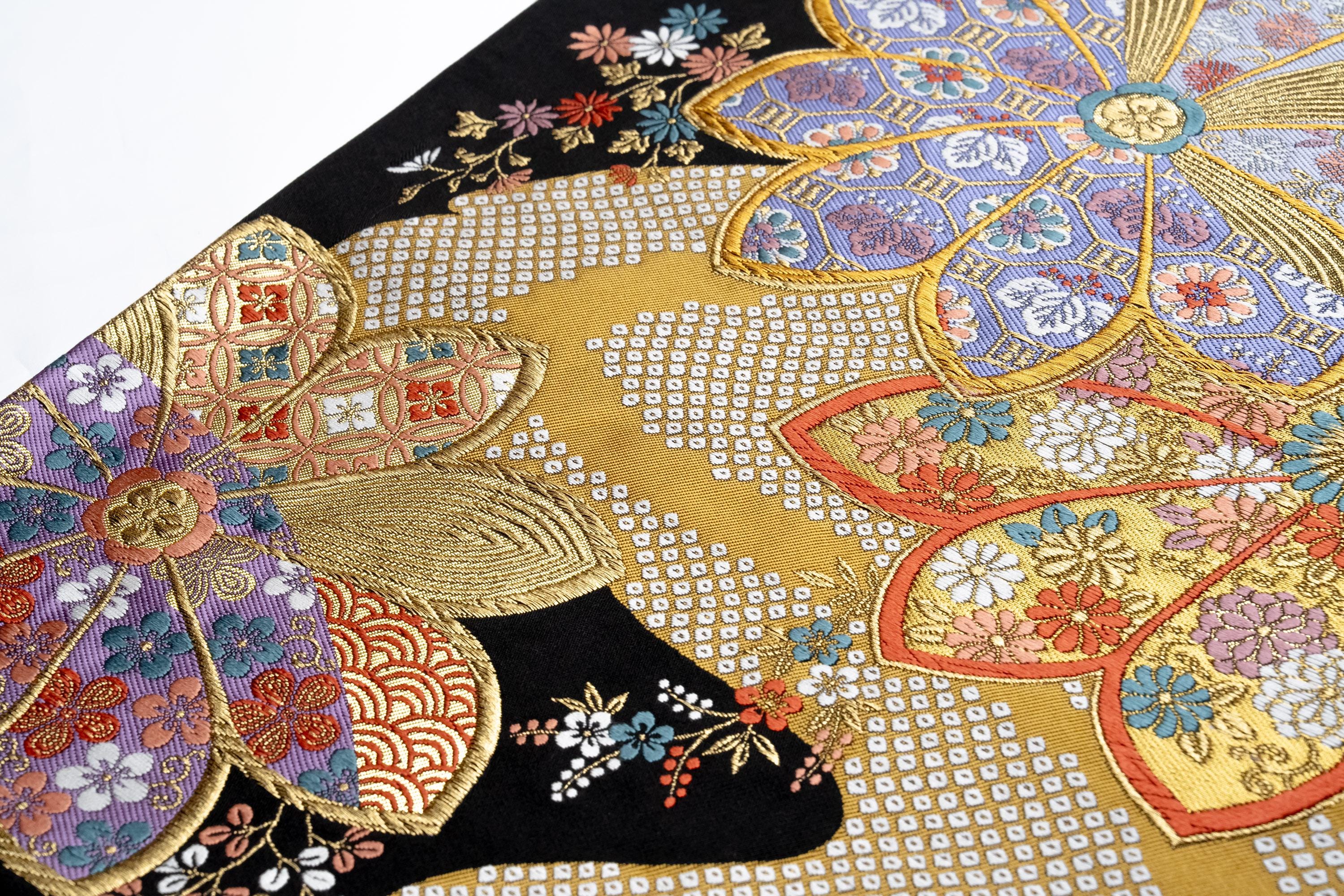 Fukuro Obi is a full-size sash belt that wraps around the torso in women's formal Kimono wearing. It is wider, longer and heavier than other informal Obis and serves the purpose of keeping the Kimono front closed securely, drawing up excess fabric to adjust the length of Kimono, and decorative expressions.