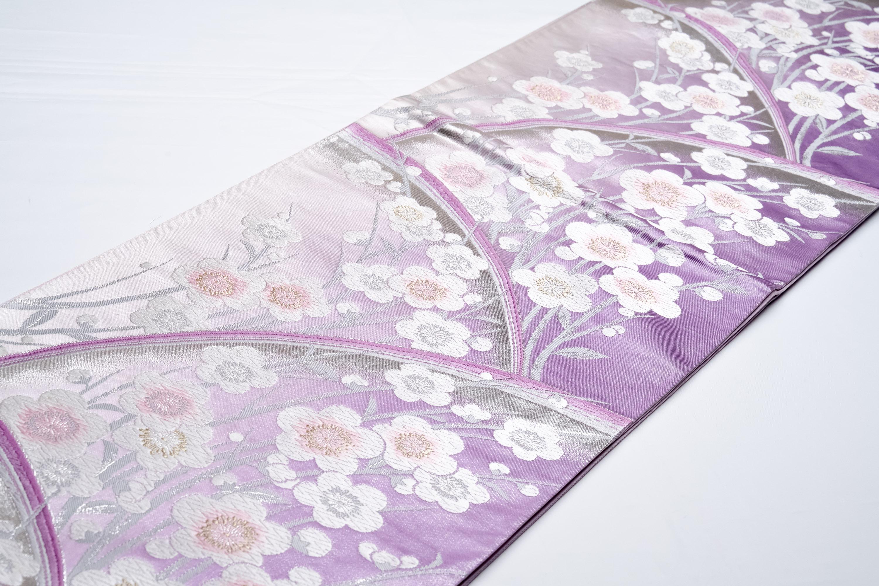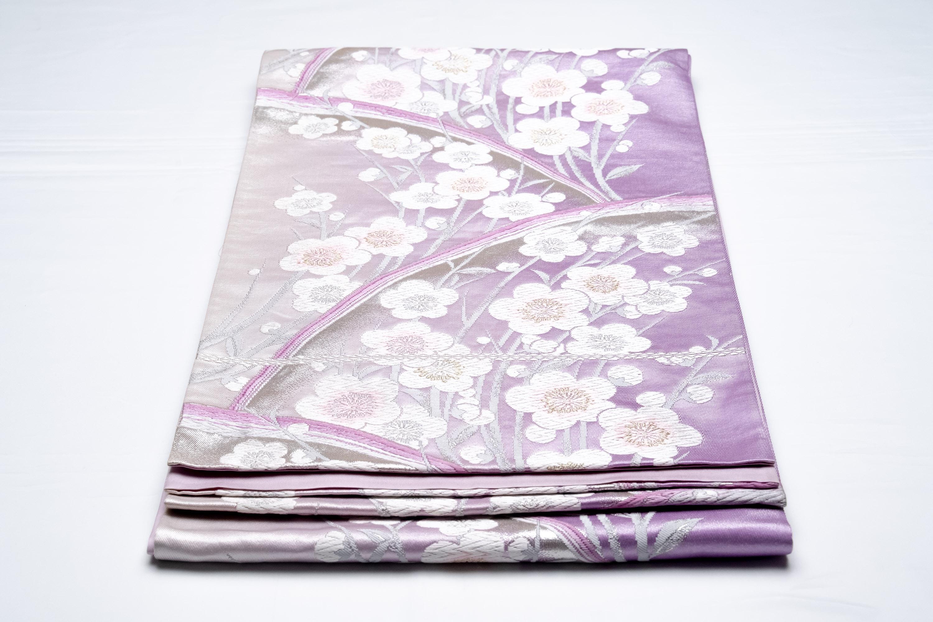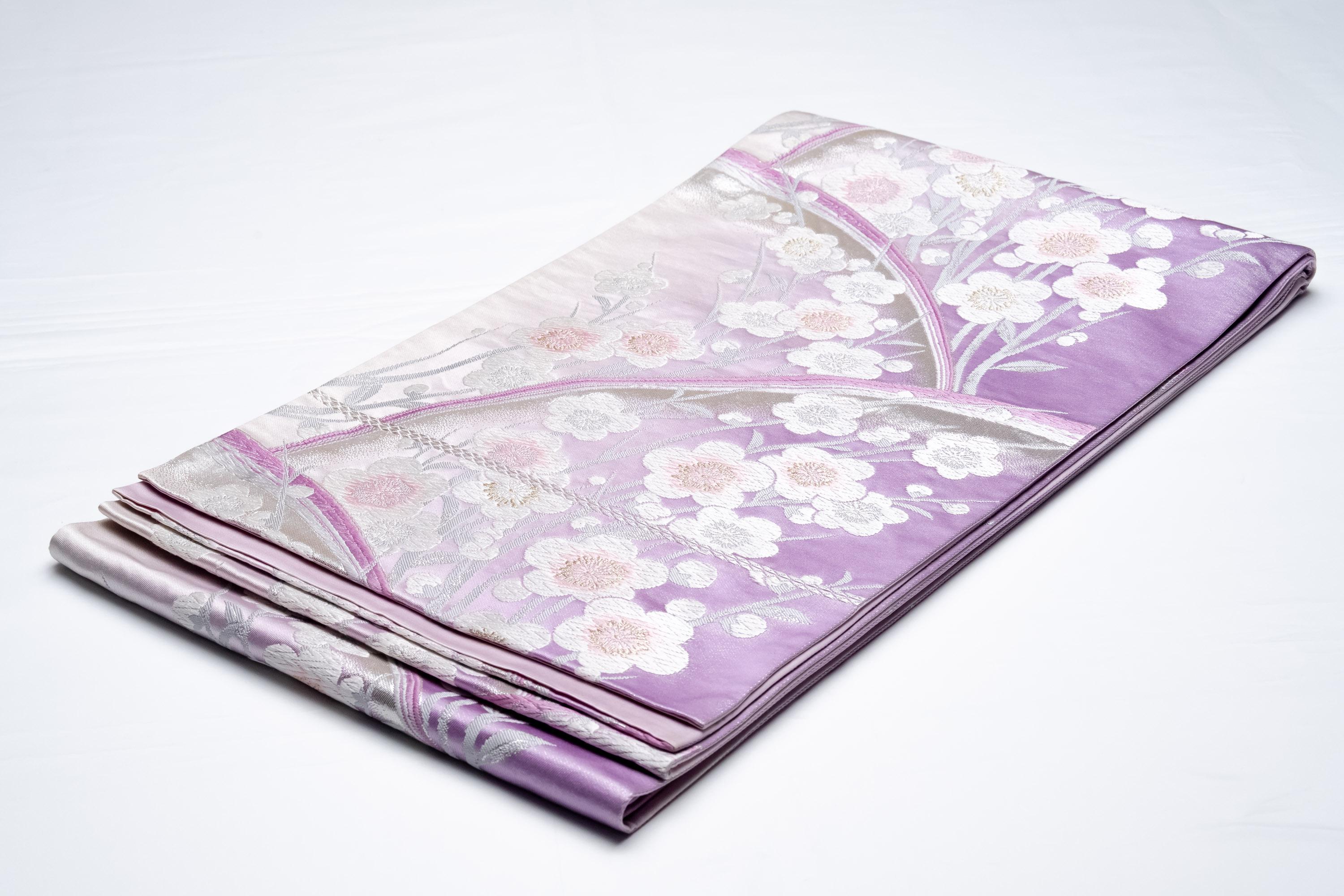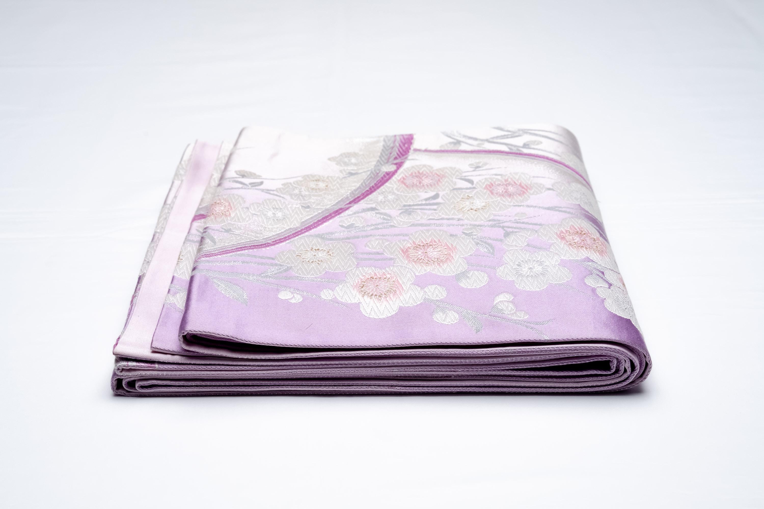 Fukuro Obi is a full-size sash belt that wraps around the torso in women's formal Kimono wearing. It is wider, longer and heavier than other informal Obis and serves the purpose of keeping the Kimono front closed securely, drawing up excess fabric to adjust the length of Kimono, and decorative expressions.