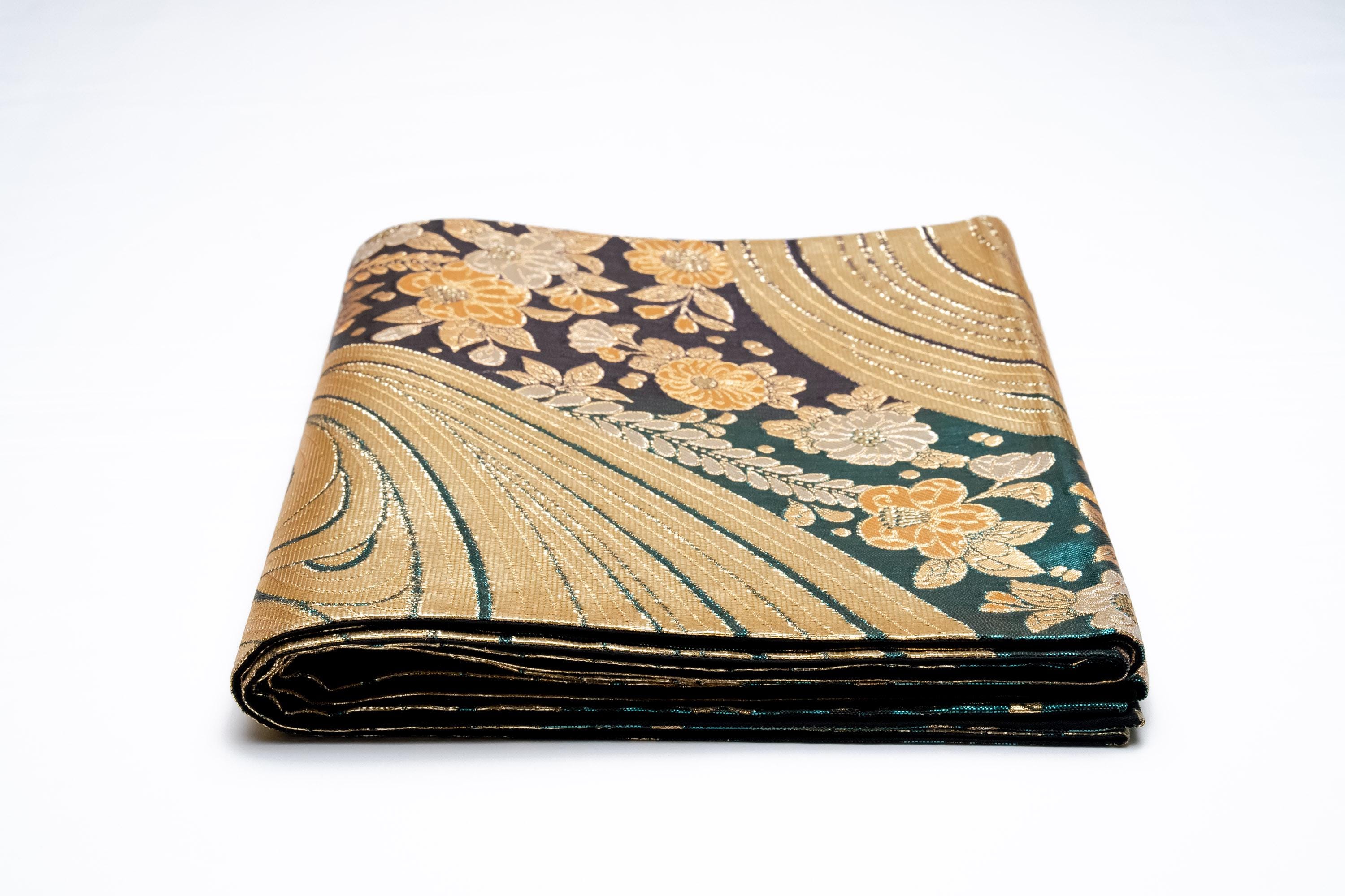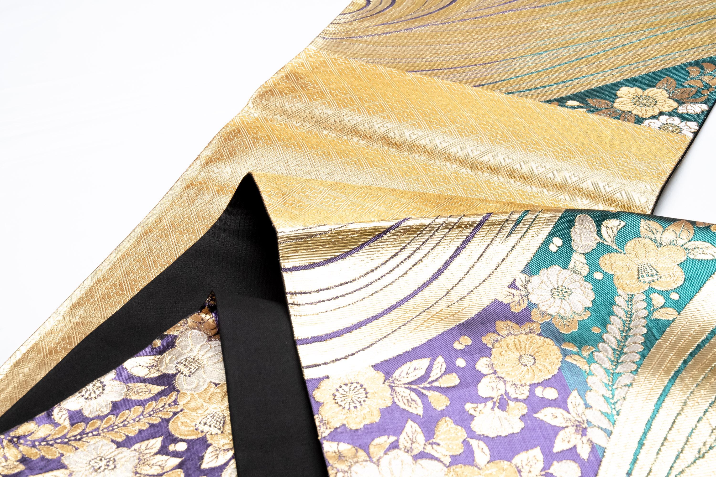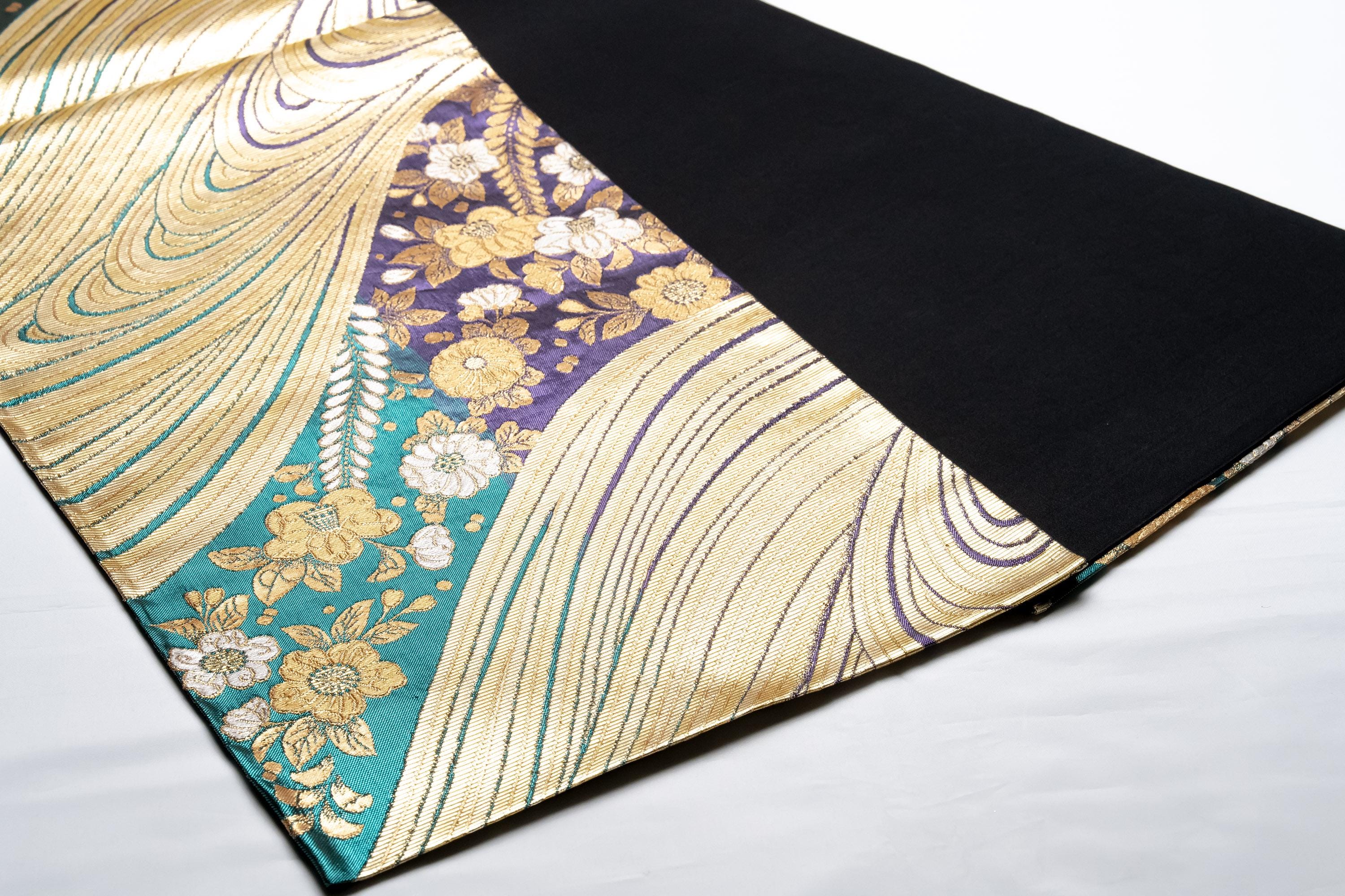 Fukuro Obi is a full-size sash belt that wraps around the torso in women's formal Kimono wearing. It is wider, longer and heavier than other informal Obis and serves the purpose of keeping the Kimono front closed securely, drawing up excess fabric to adjust the length of Kimono, and decorative expressions.