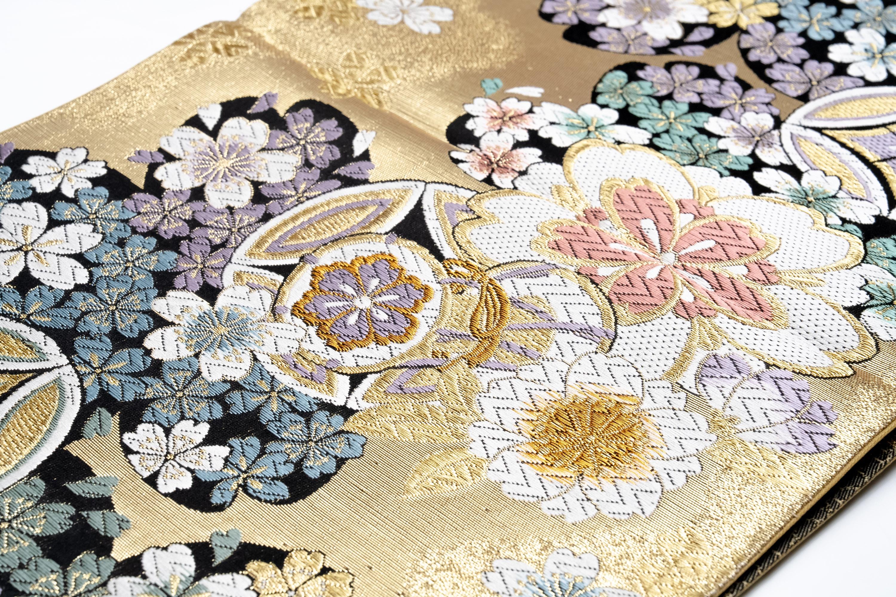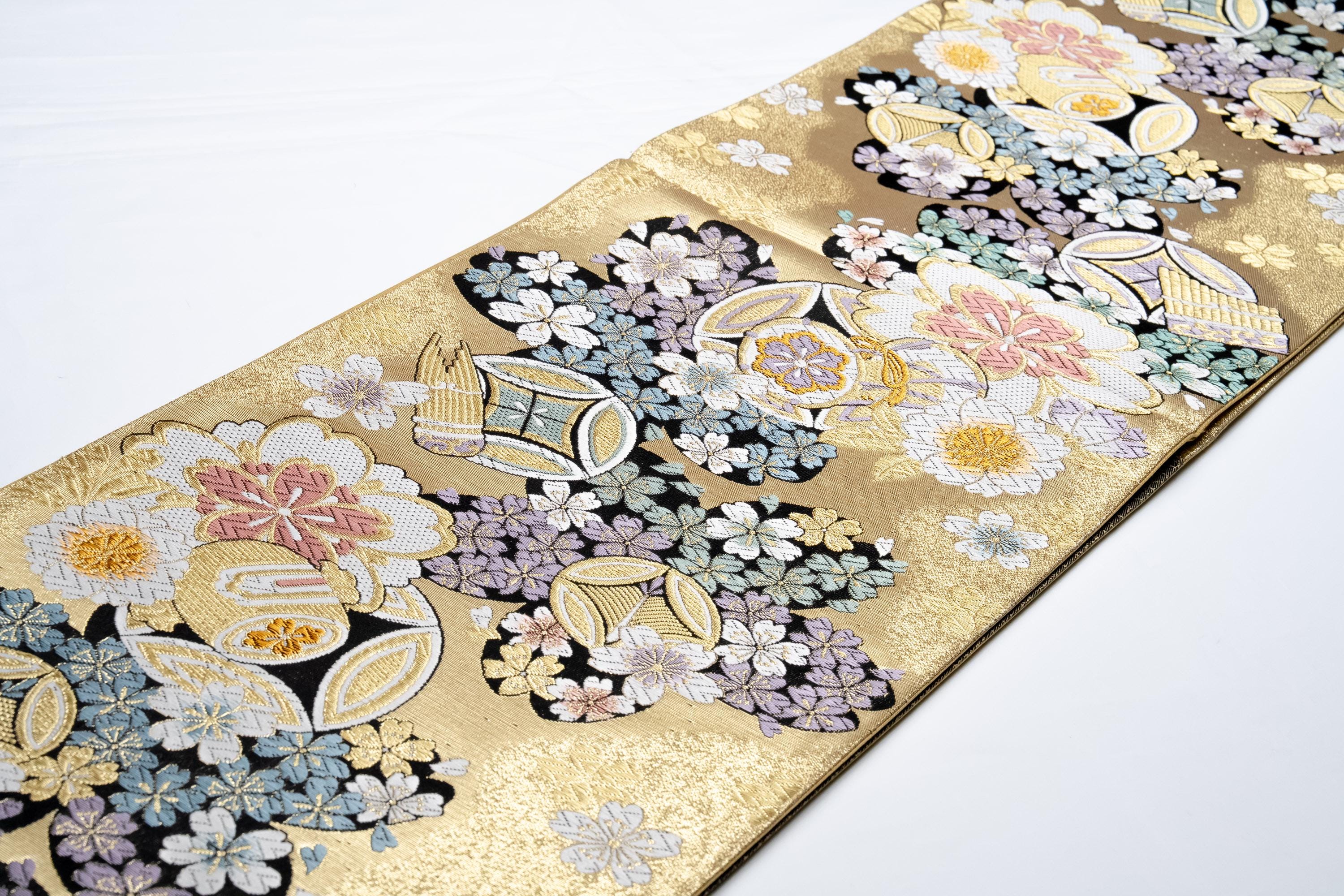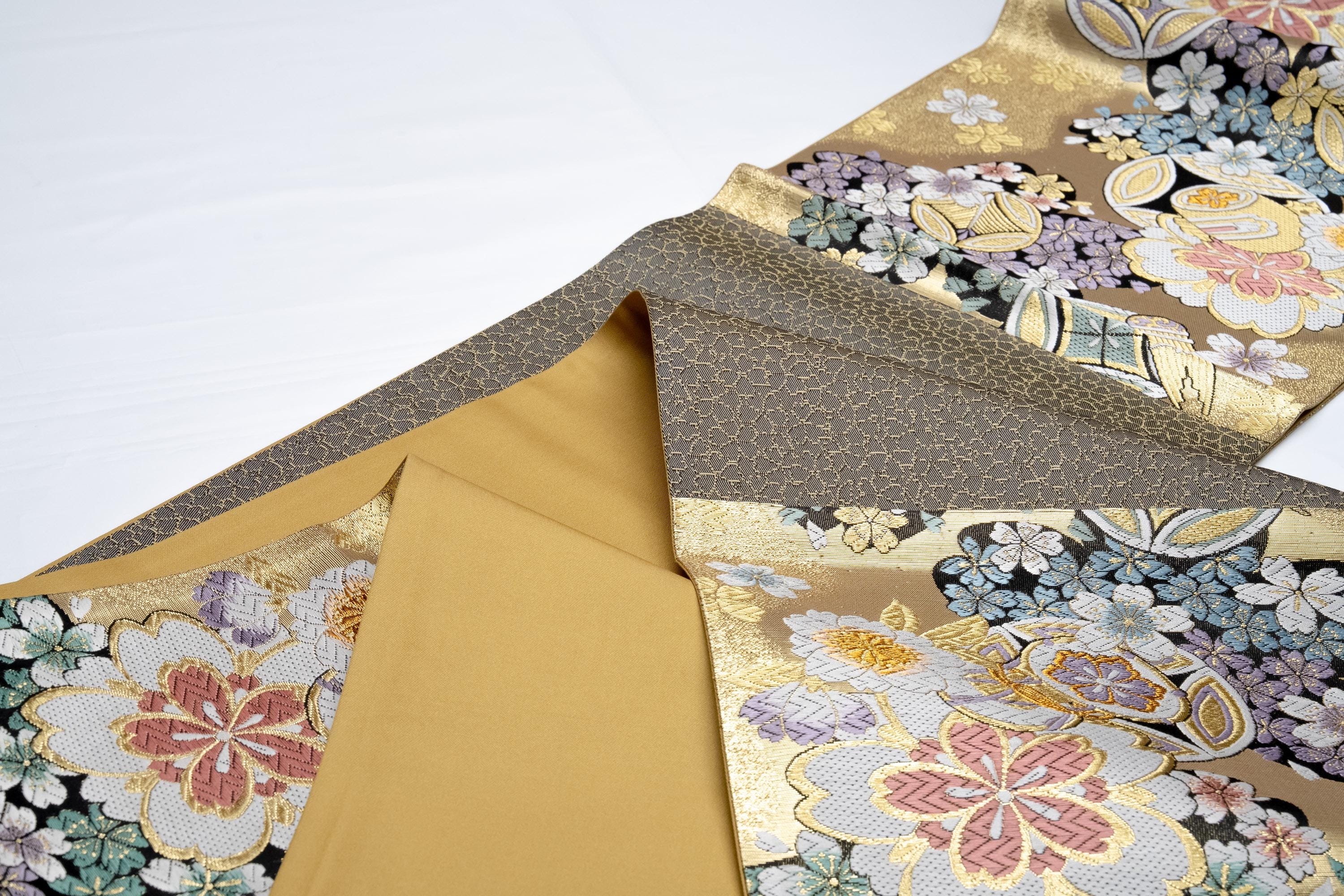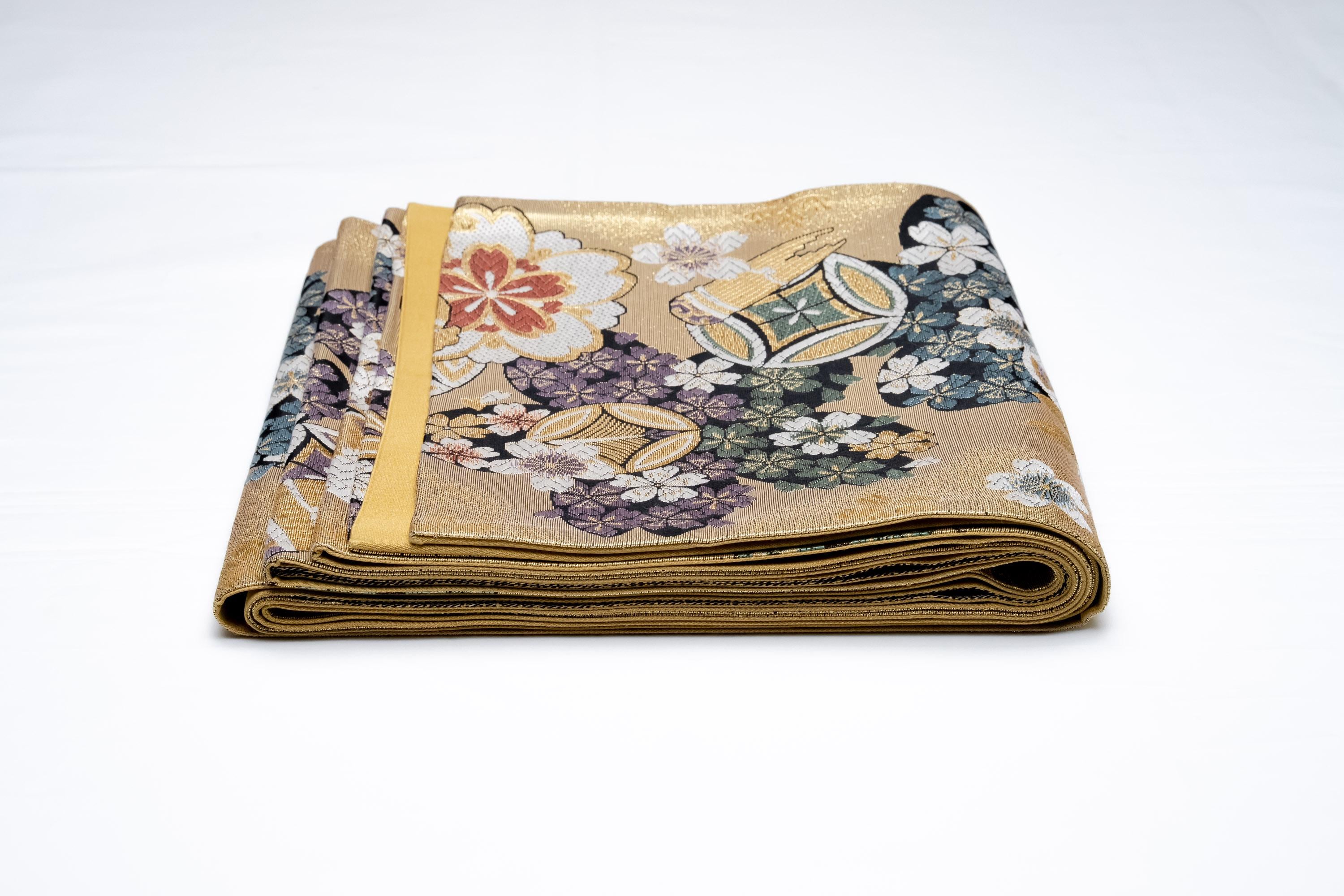 Fukuro Obi is a full-size sash belt that wraps around the torso in women's formal Kimono wearing. It is wider, longer and heavier than other informal Obis and serves the purpose of keeping the Kimono front closed securely, drawing up excess fabric to adjust the length of Kimono, and decorative expressions.