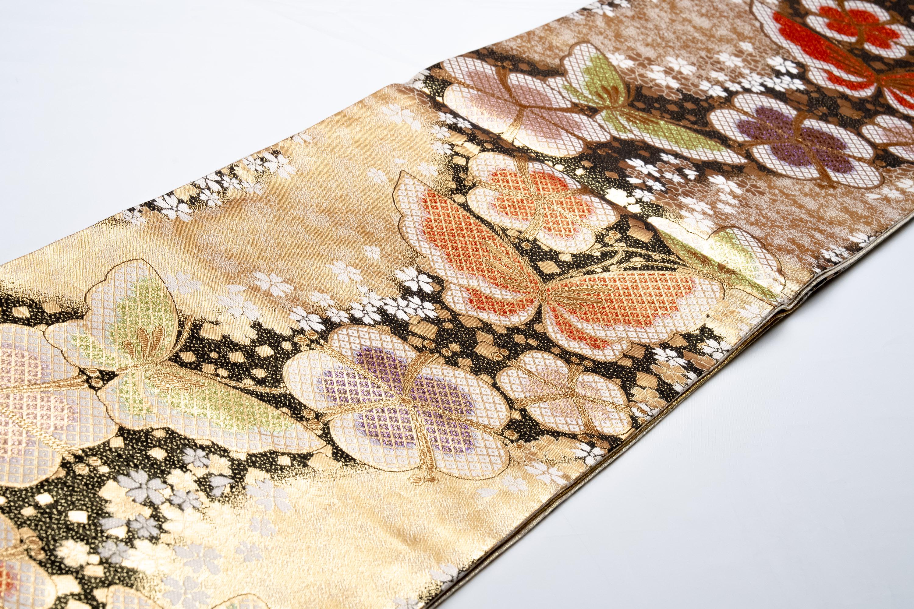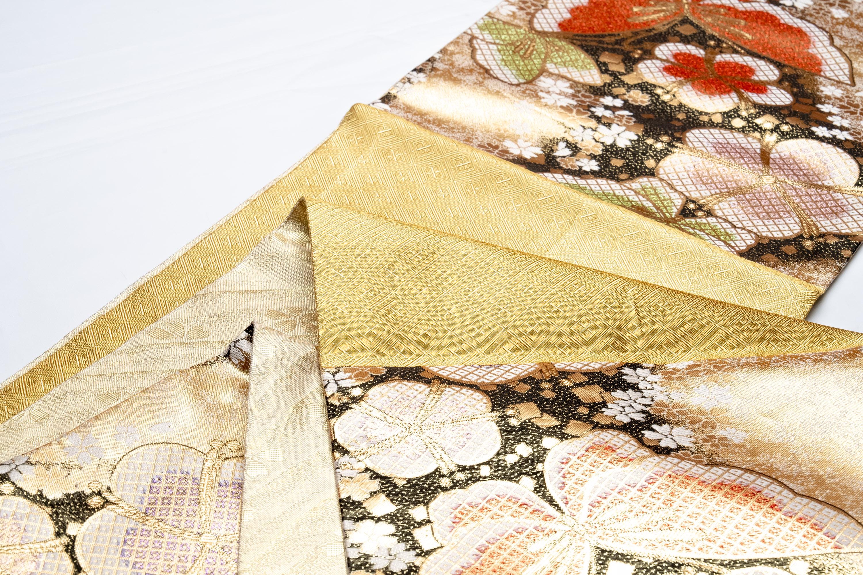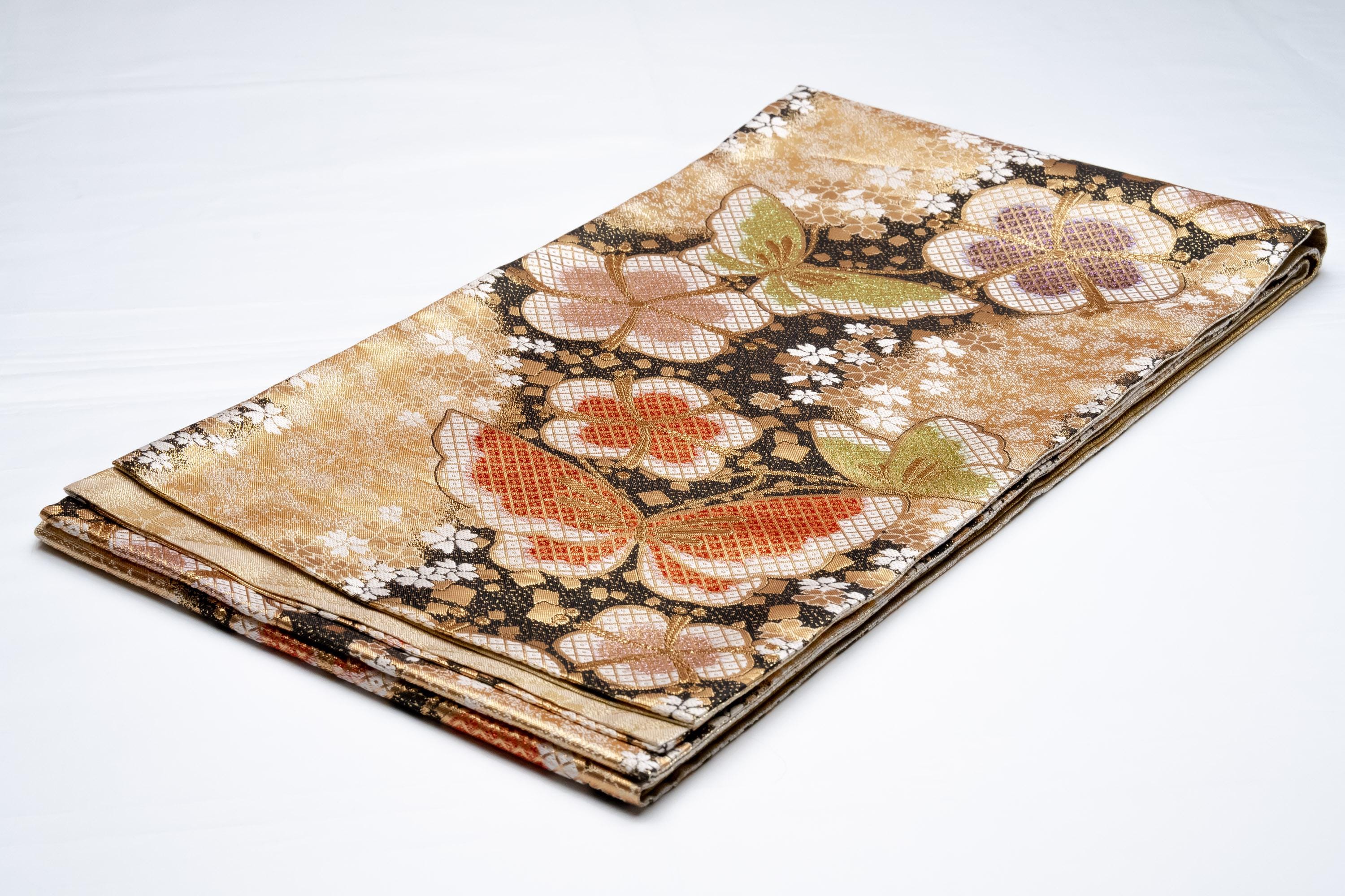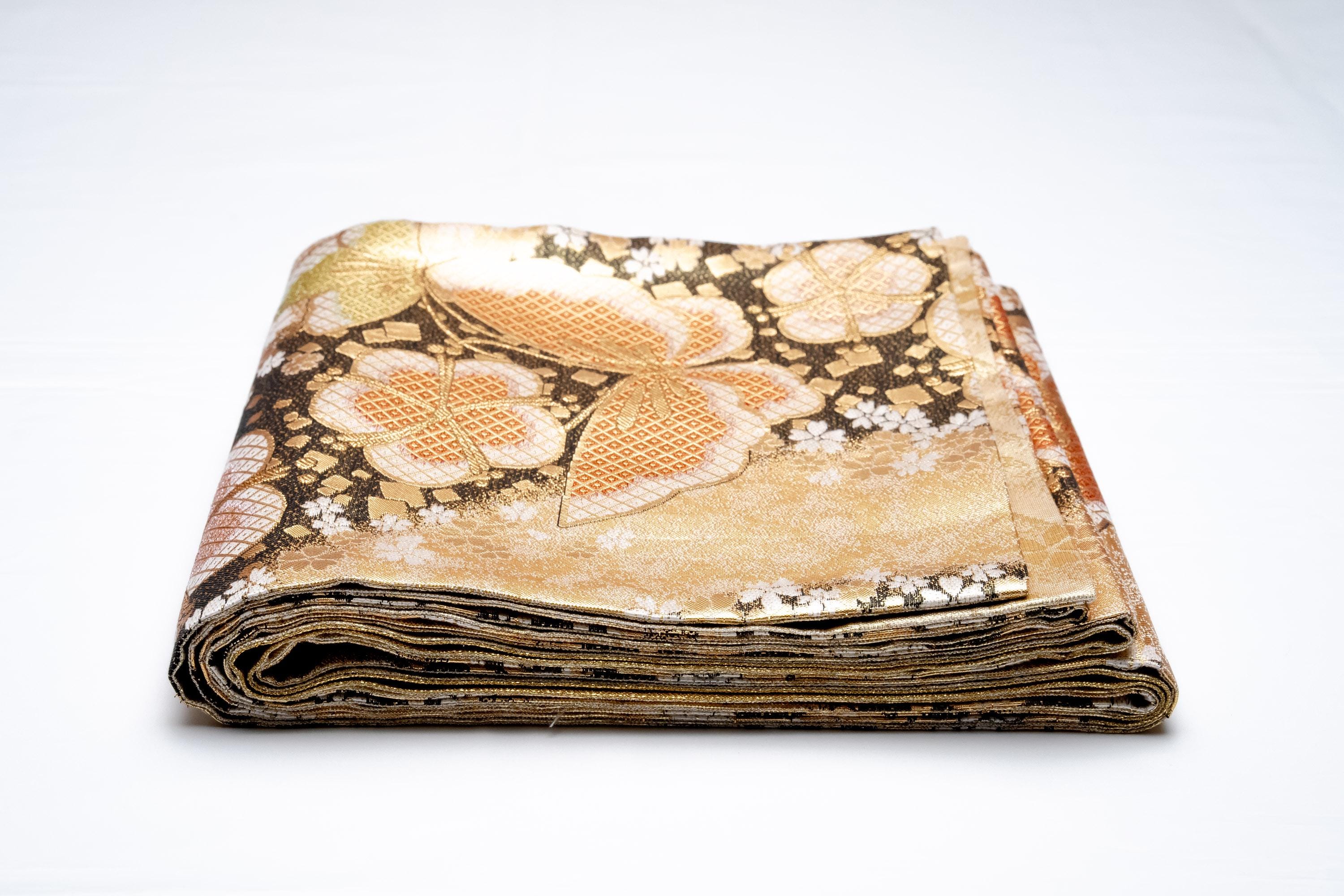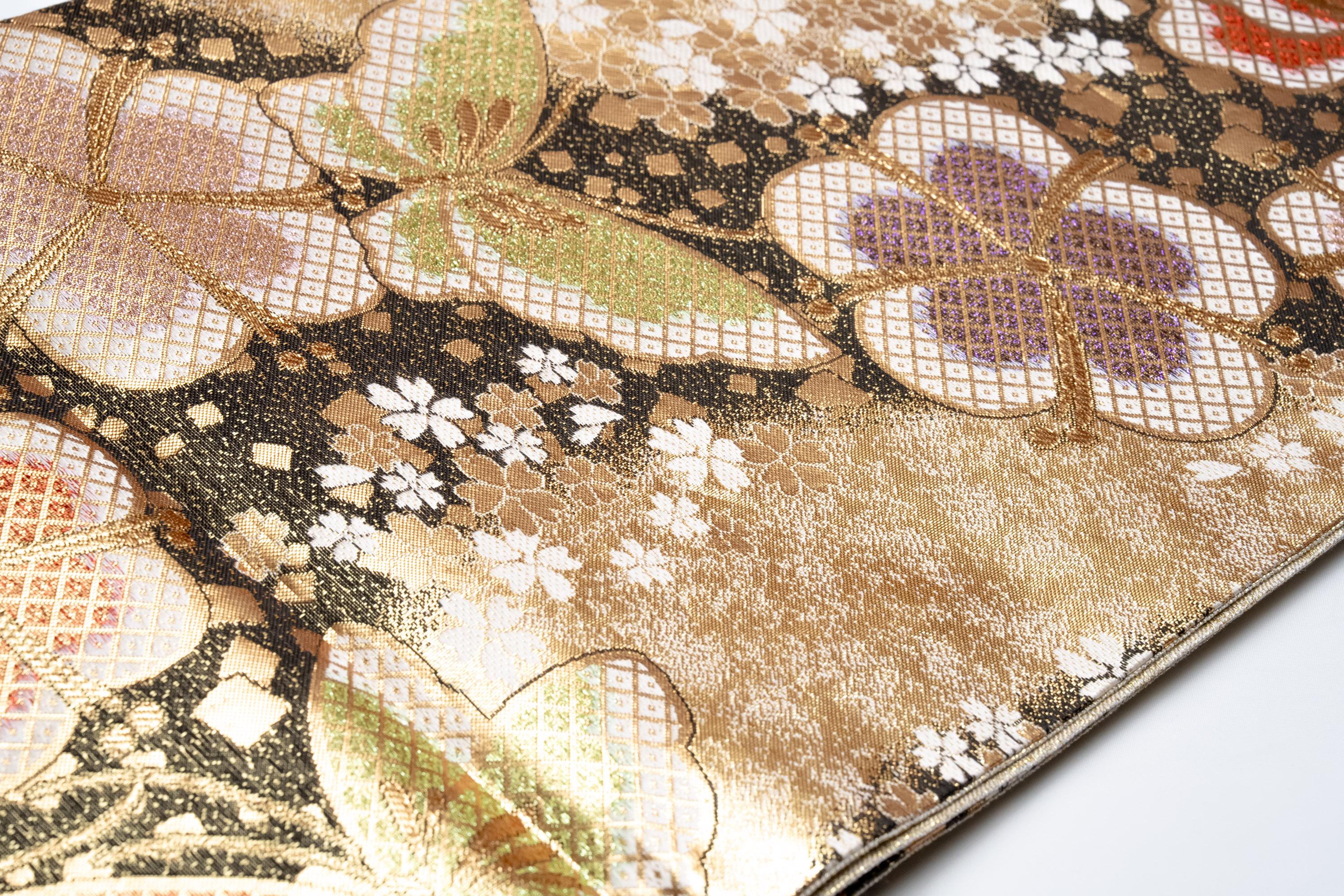 Fukuro Obi is a full-size sash belt that wraps around the torso in women's formal Kimono wearing. It is wider, longer and heavier than other informal Obis and serves the purpose of keeping the Kimono front closed securely, drawing up excess fabric to adjust the length of Kimono, and decorative expressions.