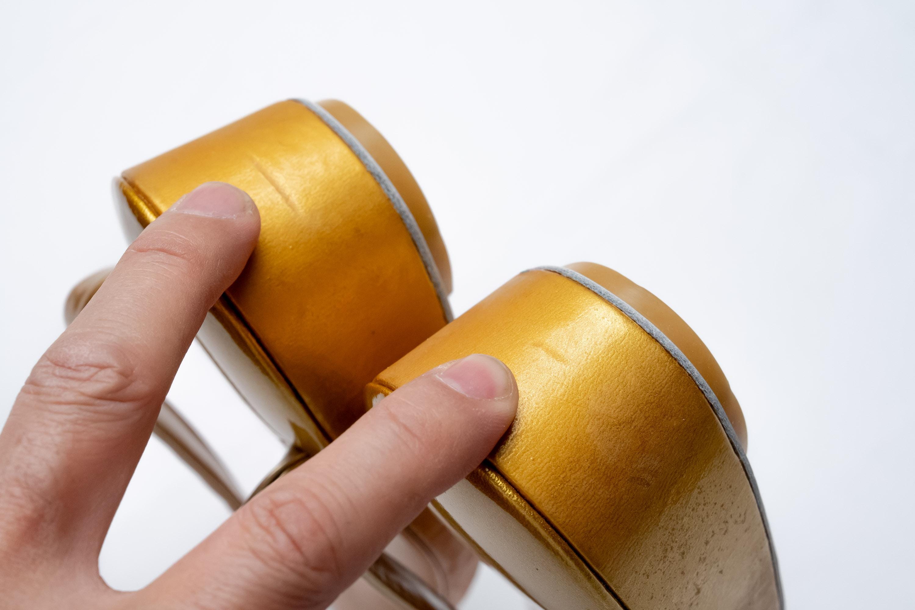 BLEMISHES: Side walls of the soles have some rubbing marks and unknown line marks. Heels have dents.
