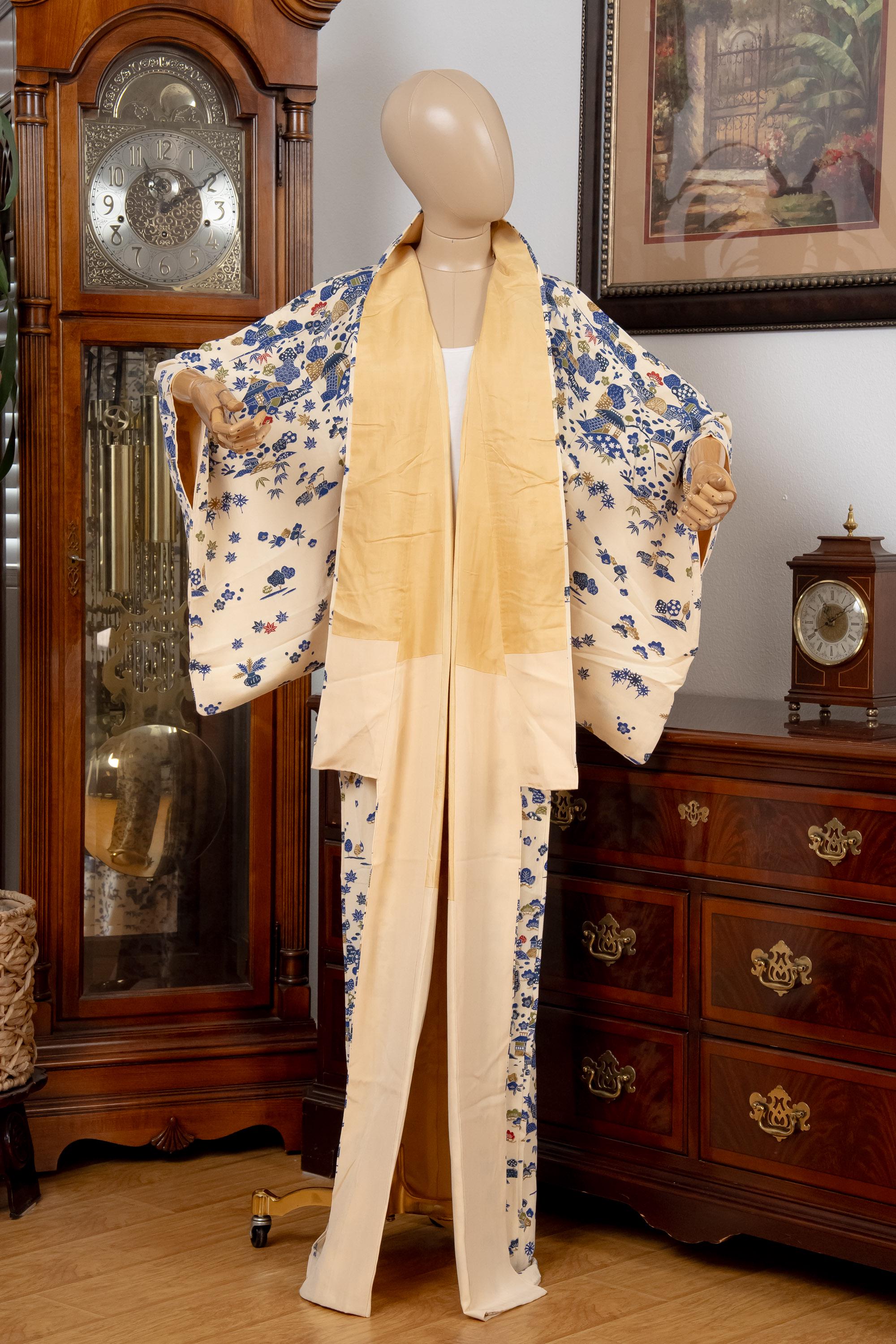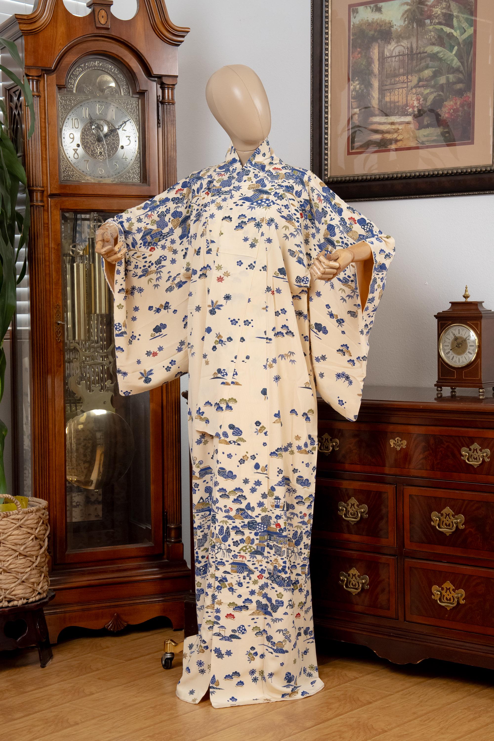 Please keep in mind that female Kimonos are supposed to fit long. You will need to adjust the length to your size by tying with Kitsuke accessories and Obi belt.