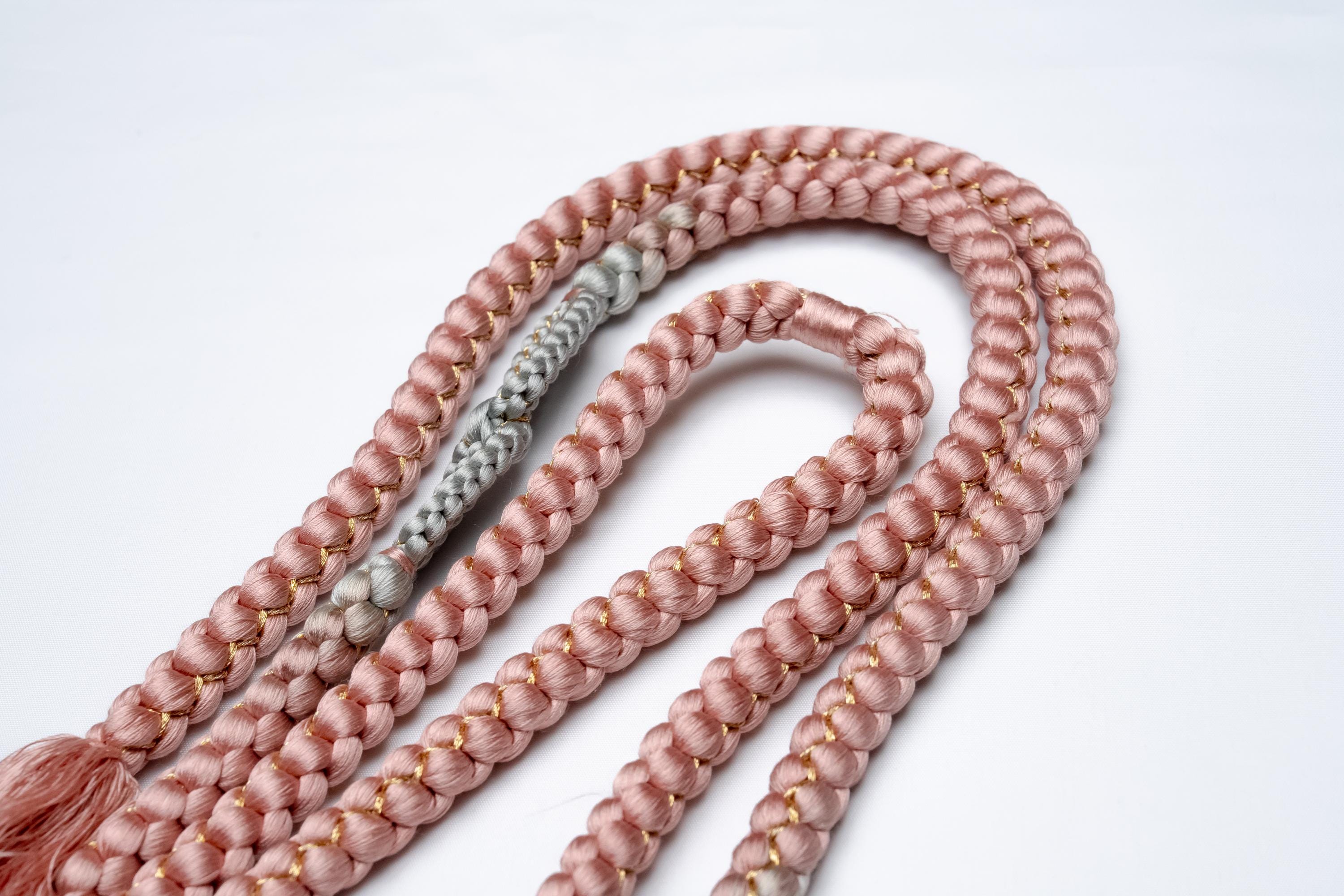 Obijime is one of the essentials in wearing women's Kimonos. Obijime is a fastener string used to hold Kimono Obi in place by tying over it. It's also called Obijime cord. Obijime can be found in different widths and lengths. In general, they are about 1 cm thick and are about 150 cm in length.