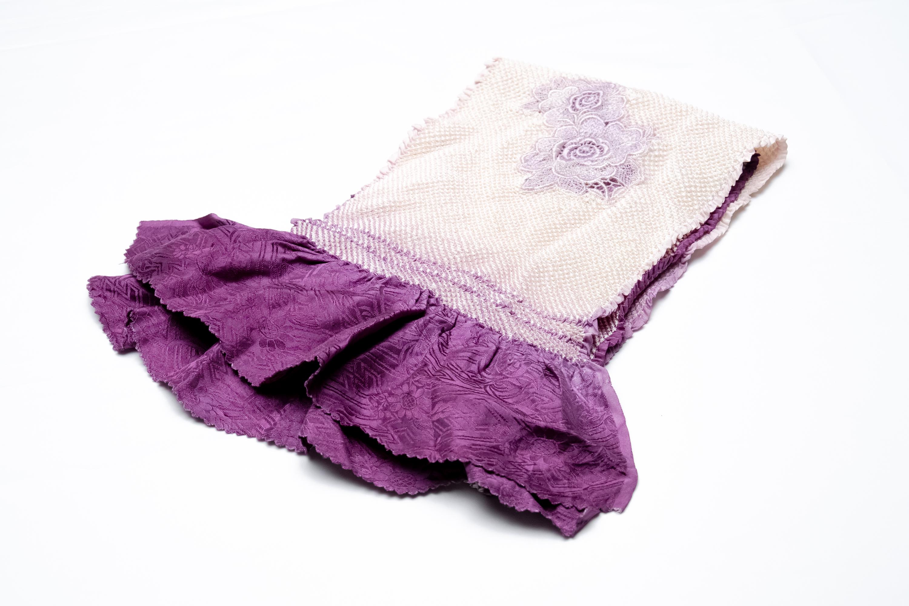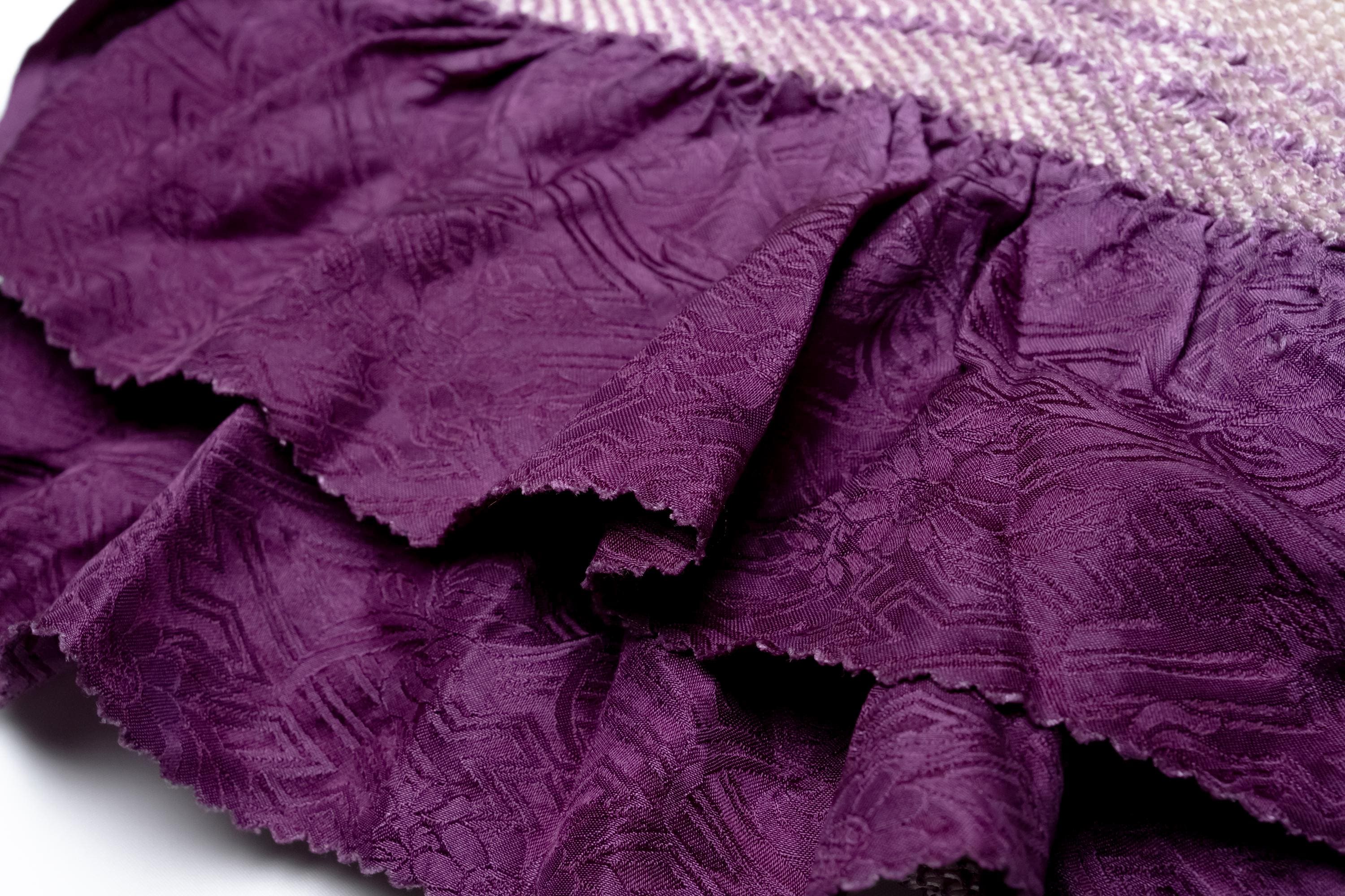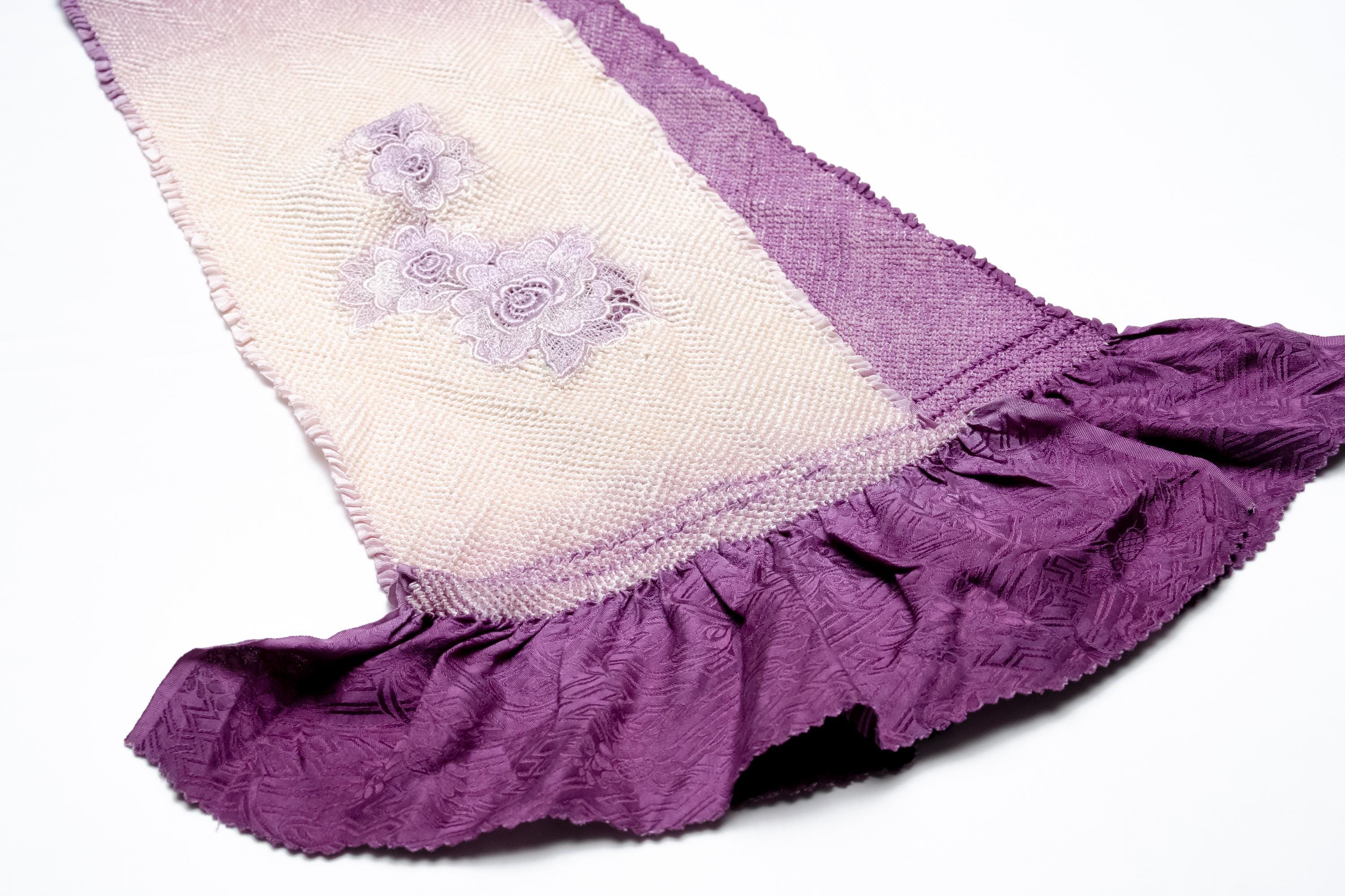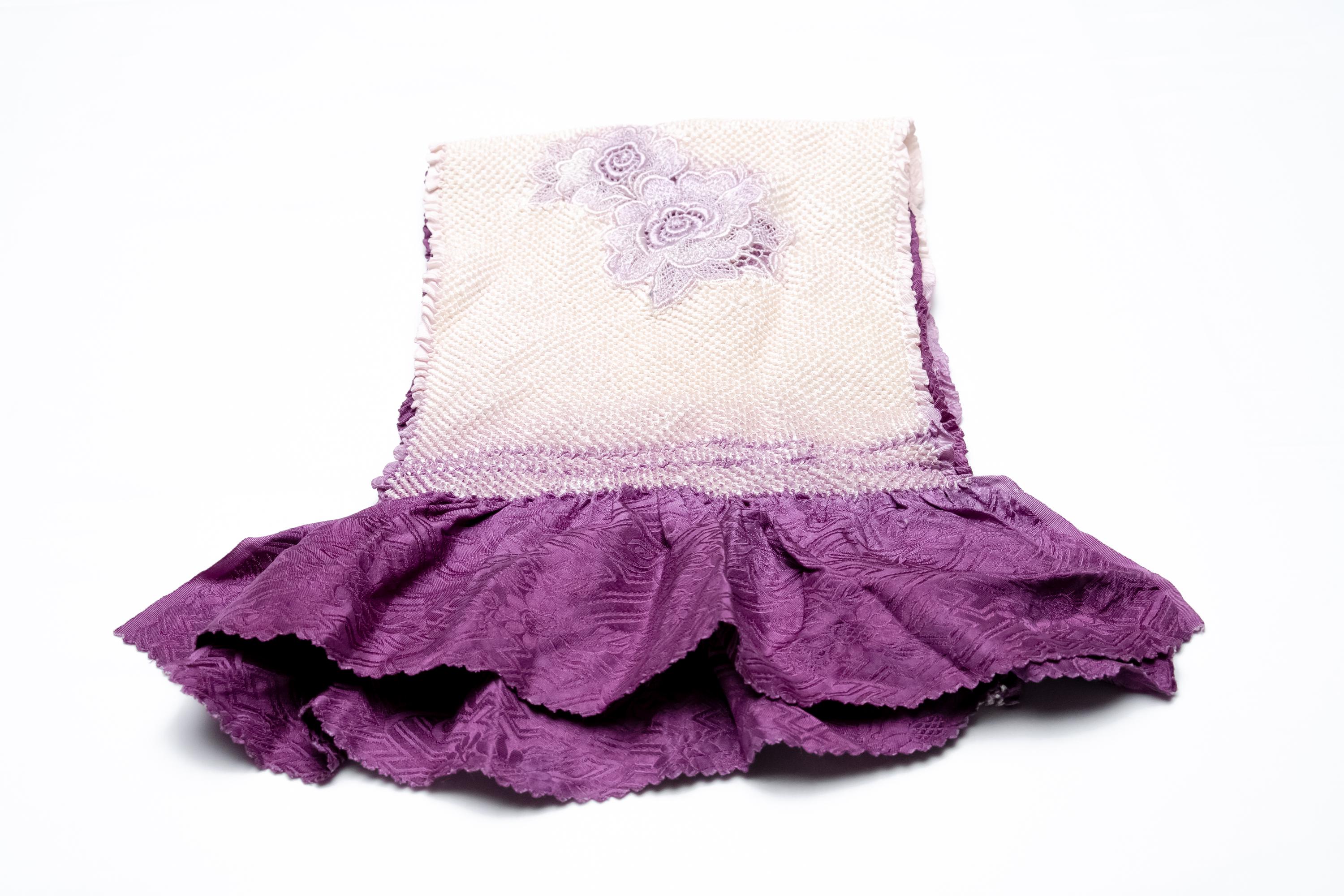 Obiage is a decorative and functional elastic fabric that is being worn above the Obi. It serves the purpose of covering/keeping ObiMakura in place and helping to secure the upper part of Obi knot. Obiage are broadly divided into two different looks/characteristics, a thin scarf-like flat fabric type which are then subdivided into Rinzu, Chirimen, Kinsha and Mofuku, and a thicker scrunchy-like more elastic fabric type which is Shibori.
