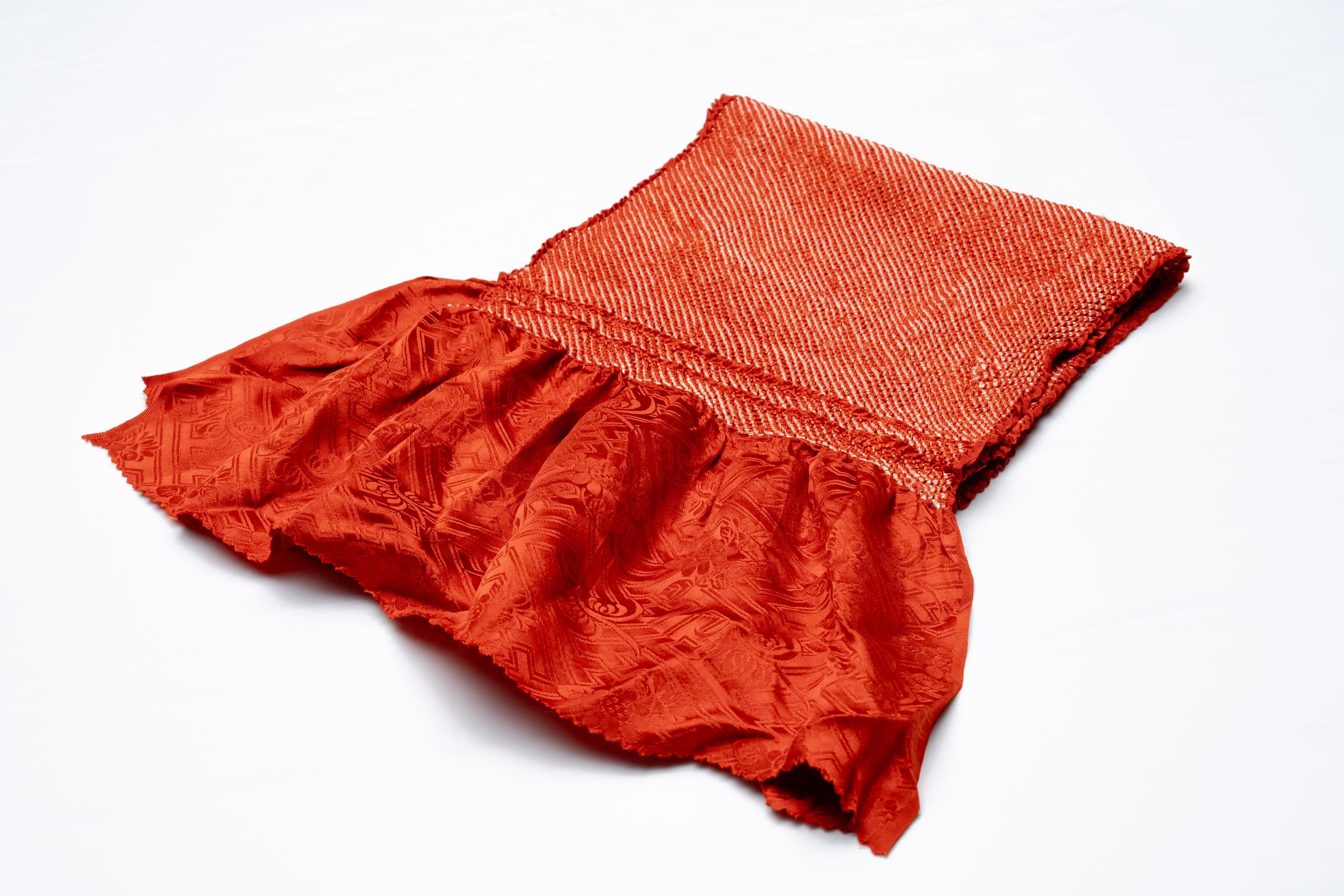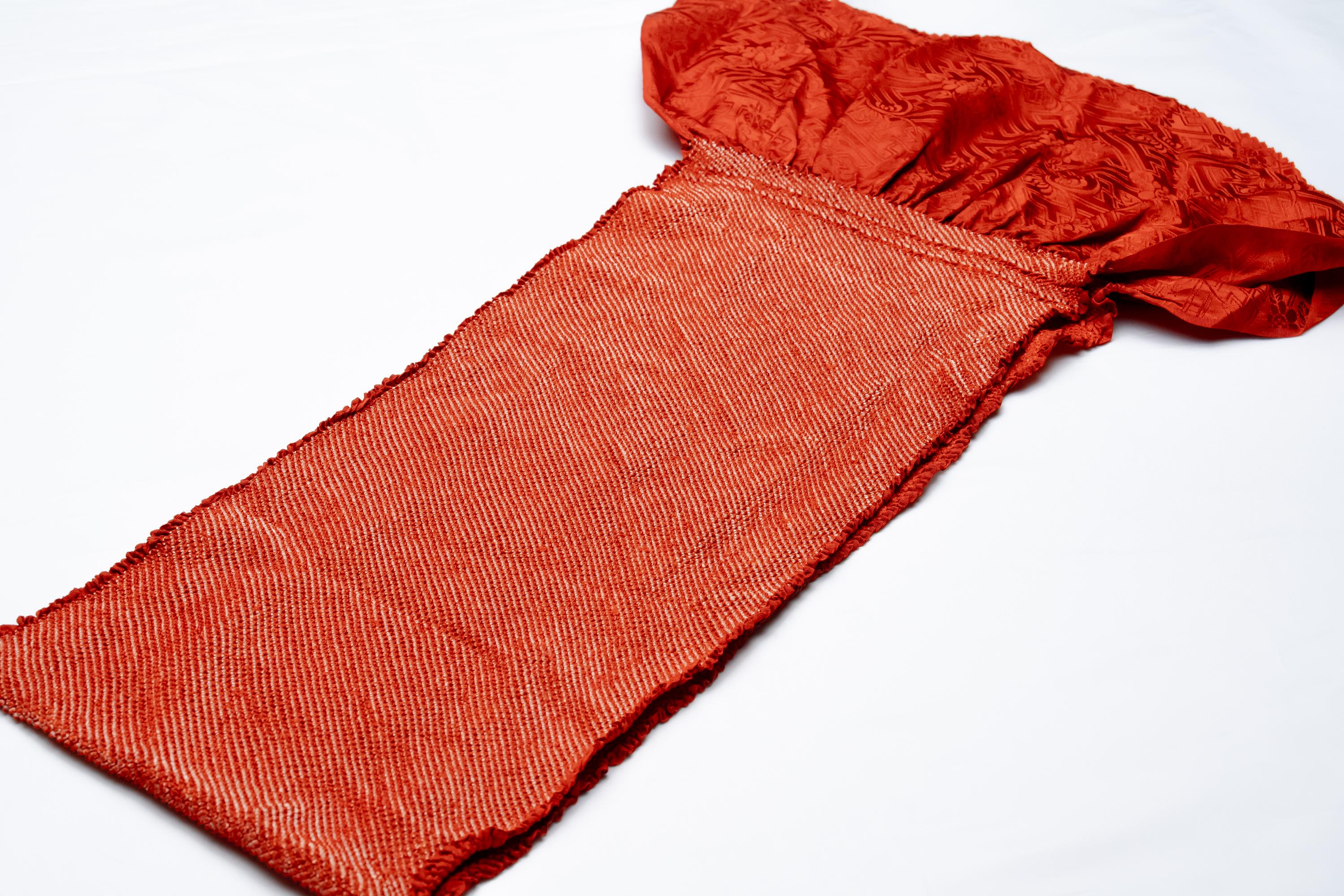 Obiage is a decorative and functional elastic fabric that is being worn above the Obi. It serves the purpose of covering/keeping ObiMakura in place and helping to secure the upper part of Obi knot. Obiage are broadly divided into two different looks/characteristics, a thin scarf-like flat fabric type which are then subdivided into Rinzu, Chirimen, Kinsha and Mofuku, and a thicker scrunchy-like more elastic fabric type which is Shibori.