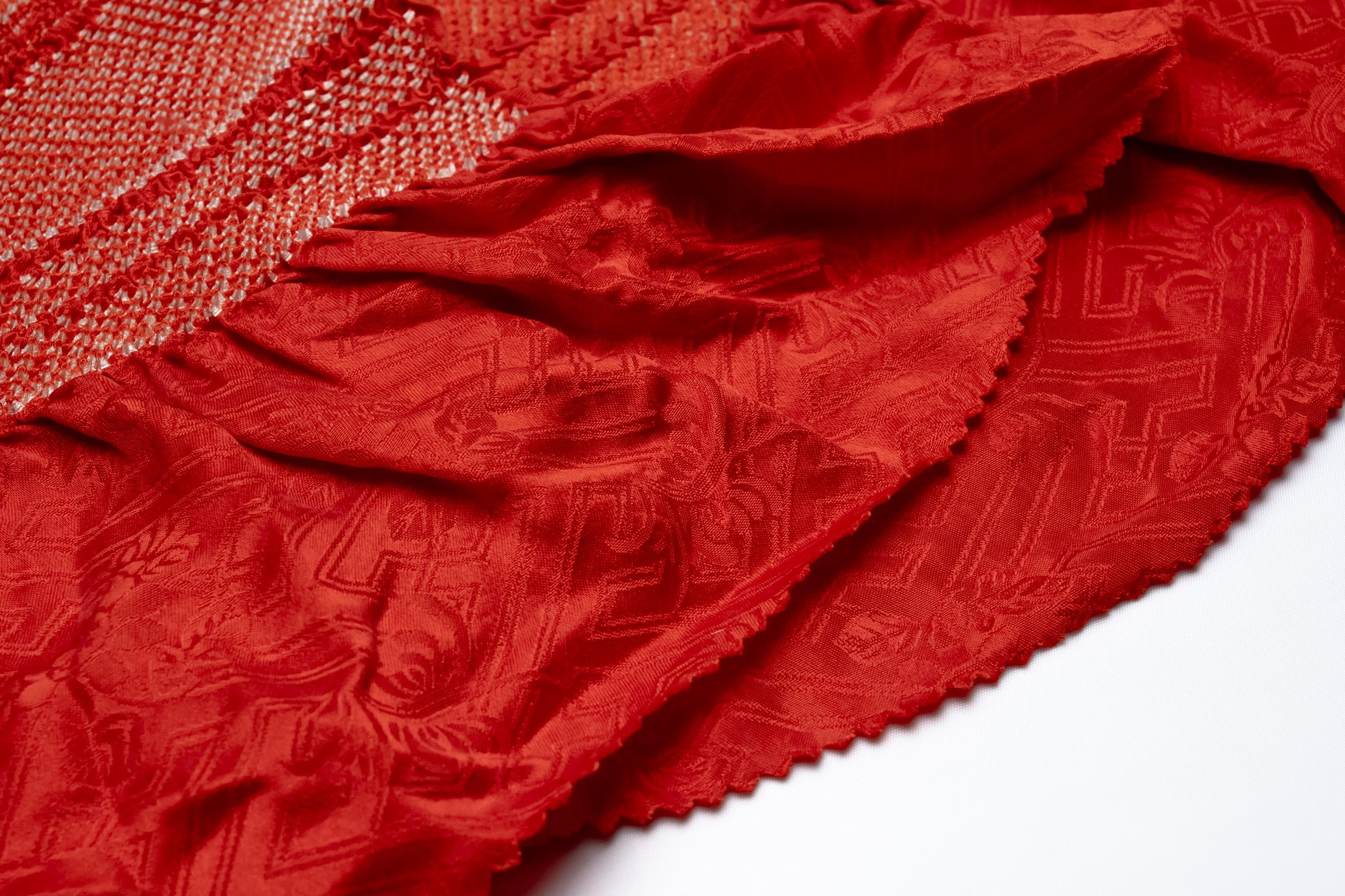 Obiage is a decorative and functional elastic fabric that is being worn above the Obi. It serves the purpose of covering/keeping ObiMakura in place and helping to secure the upper part of Obi knot. Obiage are broadly divided into two different looks/characteristics, a thin scarf-like flat fabric type which are then subdivided into Rinzu, Chirimen, Kinsha and Mofuku, and a thicker scrunchy-like more elastic fabric type which is Shibori.
