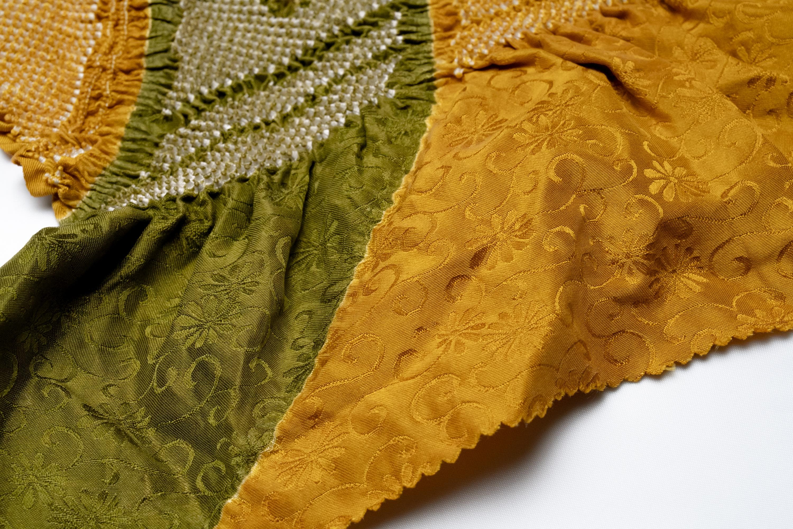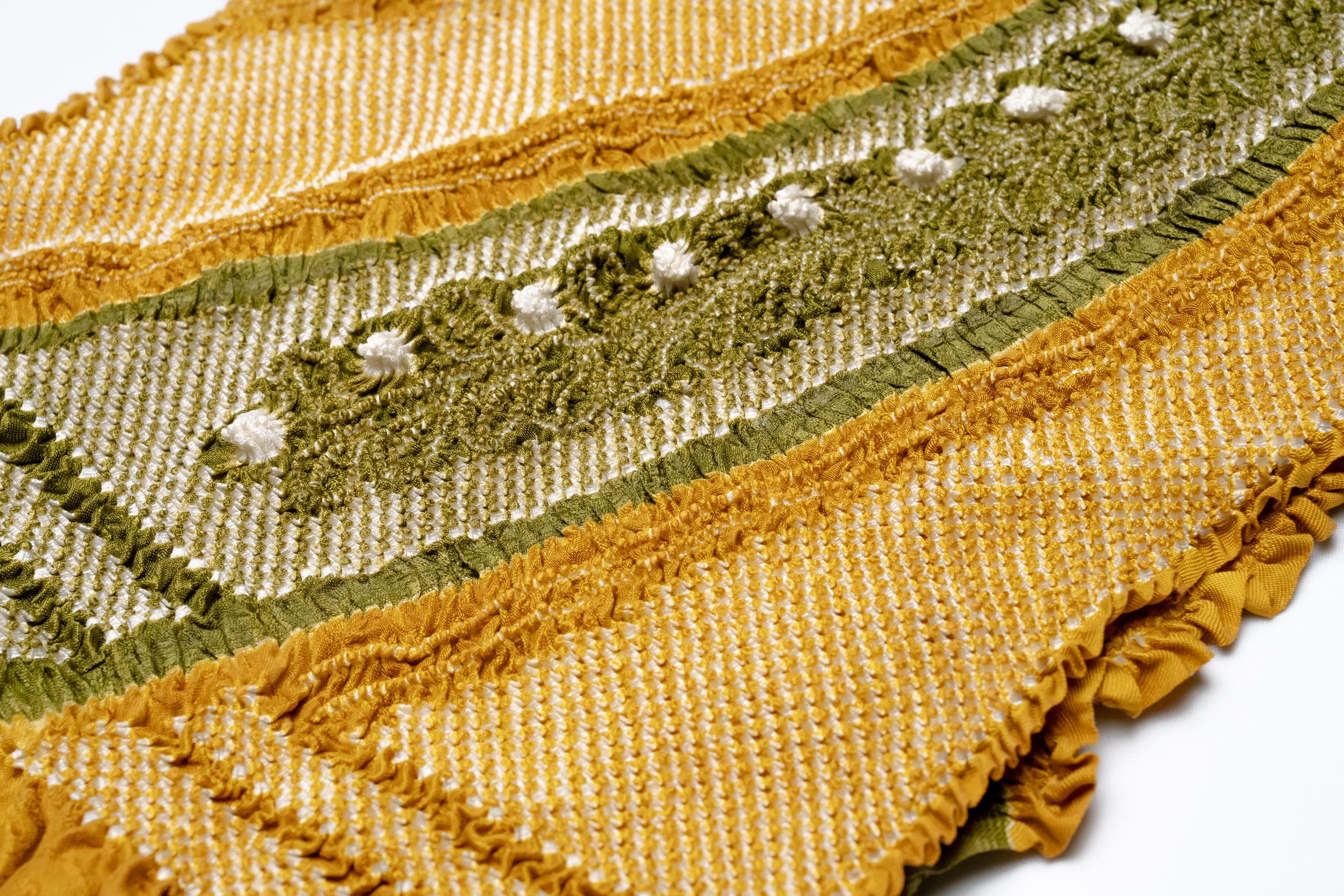 Obiage is a decorative and functional elastic fabric that is being worn above the Obi. It serves the purpose of covering/keeping ObiMakura in place and helping to secure the upper part of Obi knot. Obiage are broadly divided into two different looks/characteristics, a thin scarf-like flat fabric type which are then subdivided into Rinzu, Chirimen, Kinsha and Mofuku, and a thicker scrunchy-like more elastic fabric type which is Shibori.