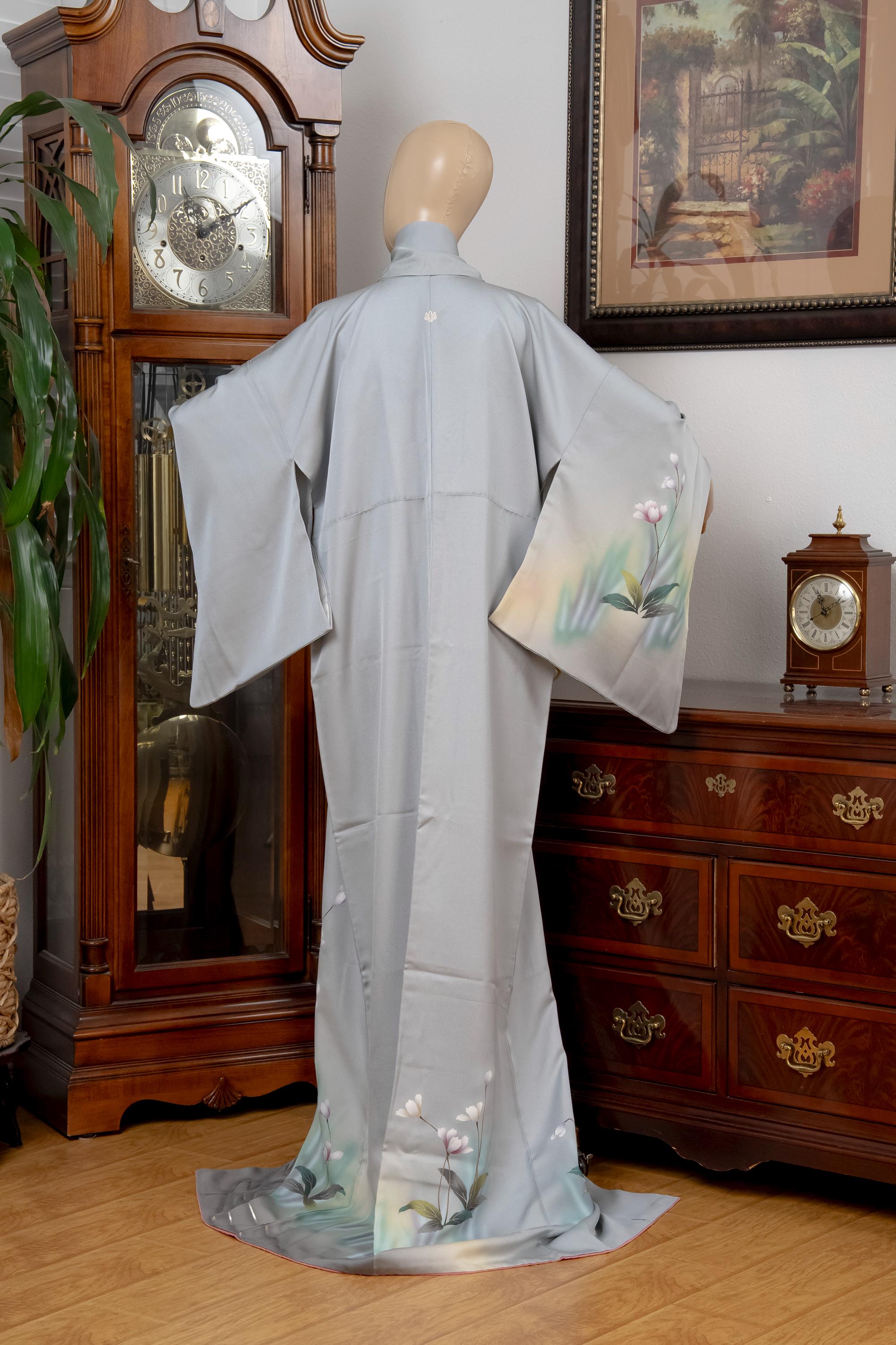 Tomesode is the most formal, high class Kimono for all ceremonies and occasions. Black ones are worn by married women and colored ones are worn by both married and unmarried women. Distinct characteristics of Tomesode are family crests and surrounding patterns around the hem. Numbers of family crests specify formality and rank.