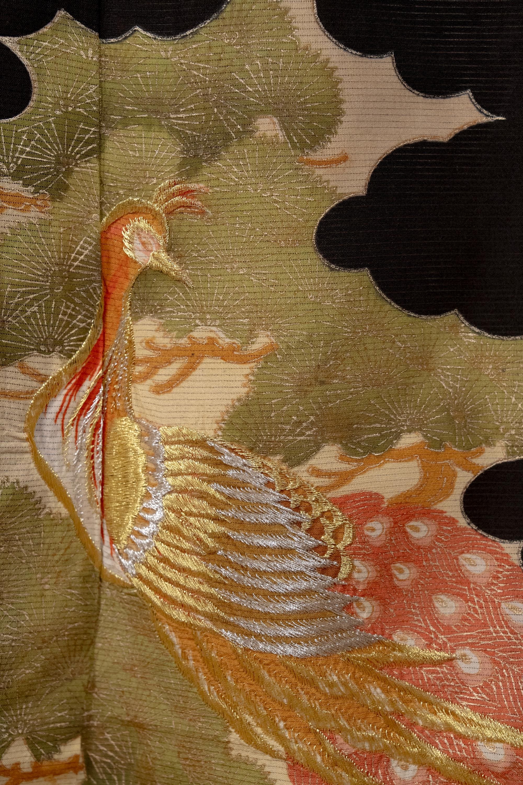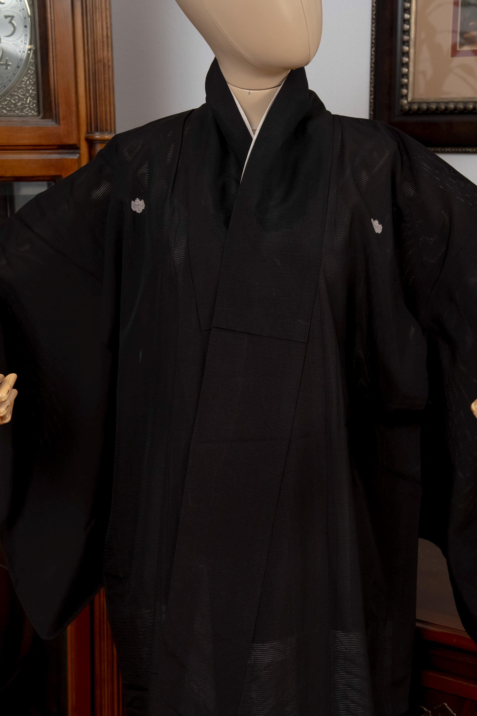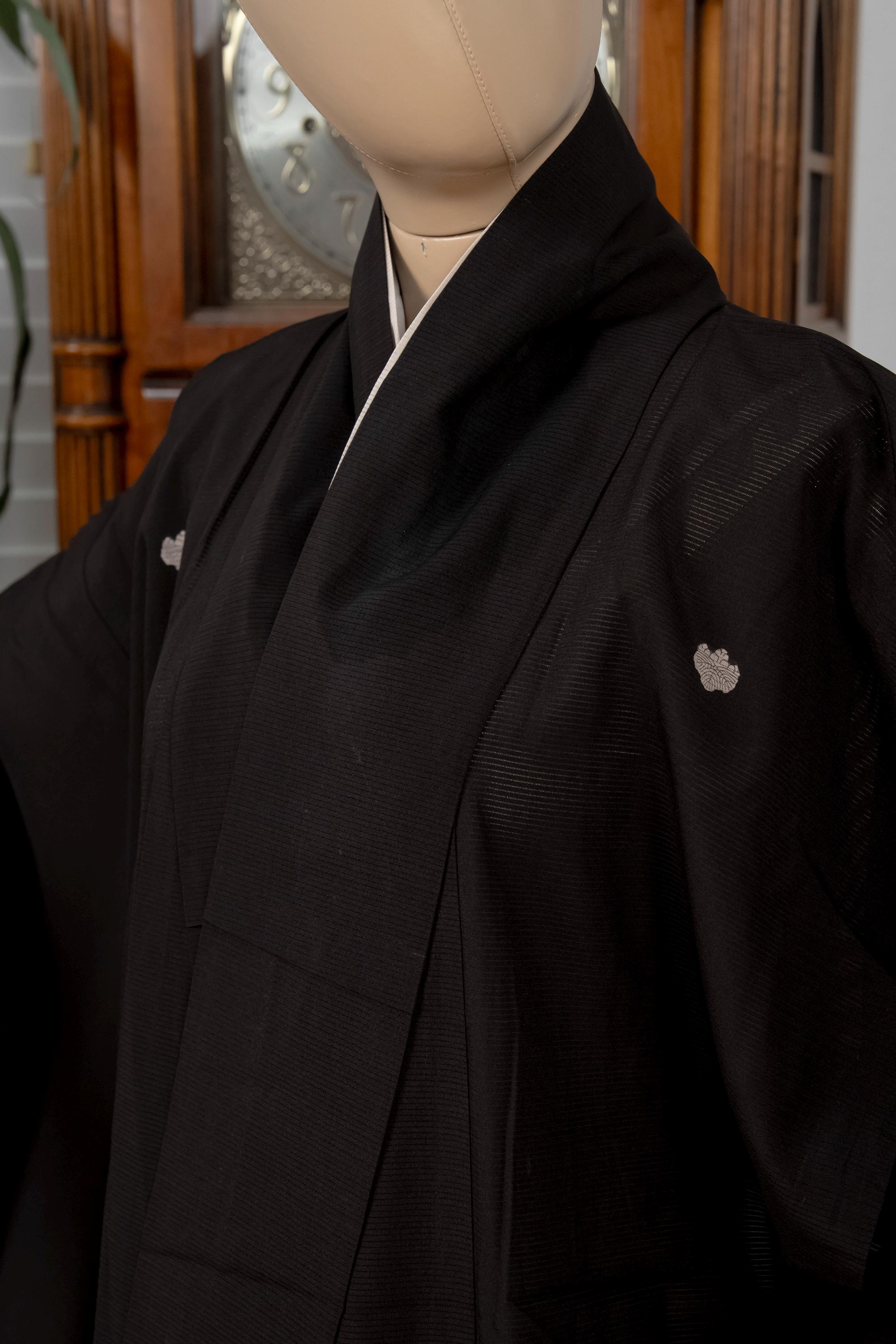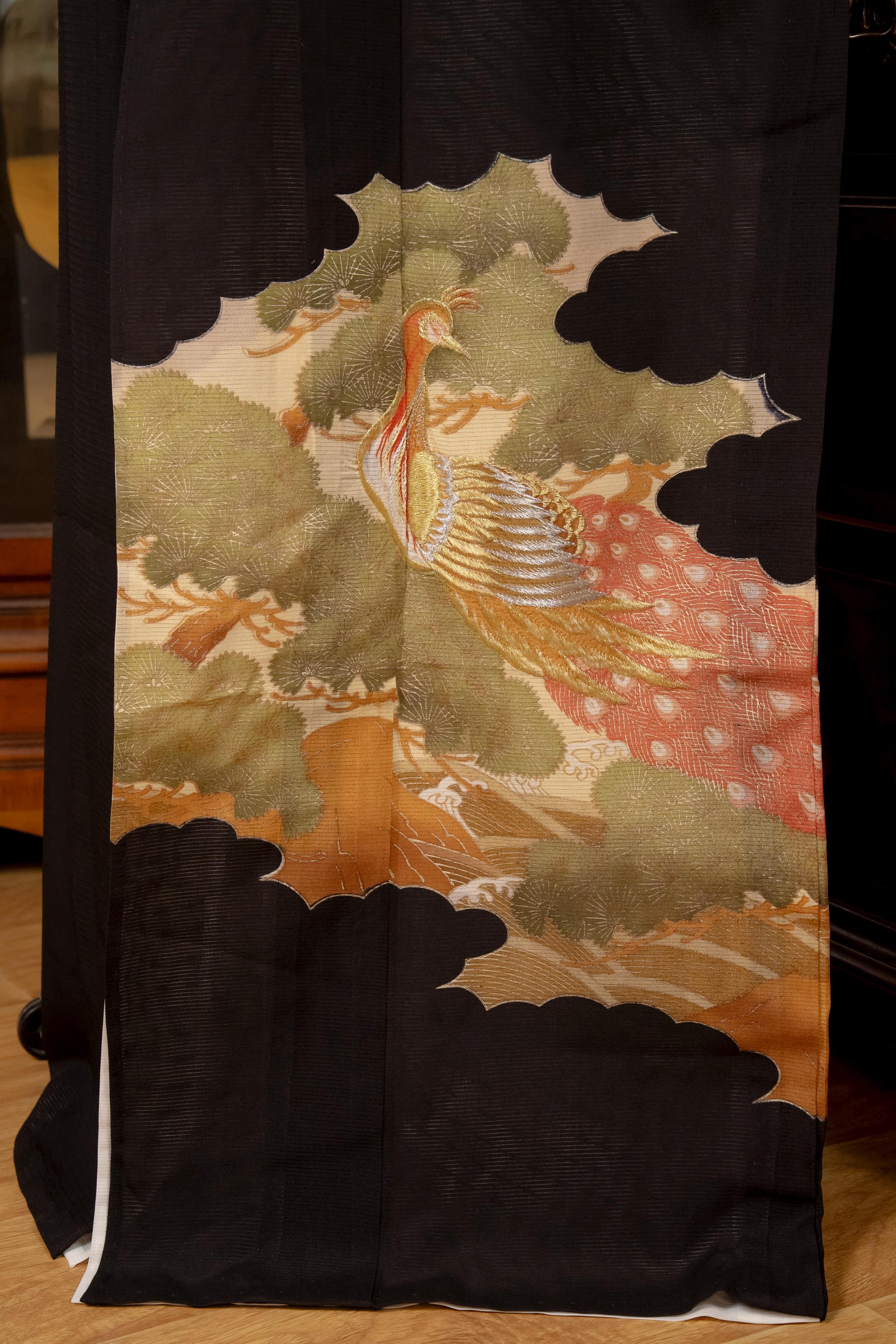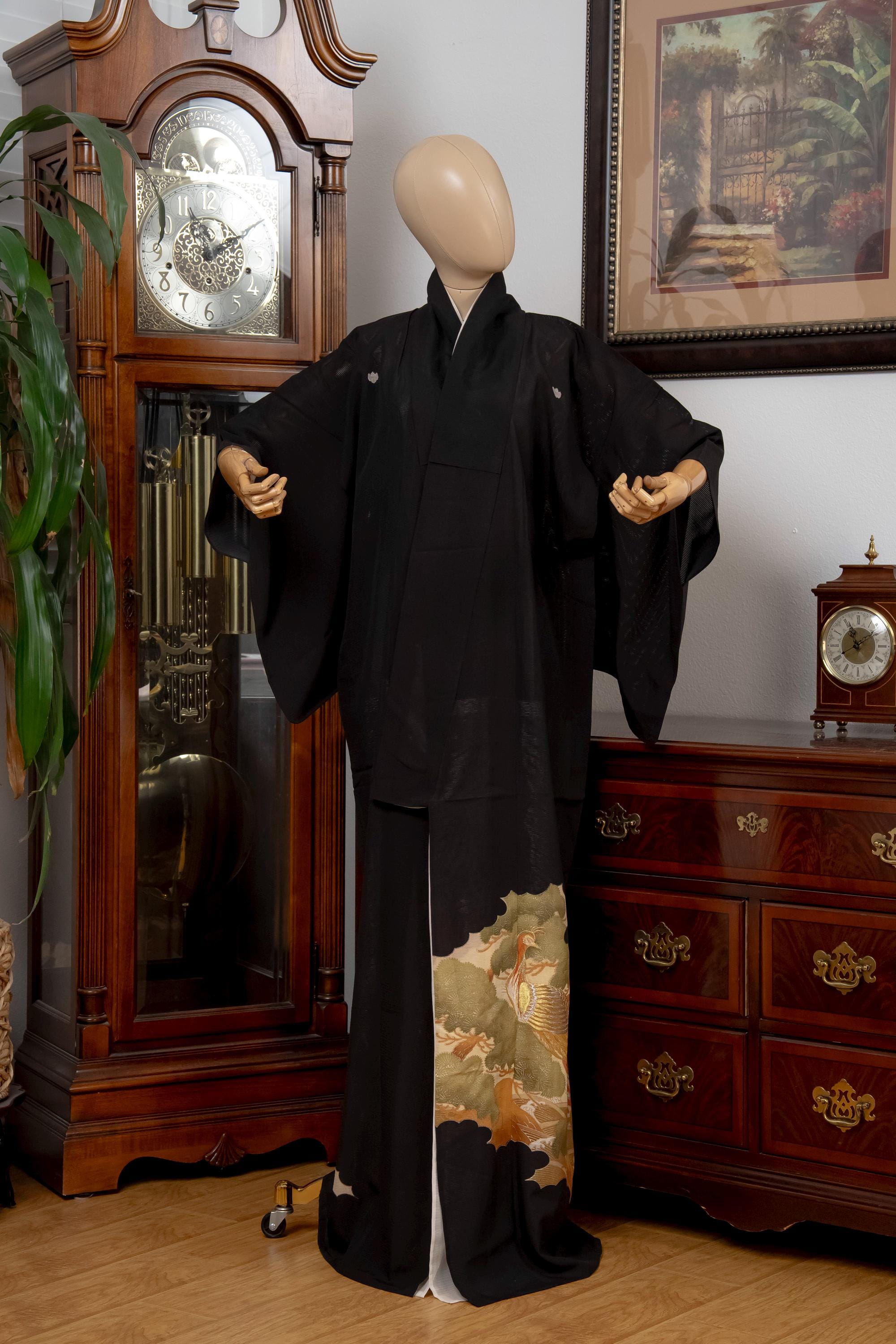 Tomesode is the most formal, high class Kimono for all ceremonies and occasions. Black ones are worn by married women and colored ones are worn by both married and unmarried women. Distinct characteristics of Tomesode are family crests and surrounding patterns around the hem. Numbers of family crests specify formality and rank.
