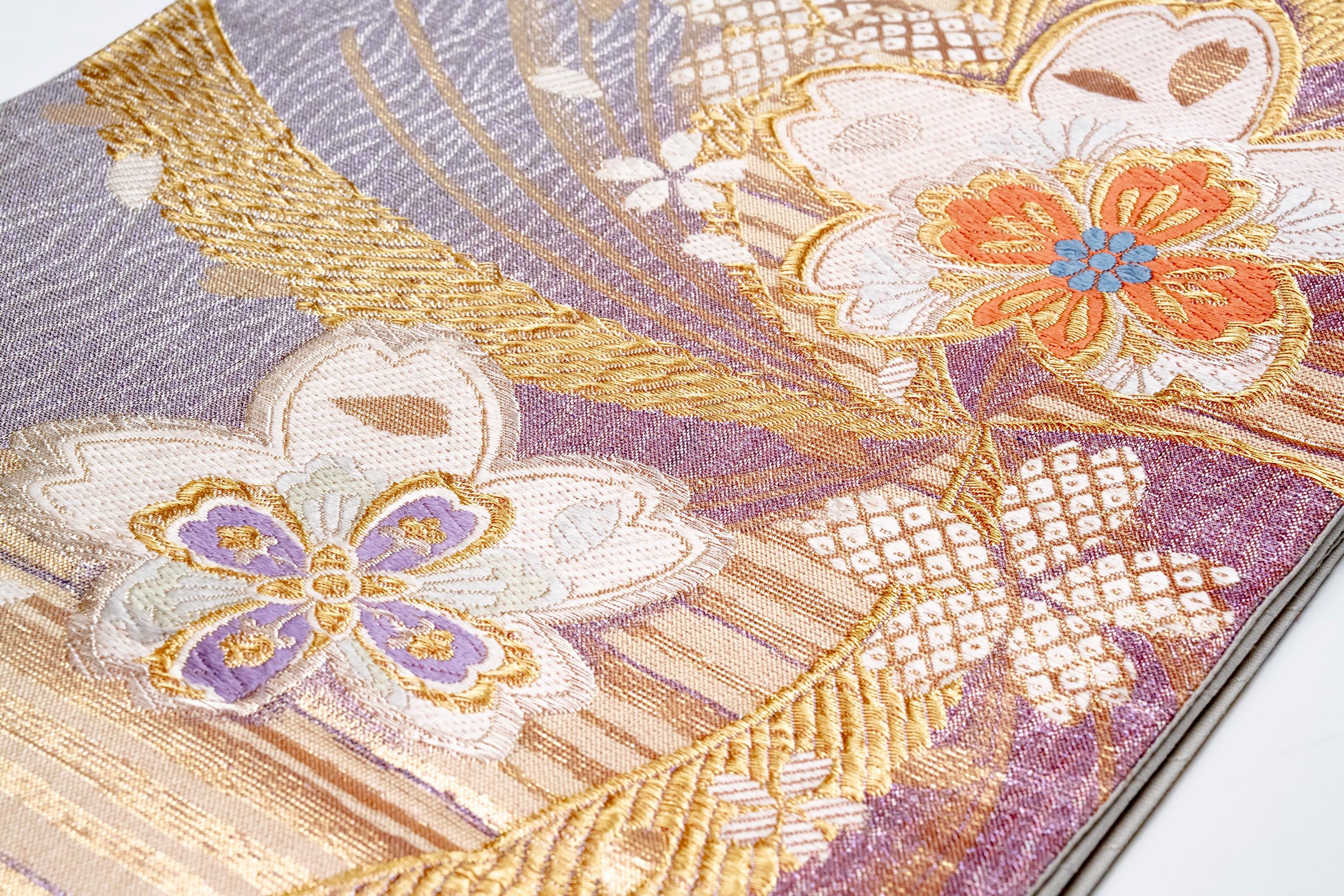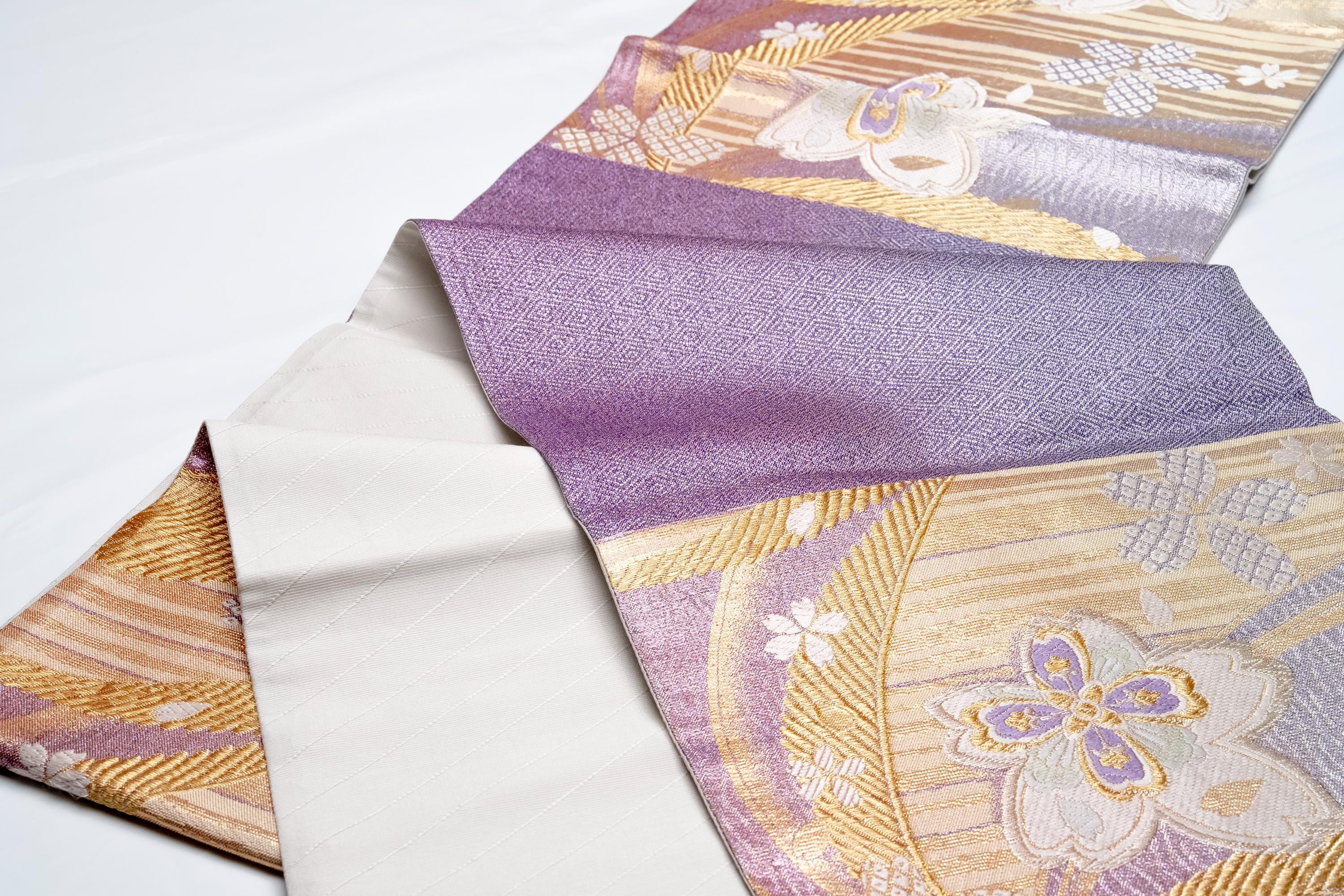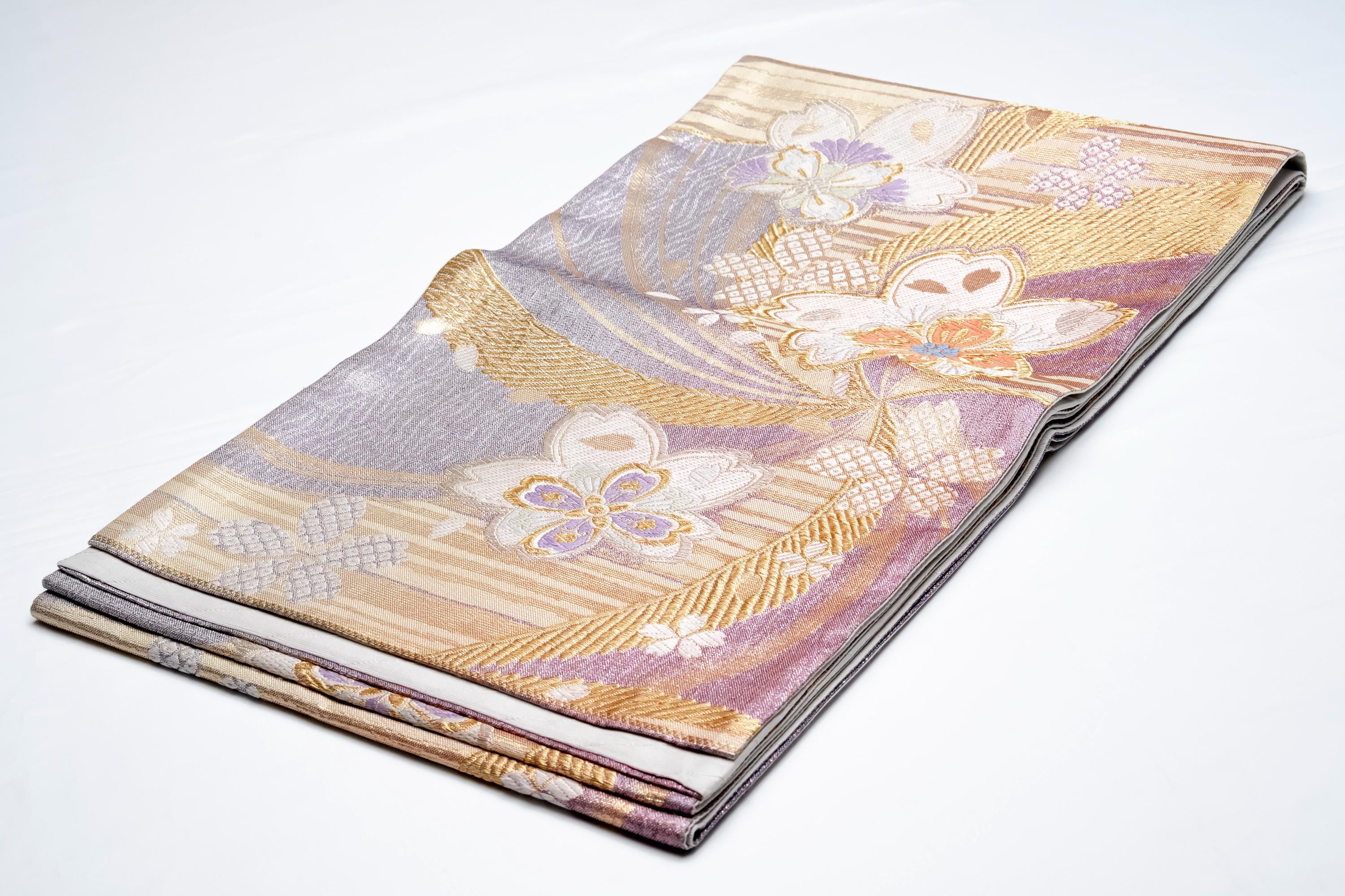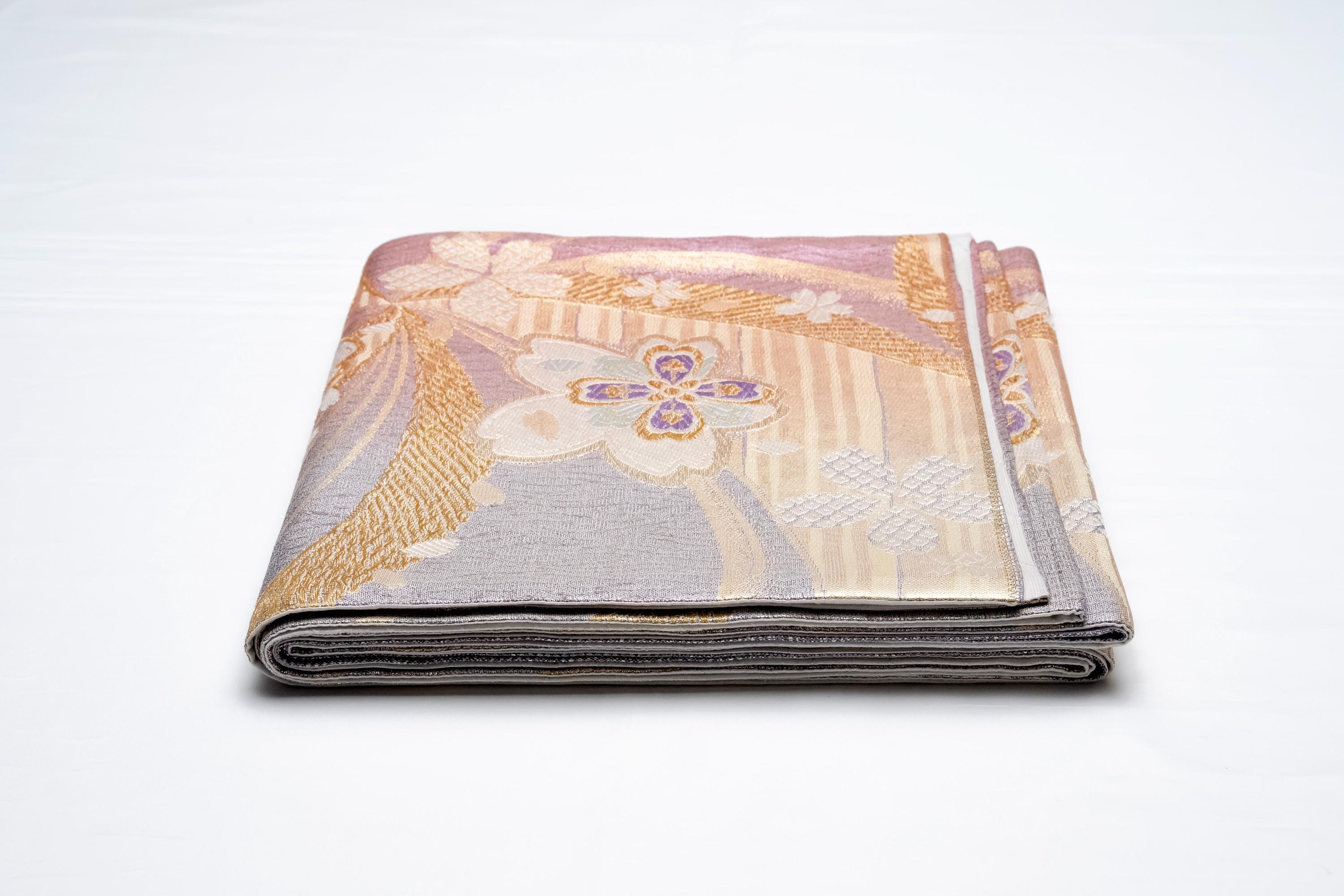Fukuro Obi is a full-size sash belt that wraps around the torso in women's formal Kimono wearing. It is wider, longer and heavier than other informal Obis and serves the purpose of keeping the Kimono front closed securely, drawing up excess fabric to adjust the length of Kimono, and decorative expressions.