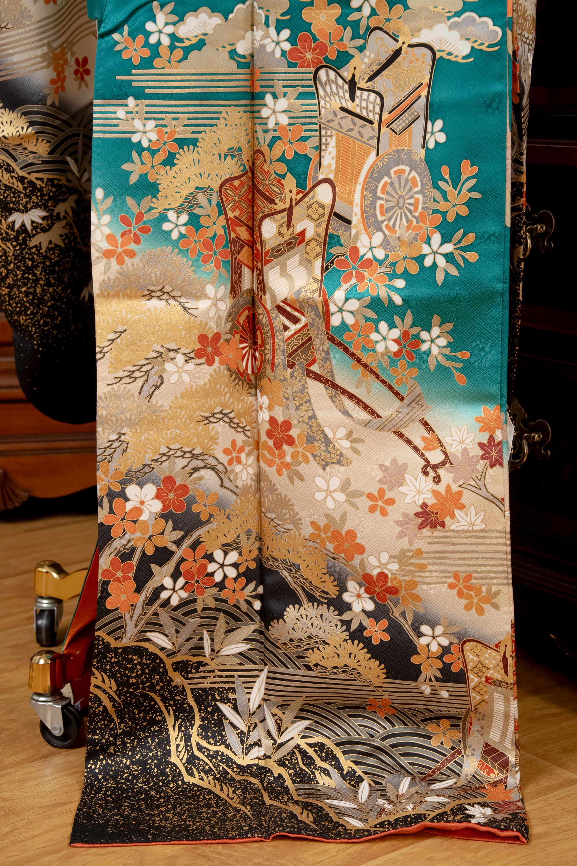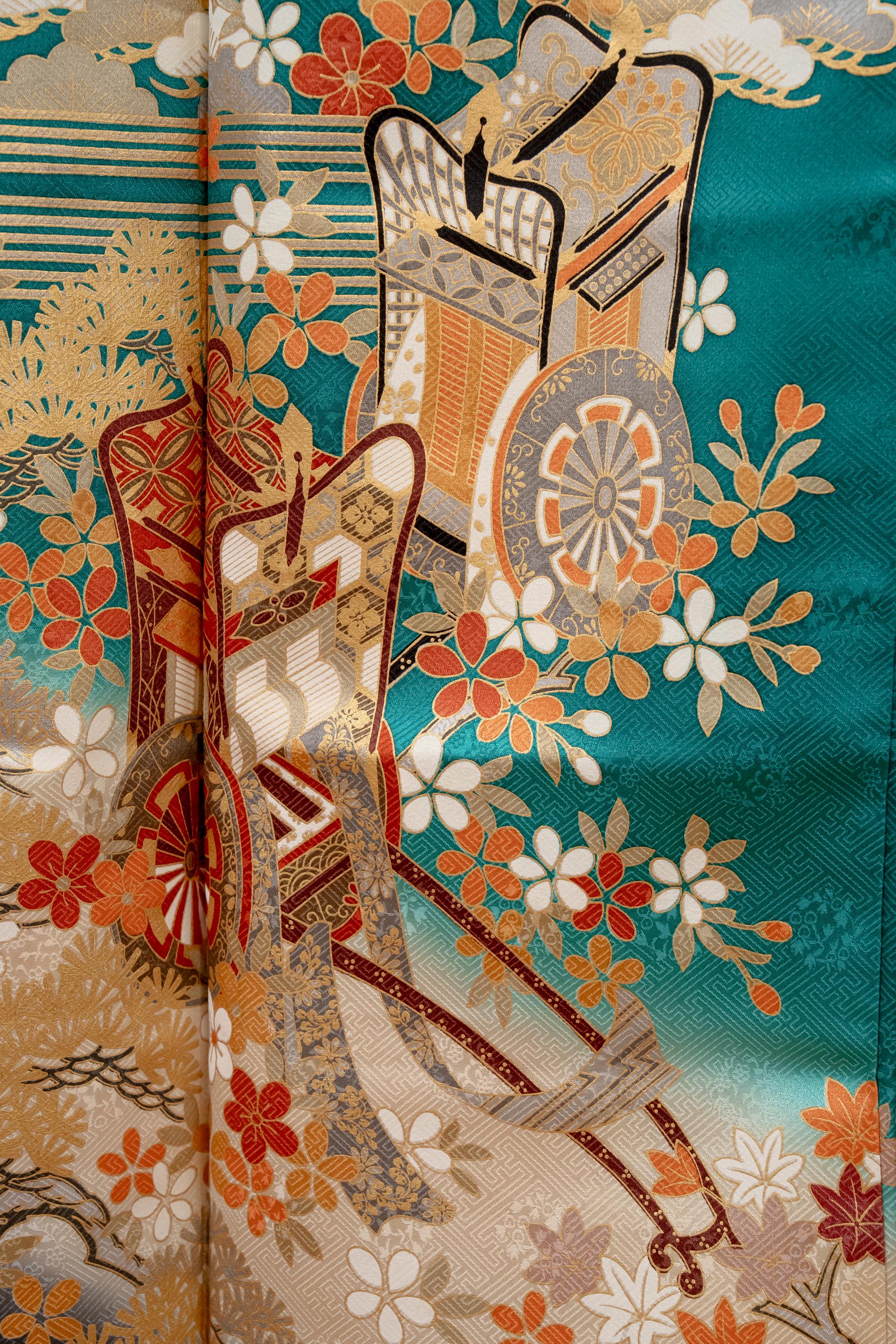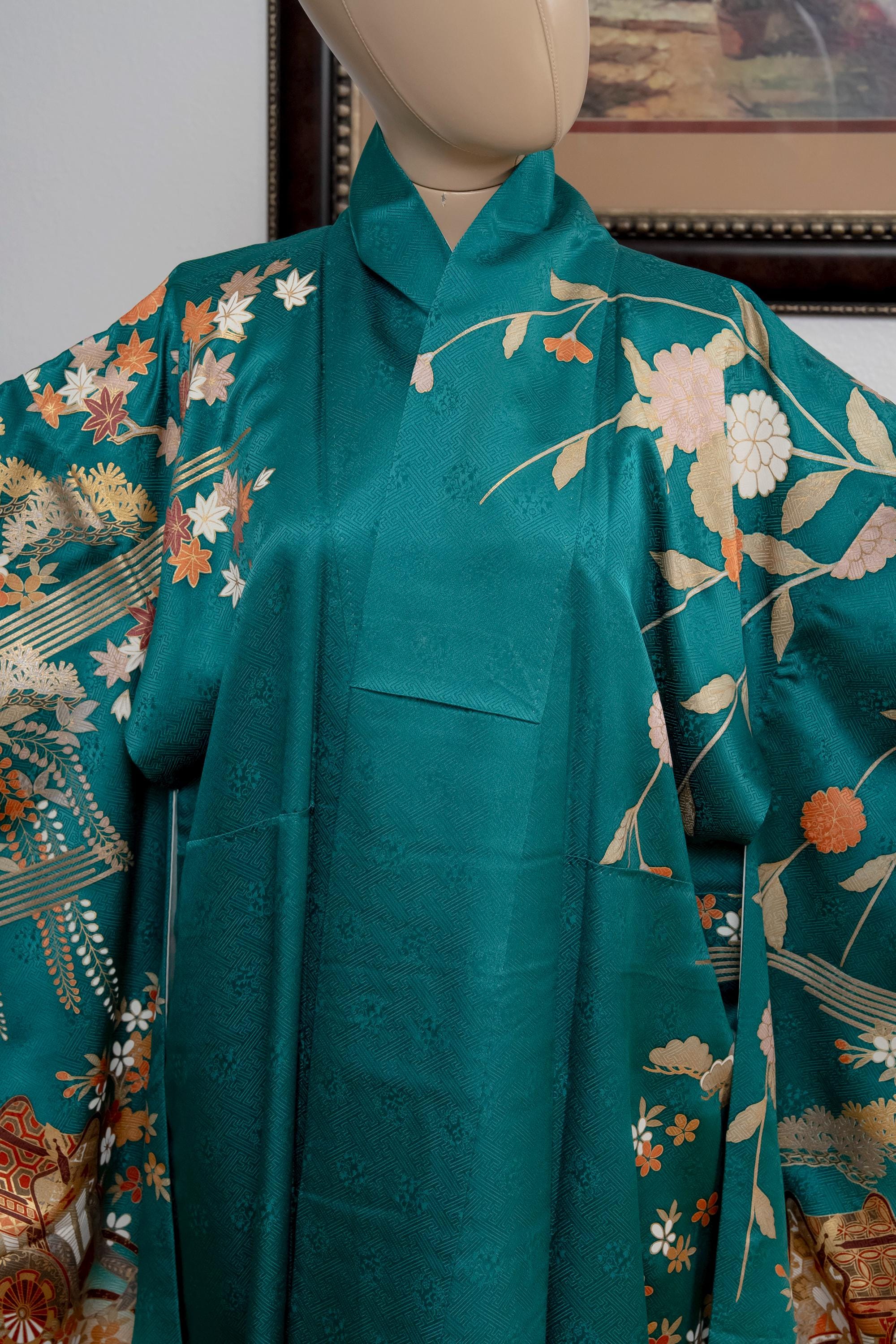 Furisode is a formal kimono distinguishable by its long sleeves. Furisode is the most formal style of kimono worn by young unmarried women in Japan, generally used for formal social functions such as the tea ceremony, wedding ceremonies and graduation ceremonies. Furisode's elegant aesthetics along with such fine details often make a great wall decoration for home as well.