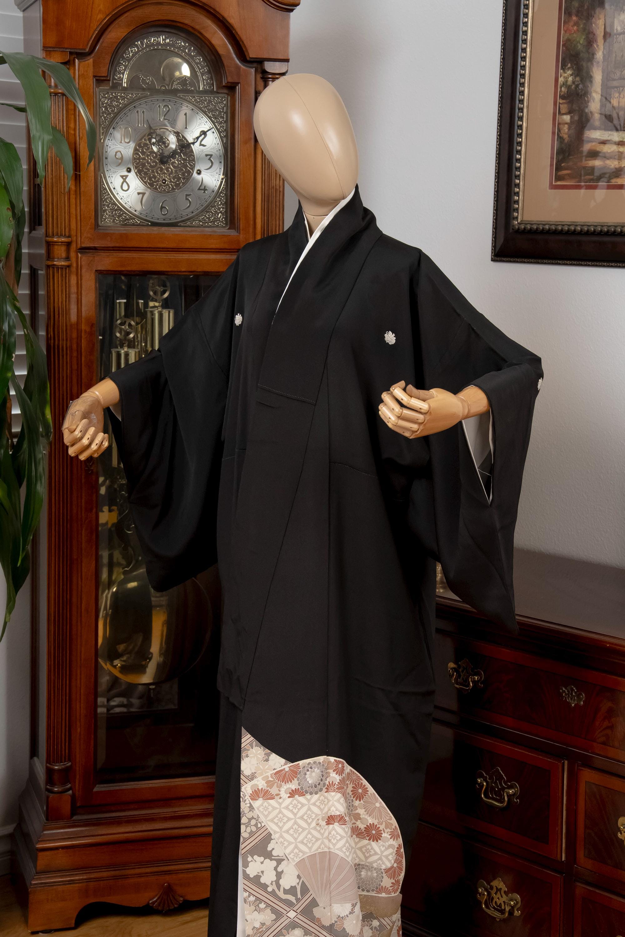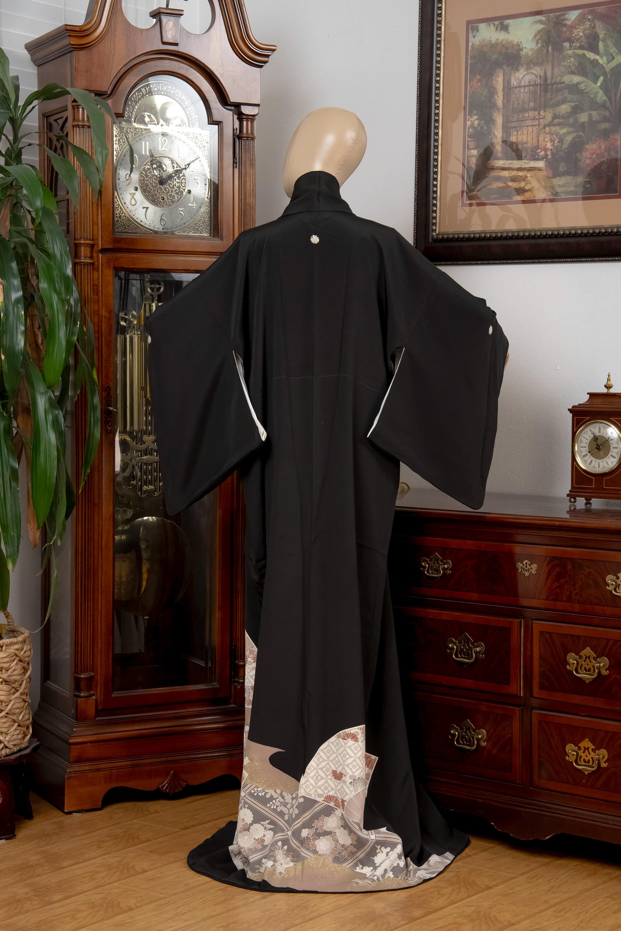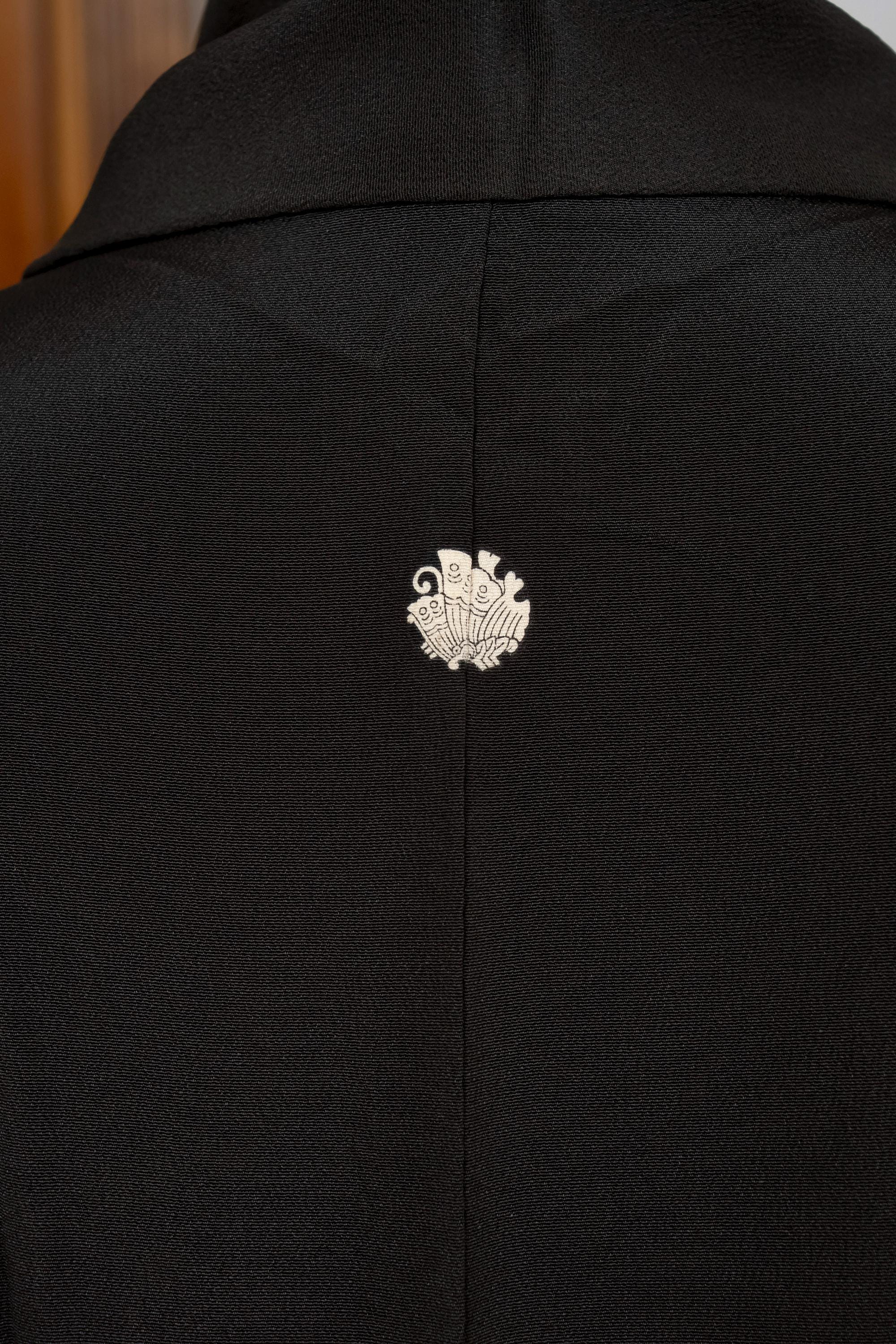 Tomesode is the most formal, high class Kimono for all ceremonies and occasions. Black ones are worn by married women and colored ones are worn by both married and unmarried women. Distinct characteristics of Tomesode are family crests and surrounding patterns around the hem. Numbers of family crests specify formality and rank.