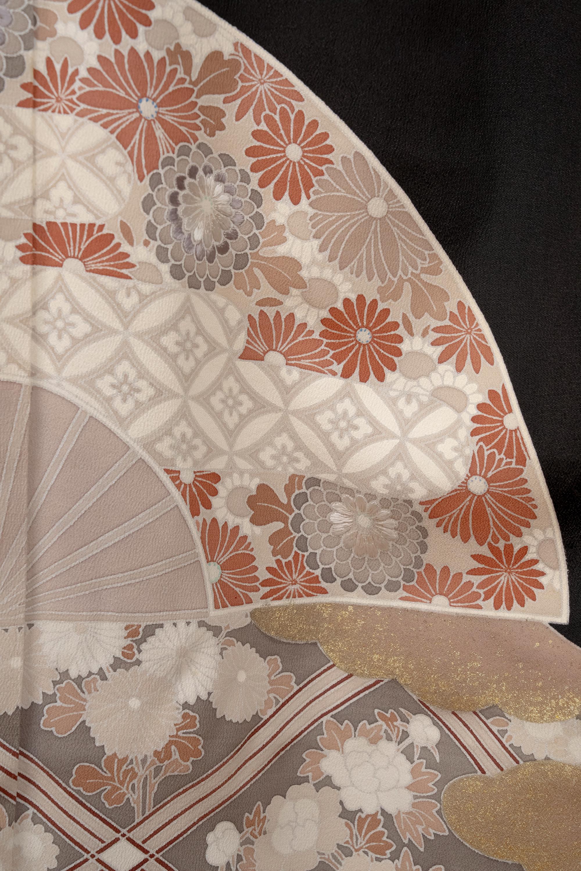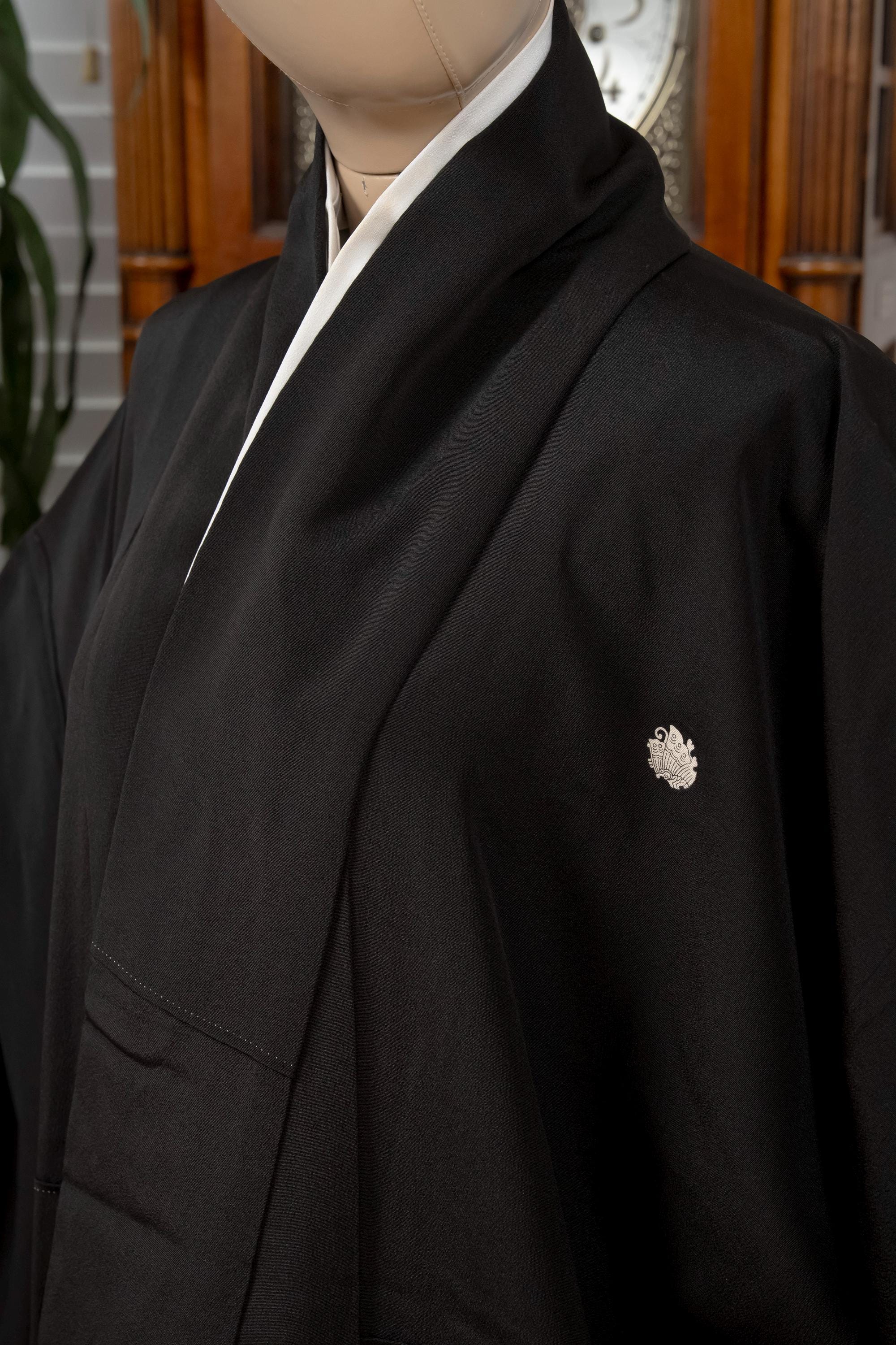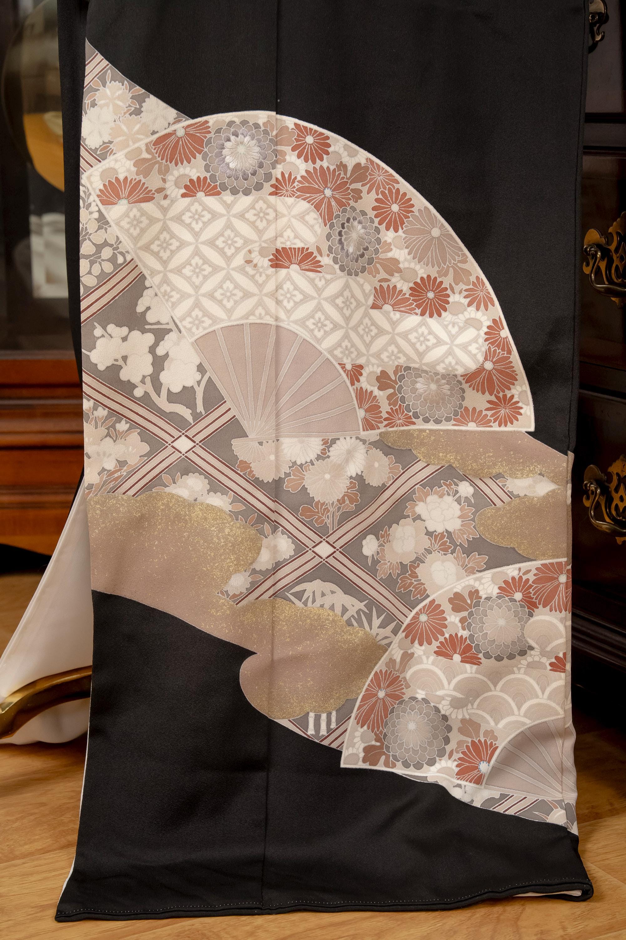 Tomesode is the most formal, high class Kimono for all ceremonies and occasions. Black ones are worn by married women and colored ones are worn by both married and unmarried women. Distinct characteristics of Tomesode are family crests and surrounding patterns around the hem. Numbers of family crests specify formality and rank.