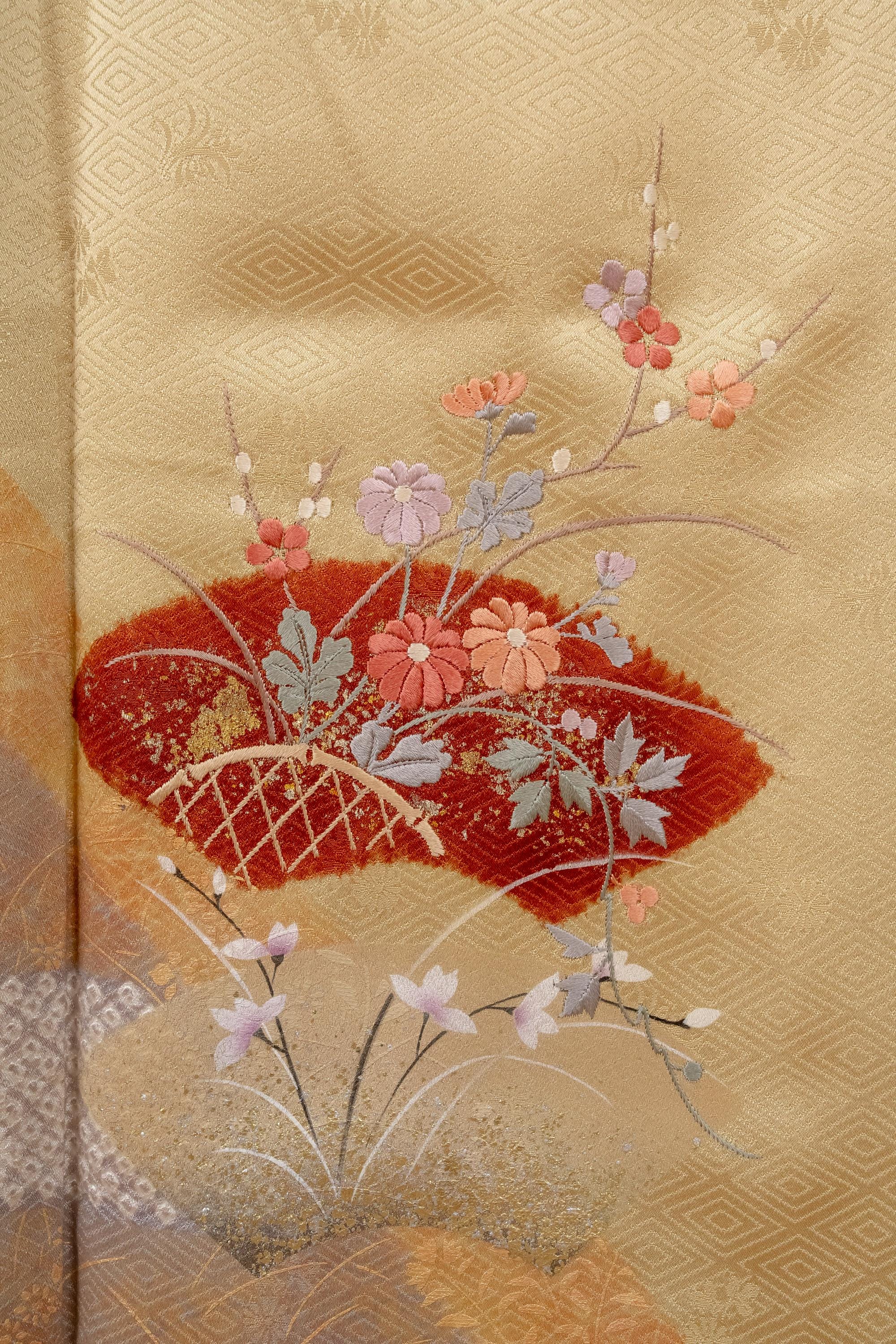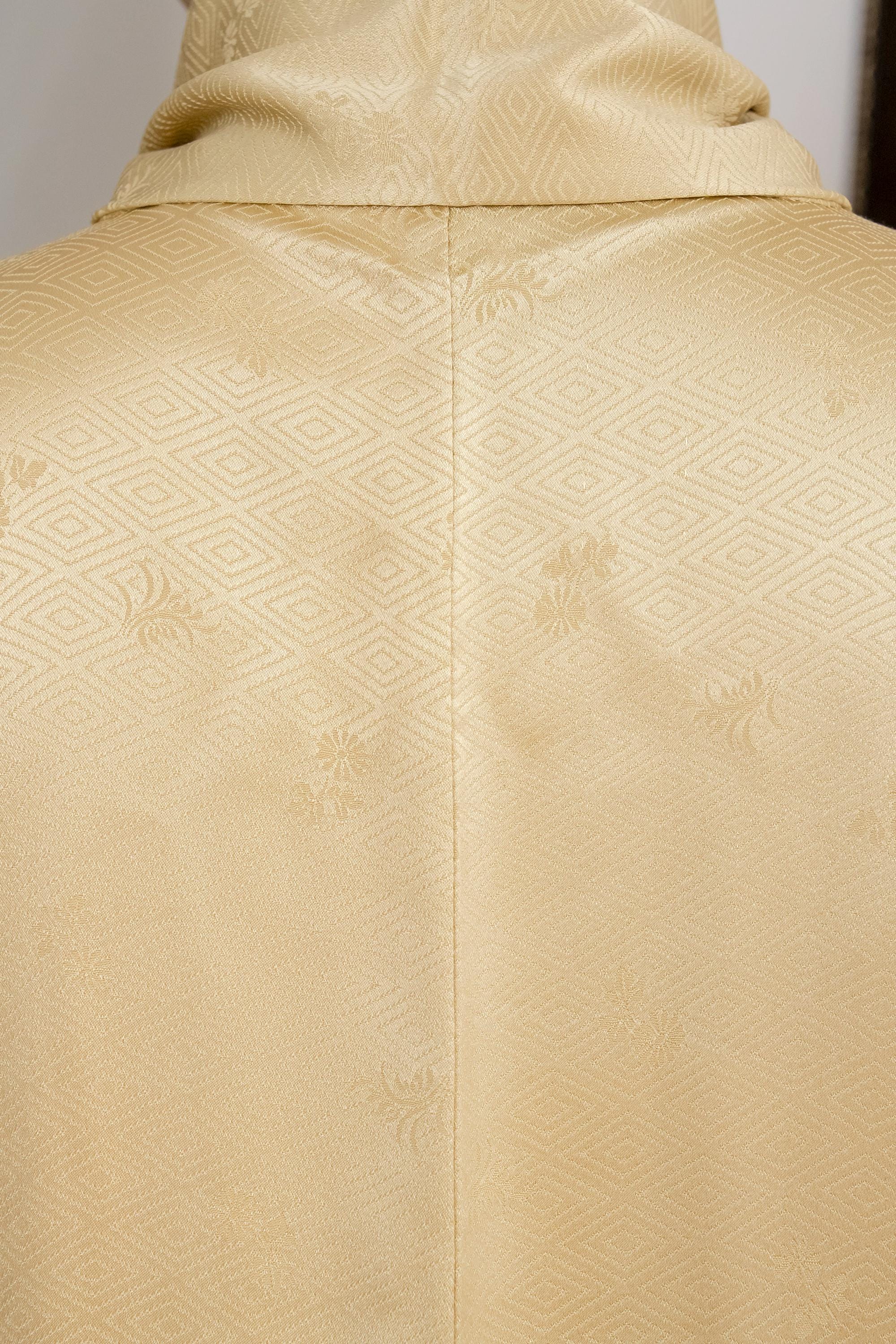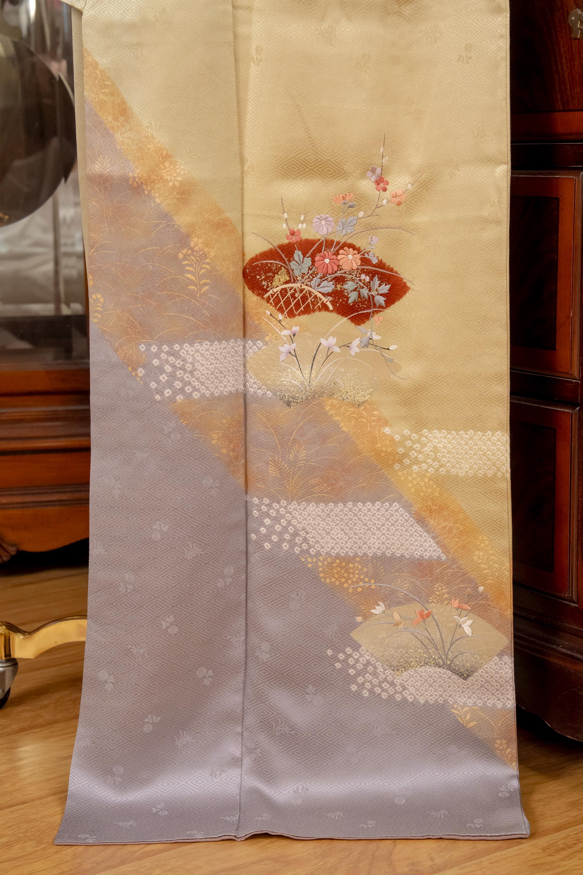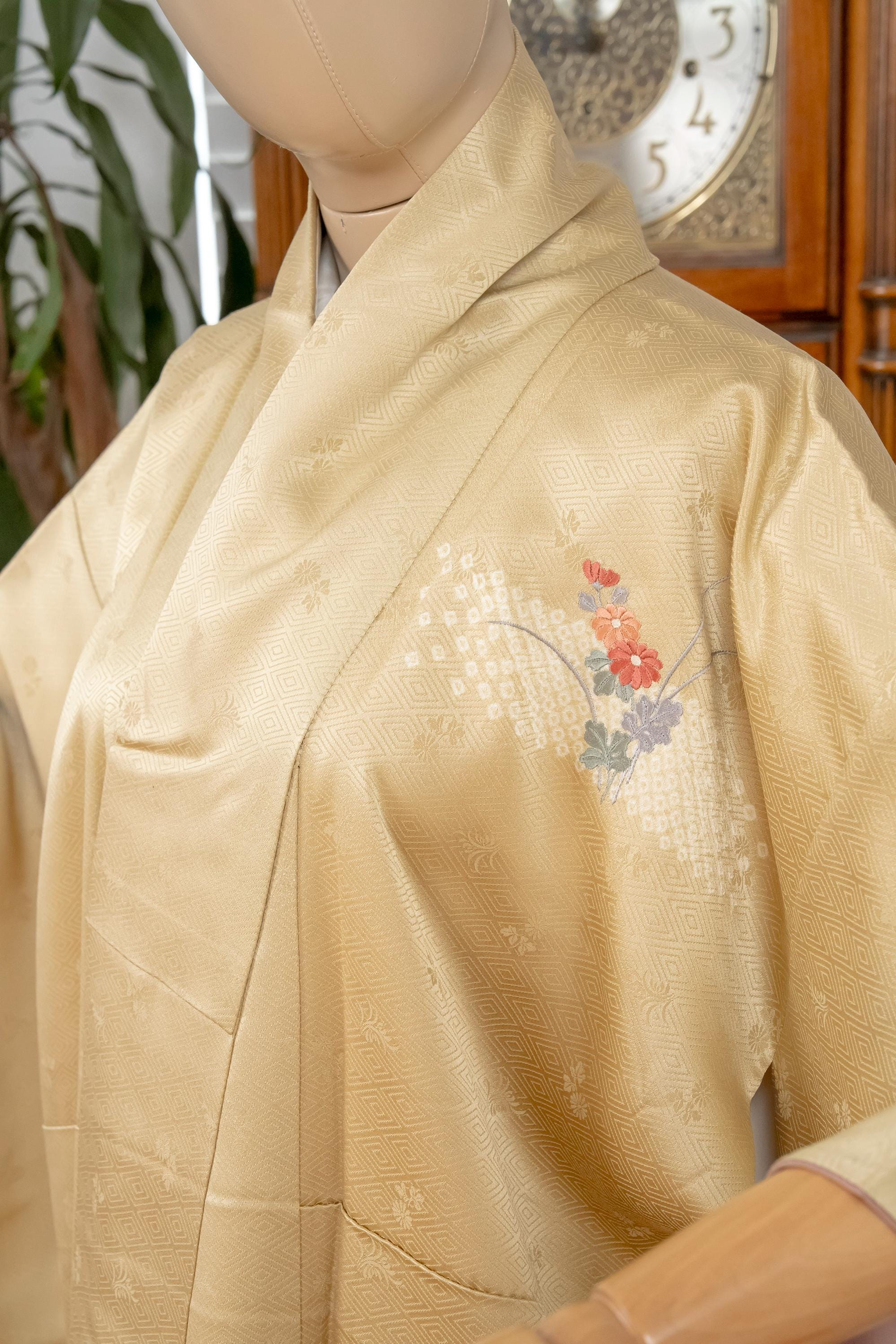 Homongi is a high-class formal Kimono for official visits that became very popular in Meiji period among upper-class females. It is commonly worn as a festive garment for ceremonies and parties by both married and unmarried women. Linked patterns on the chest, shoulder, sleeves and family crests are distinct characteristics of Homongi Kimono.