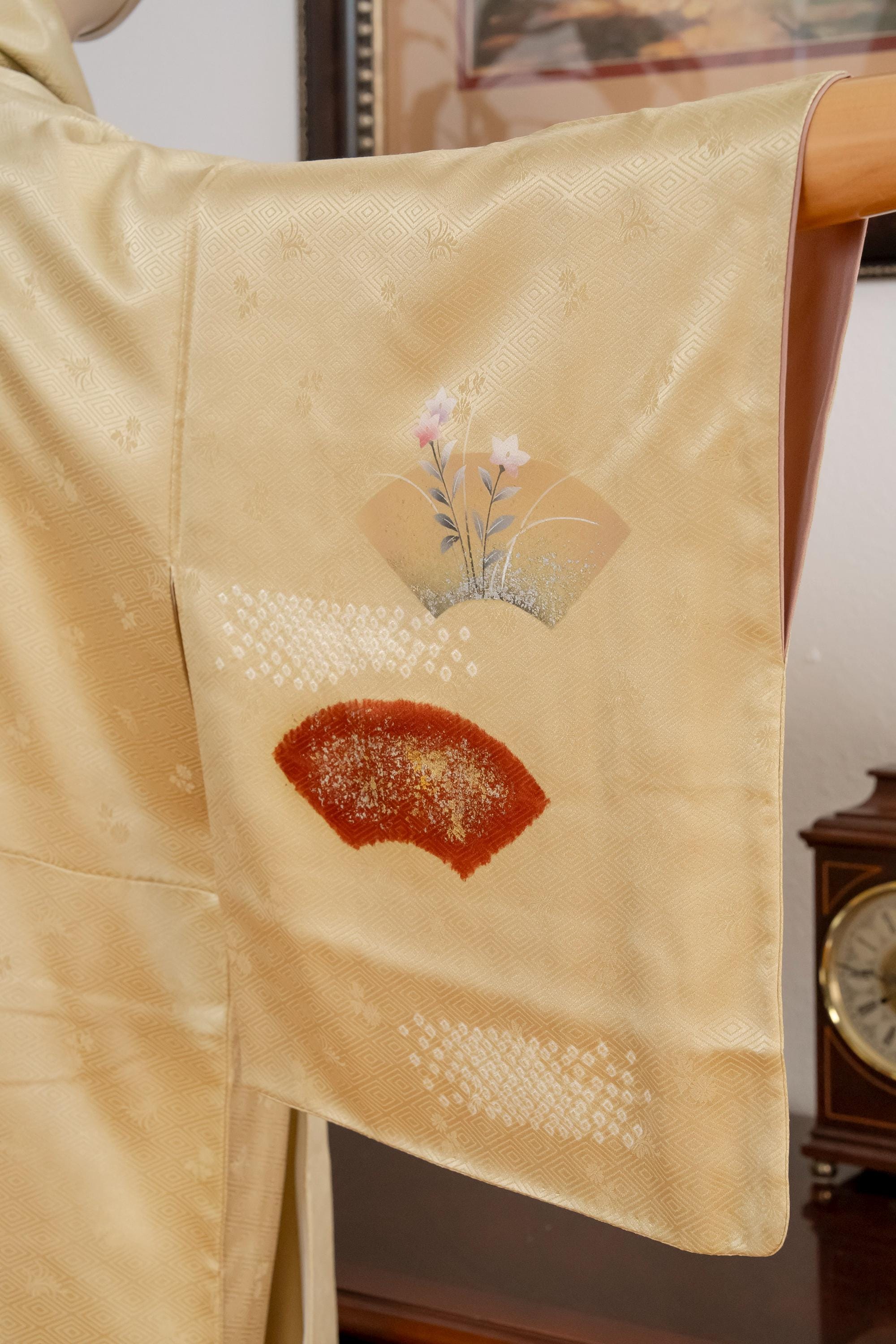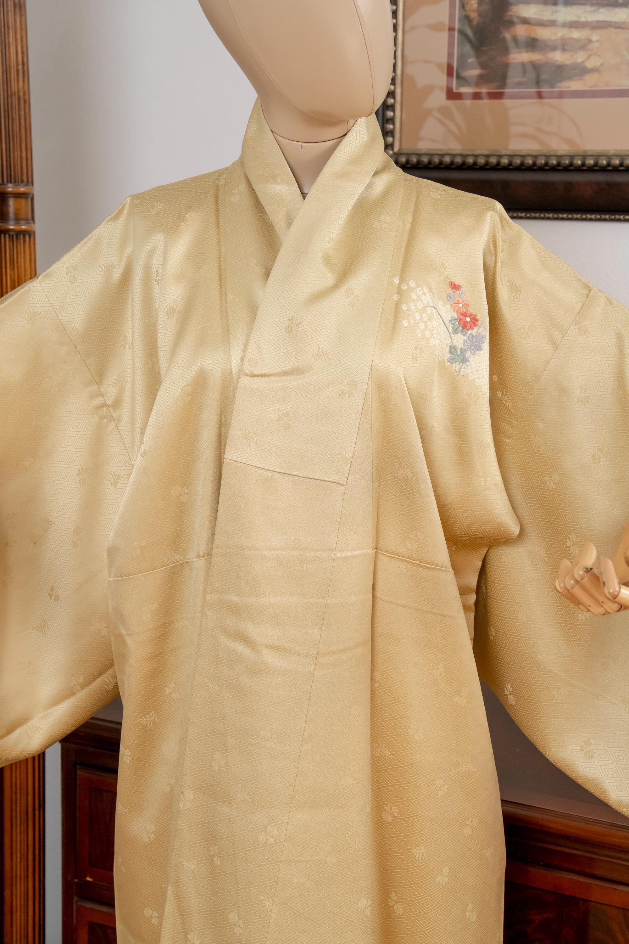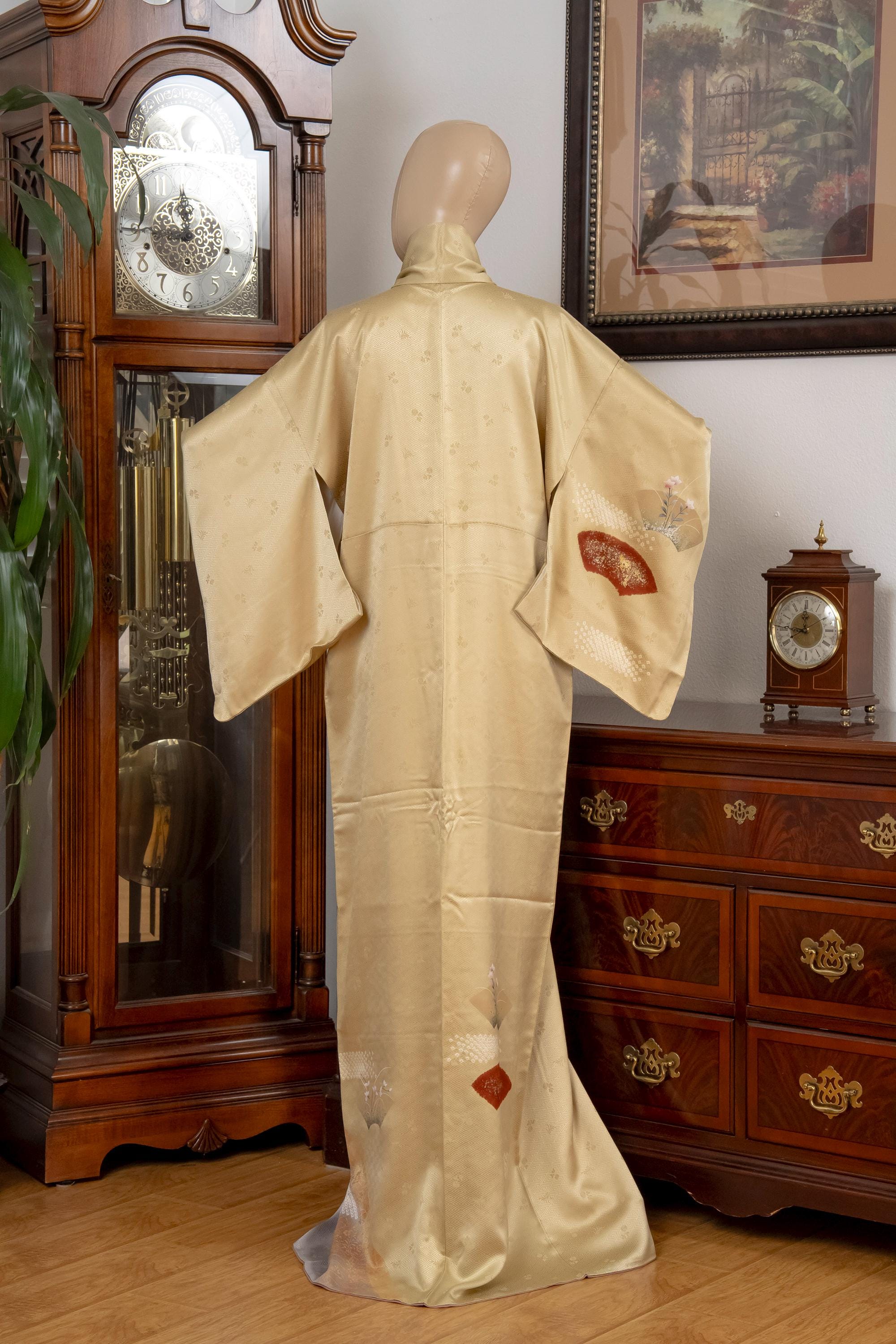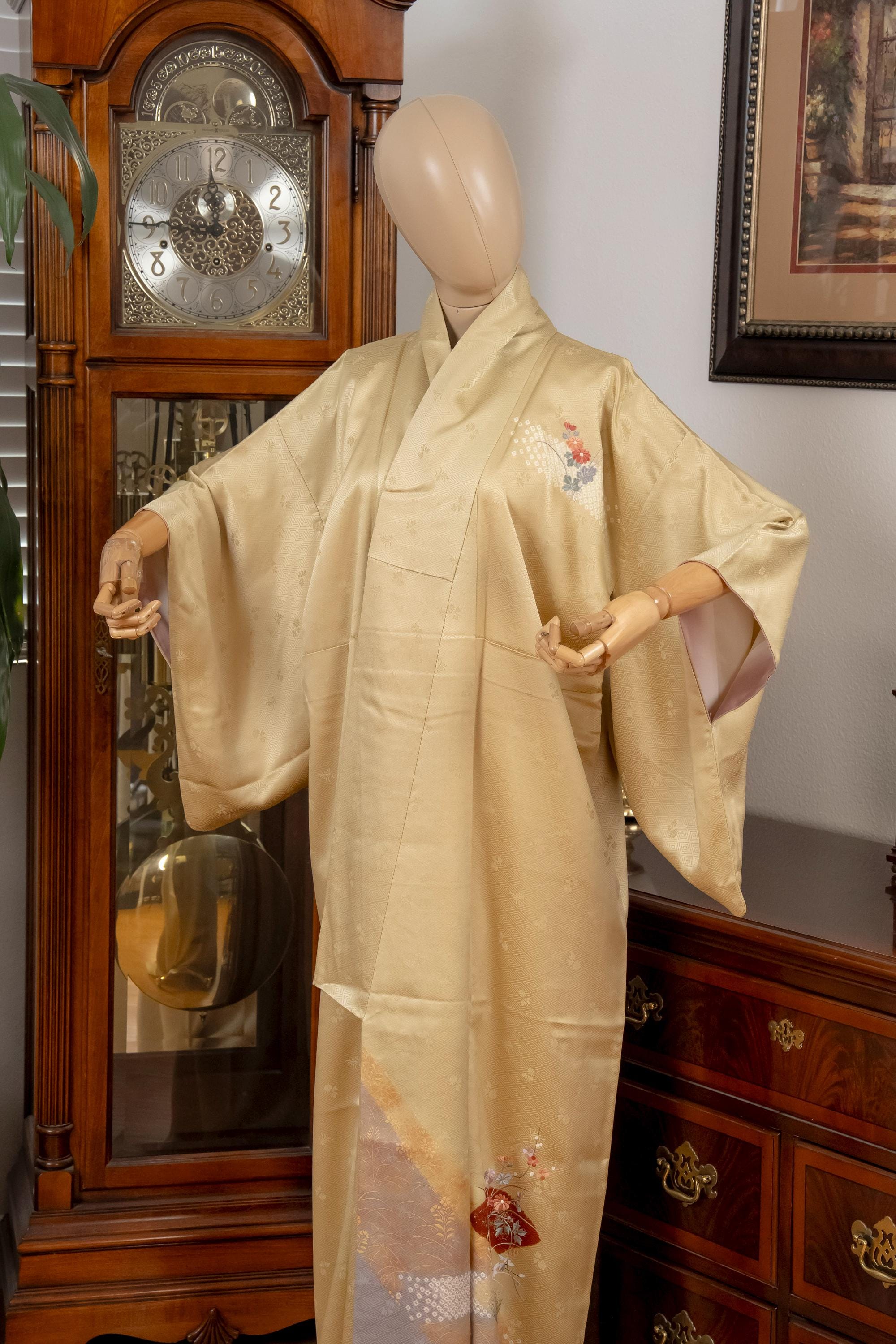 Please keep in mind that female Kimonos are supposed to fit long. You will need to adjust the length to your size by tying with Kitsuke accessories and Obi belt.