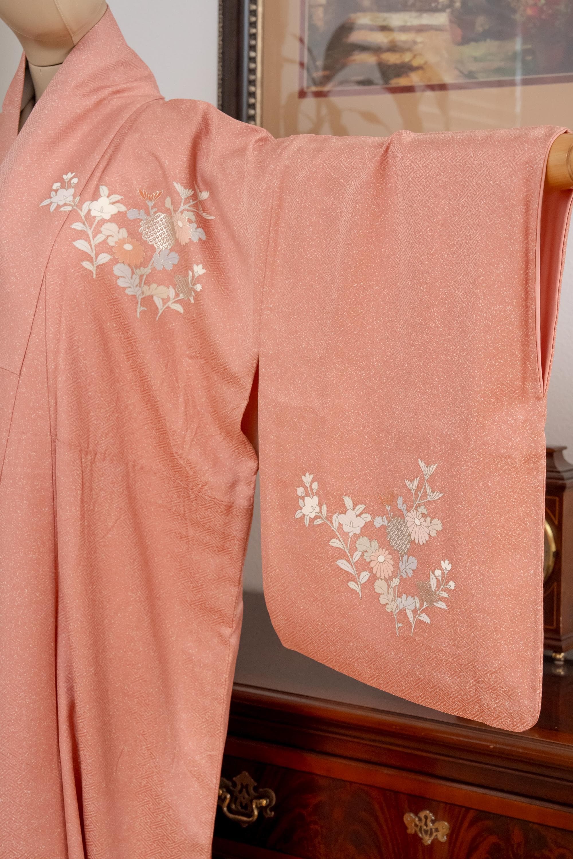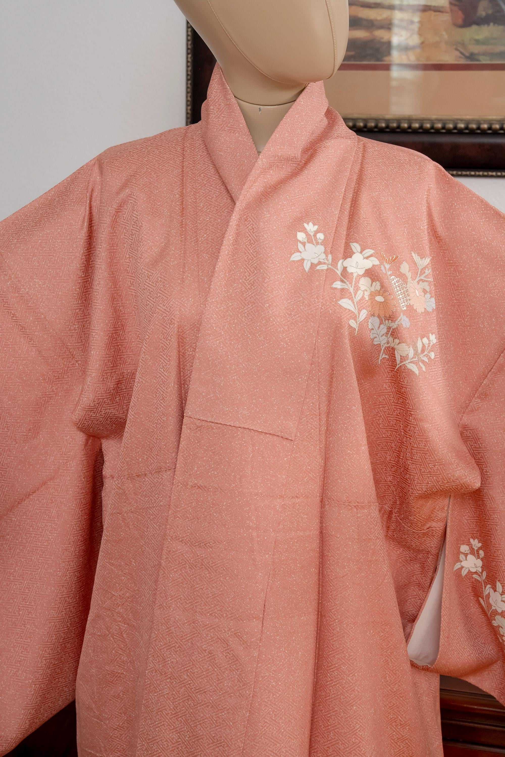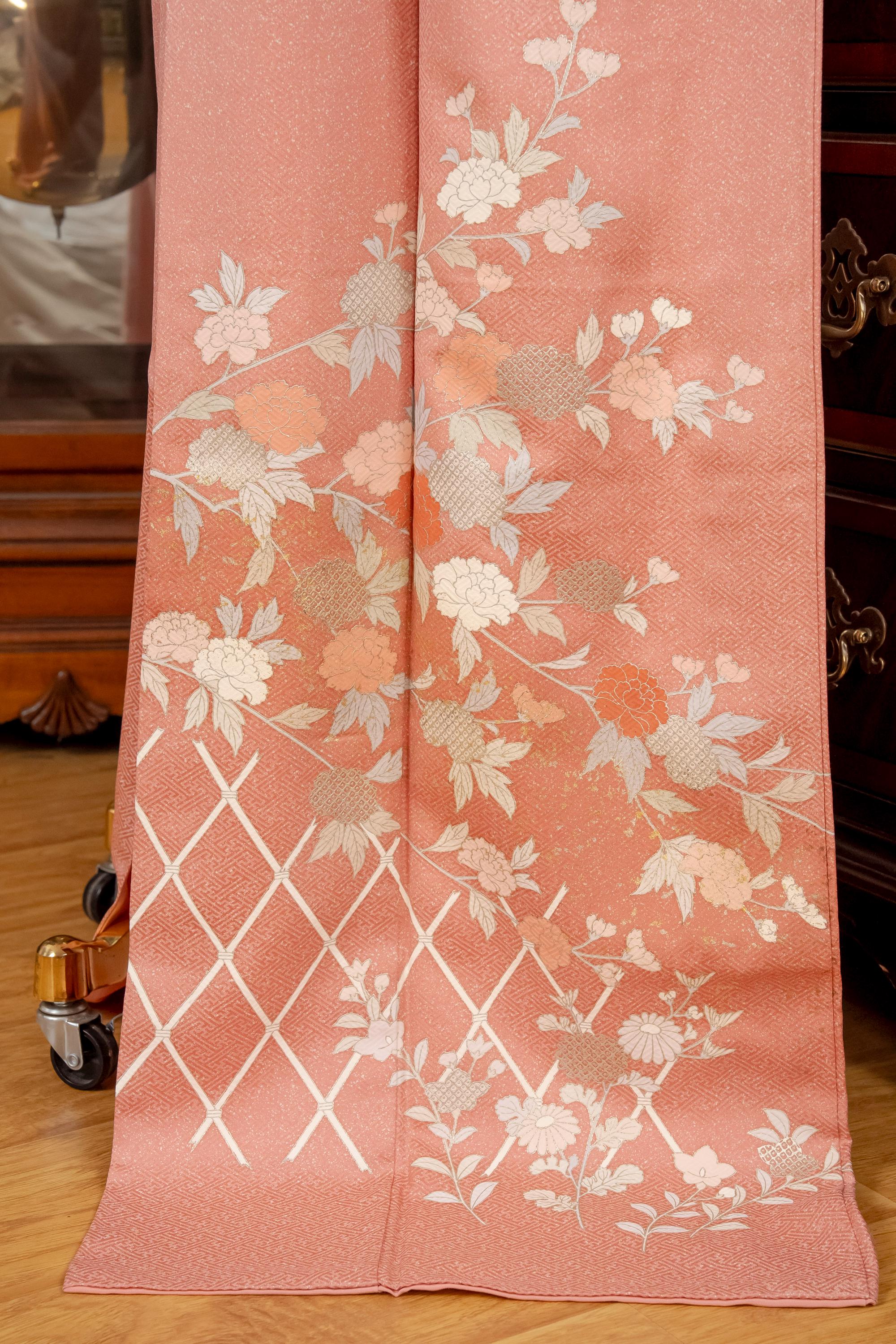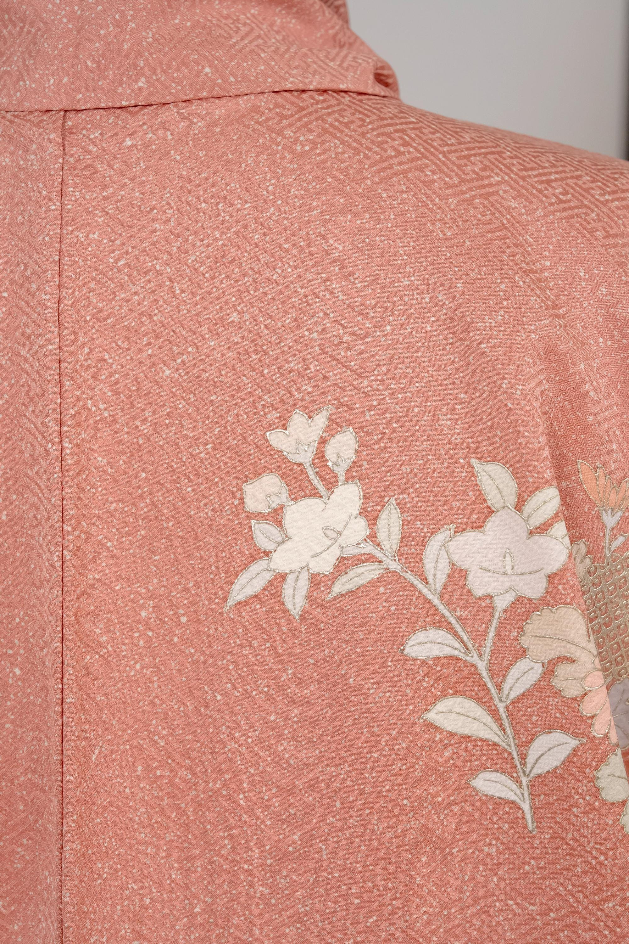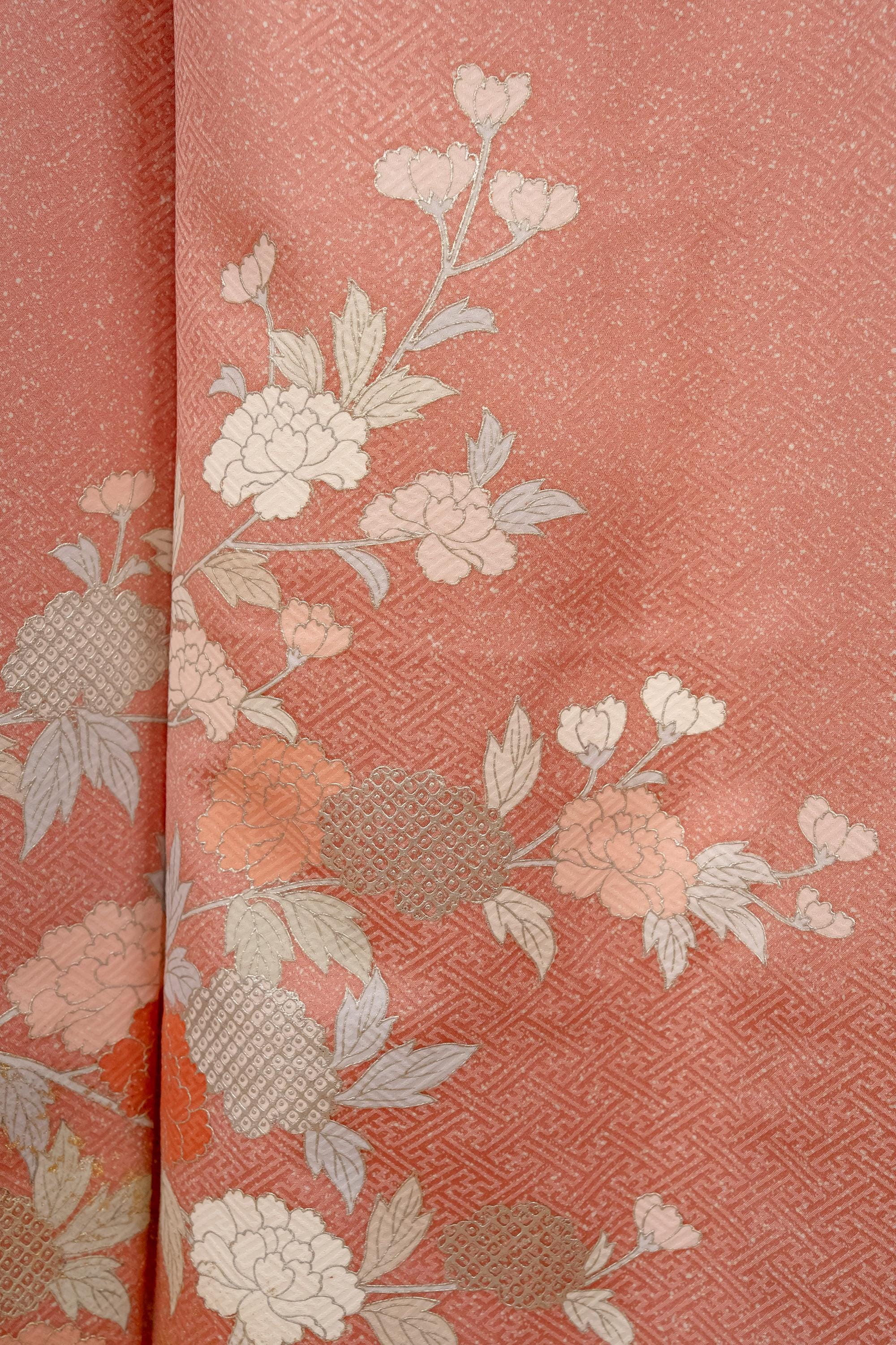 Homongi is a high-class formal Kimono for official visits that became very popular in Meiji period among upper-class females. It is commonly worn as a festive garment for ceremonies and parties by both married and unmarried women. Linked patterns on the chest, shoulder, sleeves and family crests are distinct characteristics of Homongi Kimono.