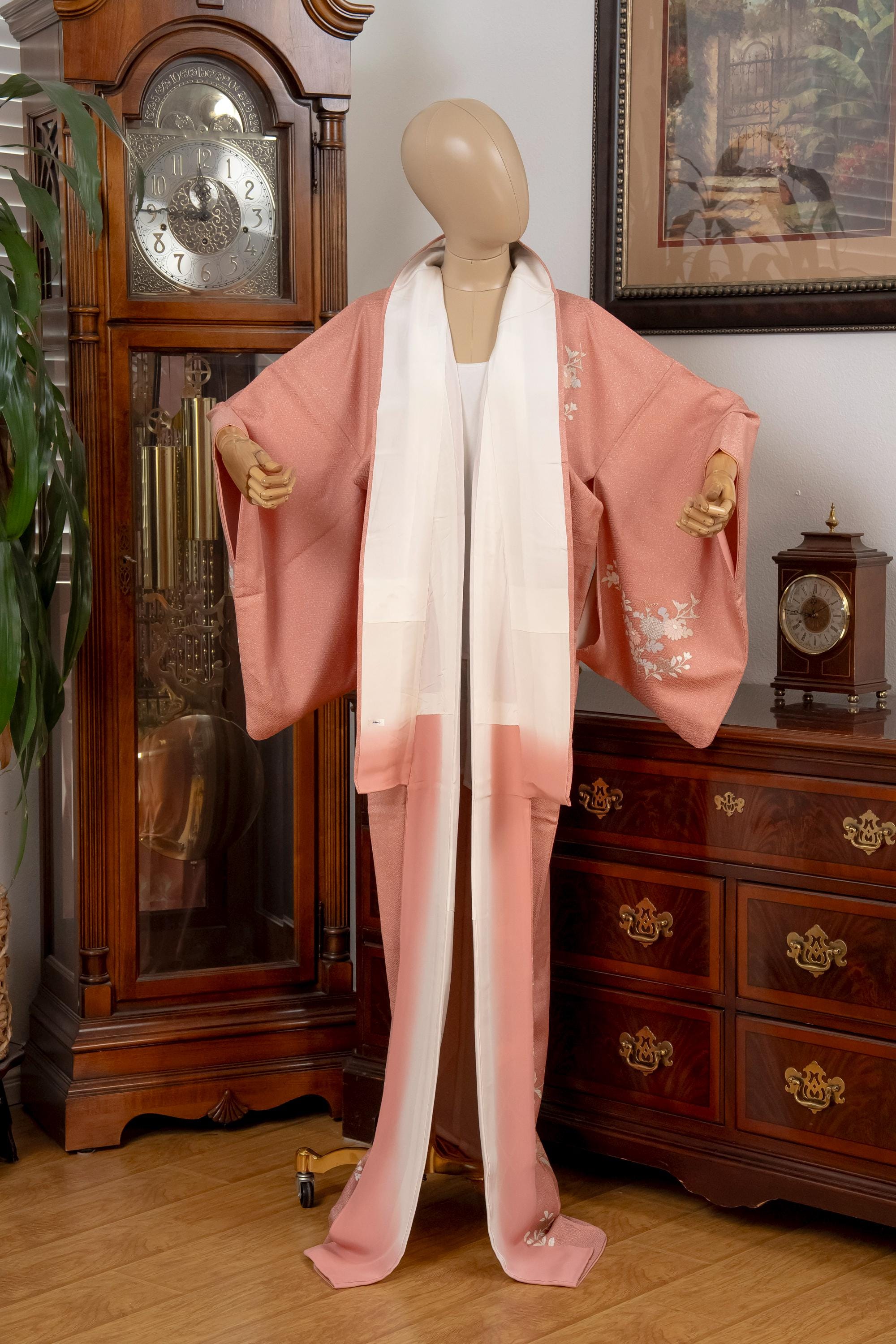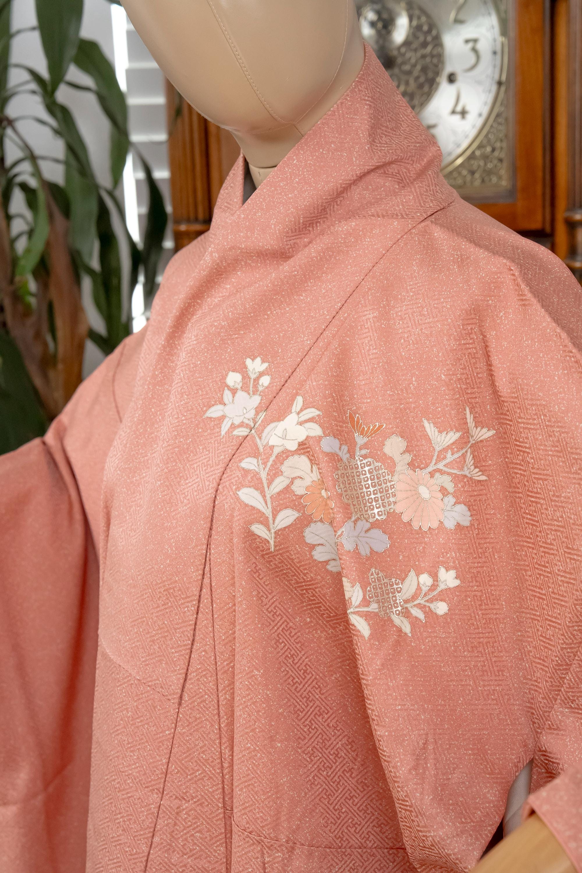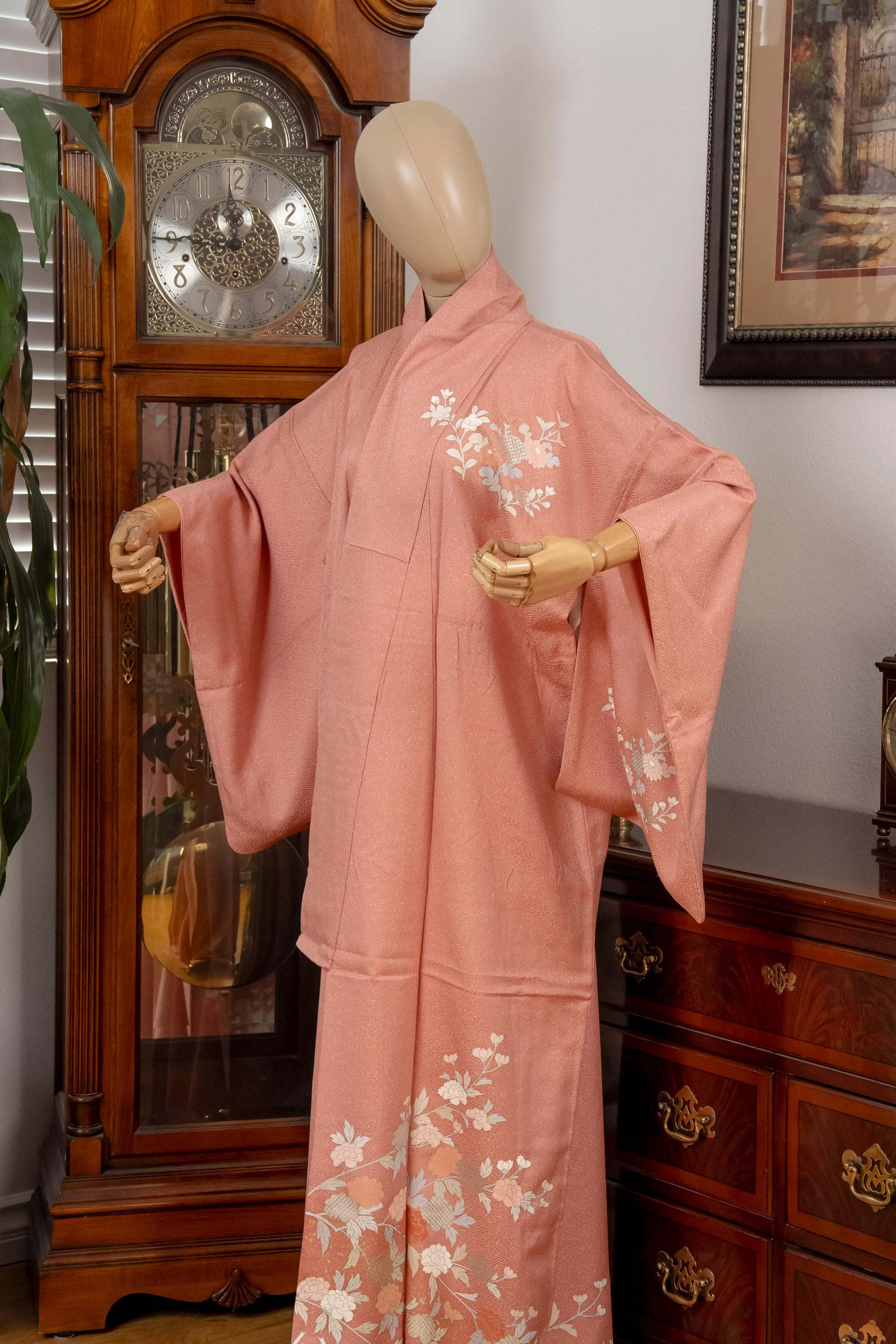 Please keep in mind that female Kimonos are supposed to fit long. You will need to adjust the length to your size by tying with Kitsuke accessories and Obi belt.