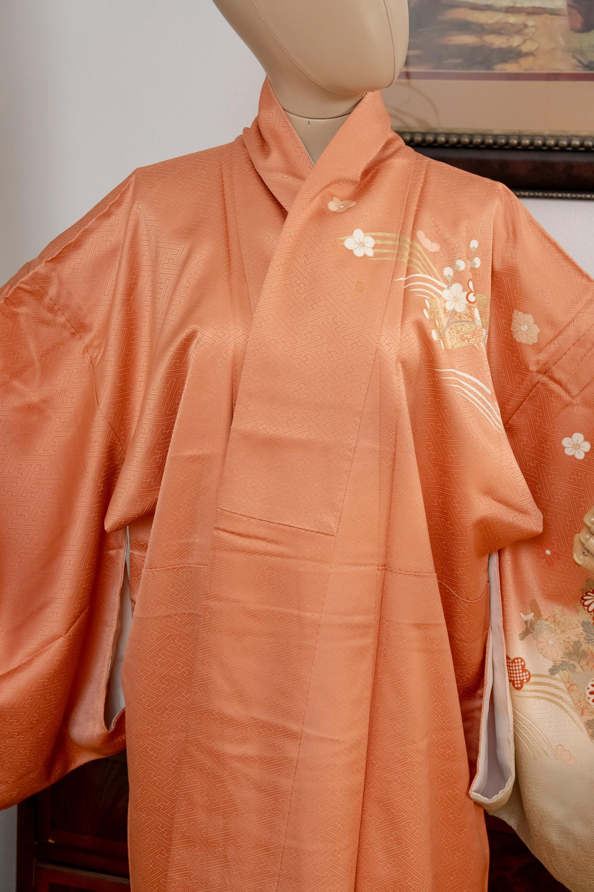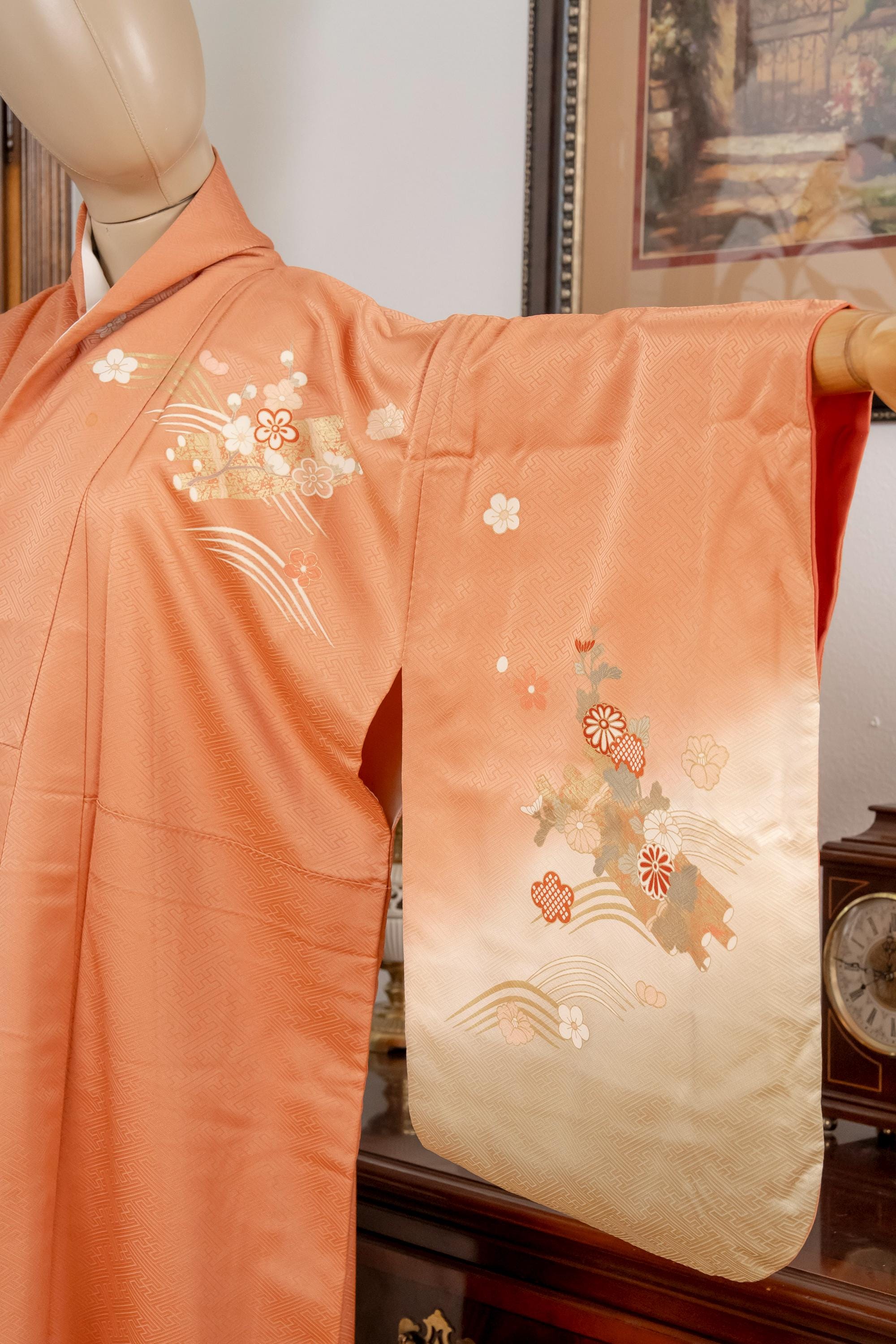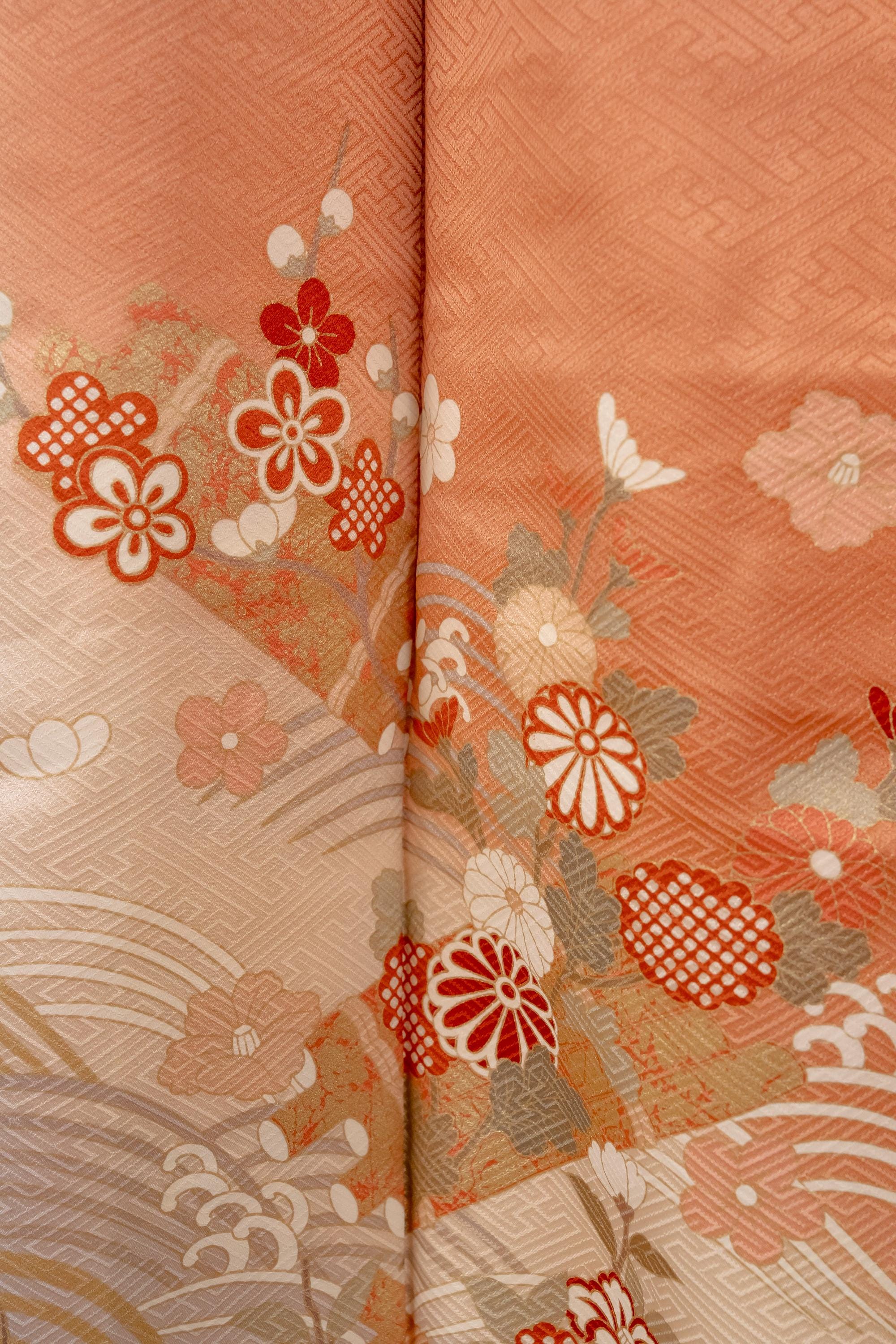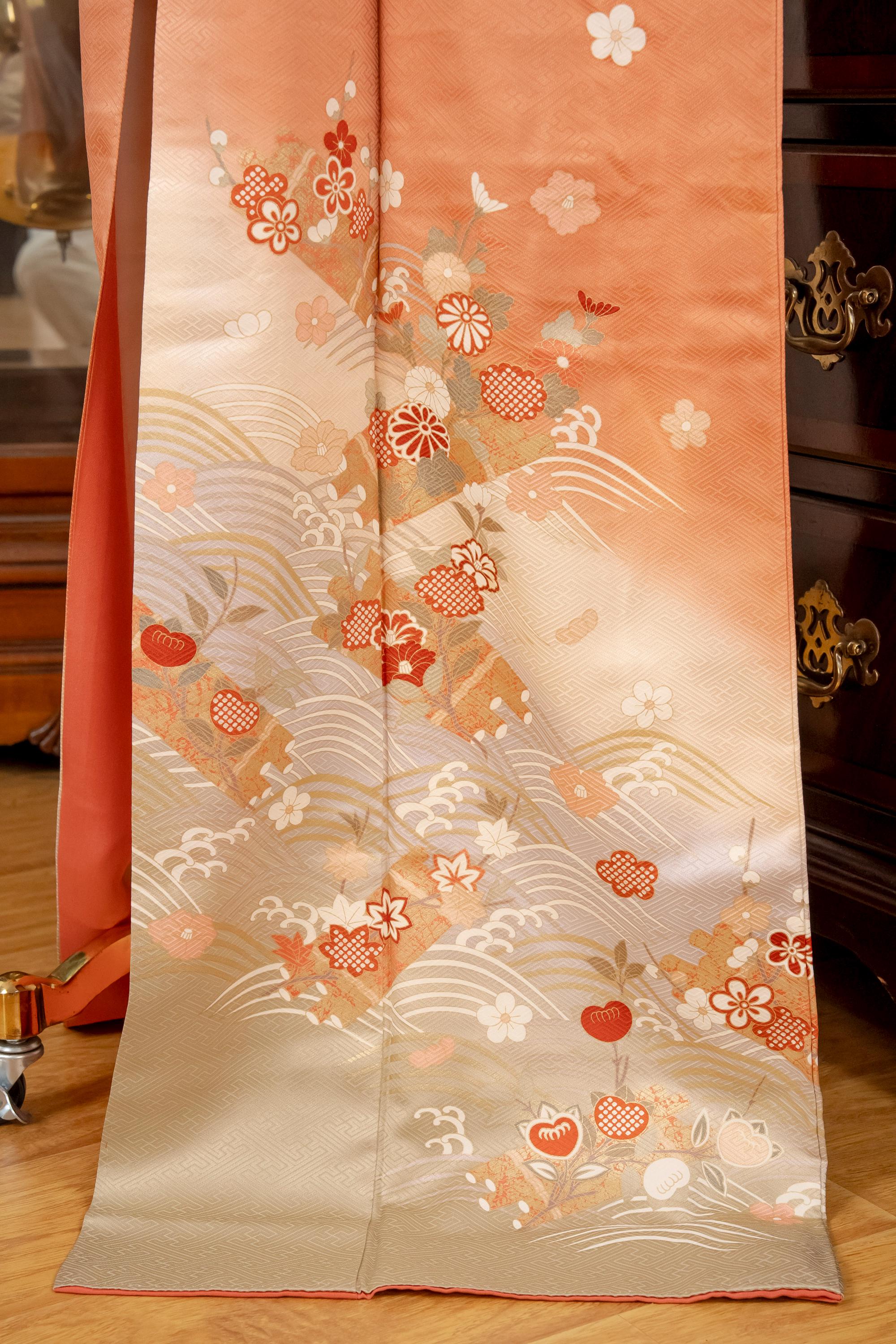 Homongi is a high-class formal Kimono for official visits that became very popular in Meiji period among upper-class females. It is commonly worn as a festive garment for ceremonies and parties by both married and unmarried women. Linked patterns on the chest, shoulder, sleeves and family crests are distinct characteristics of Homongi Kimono.