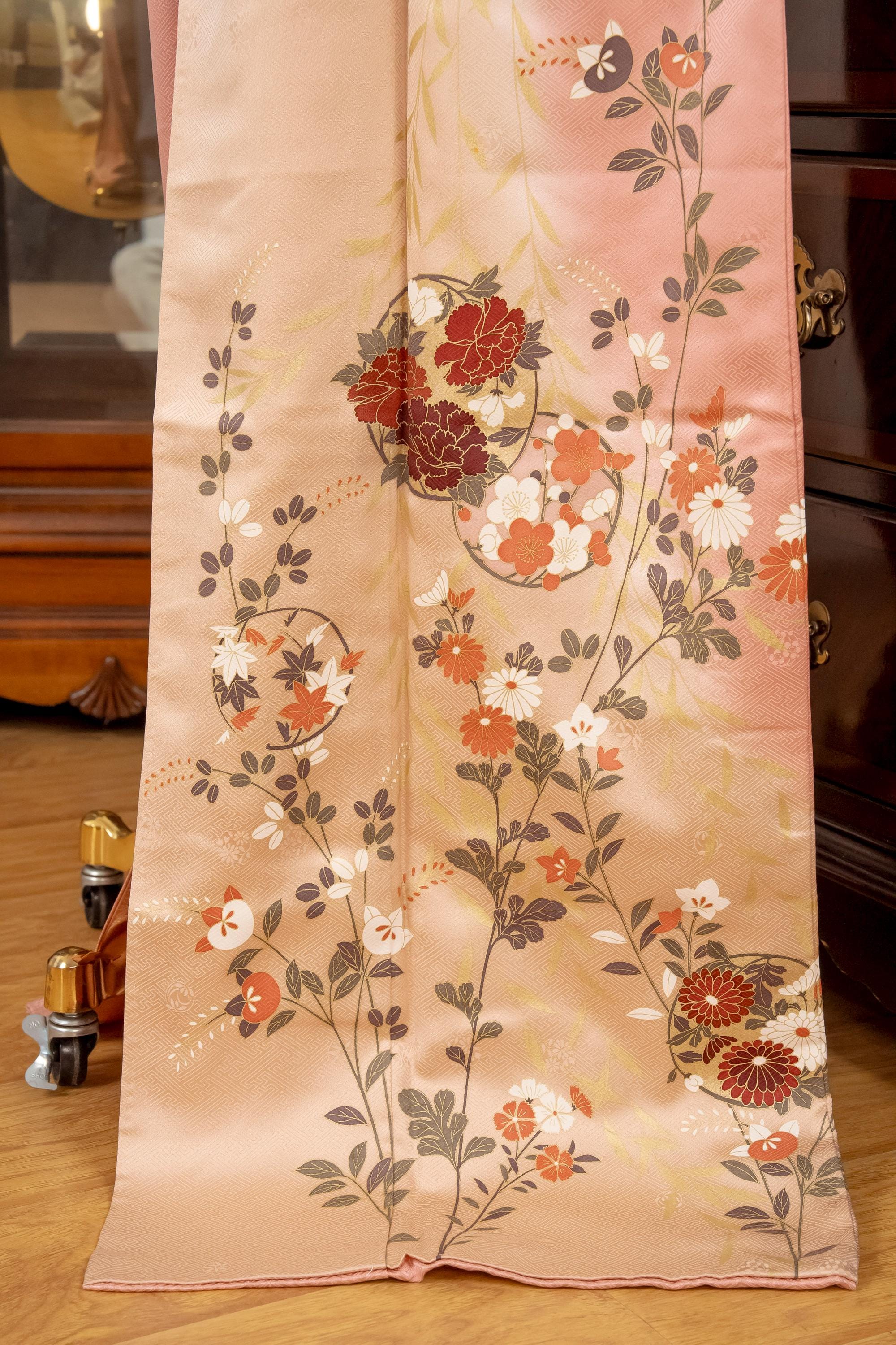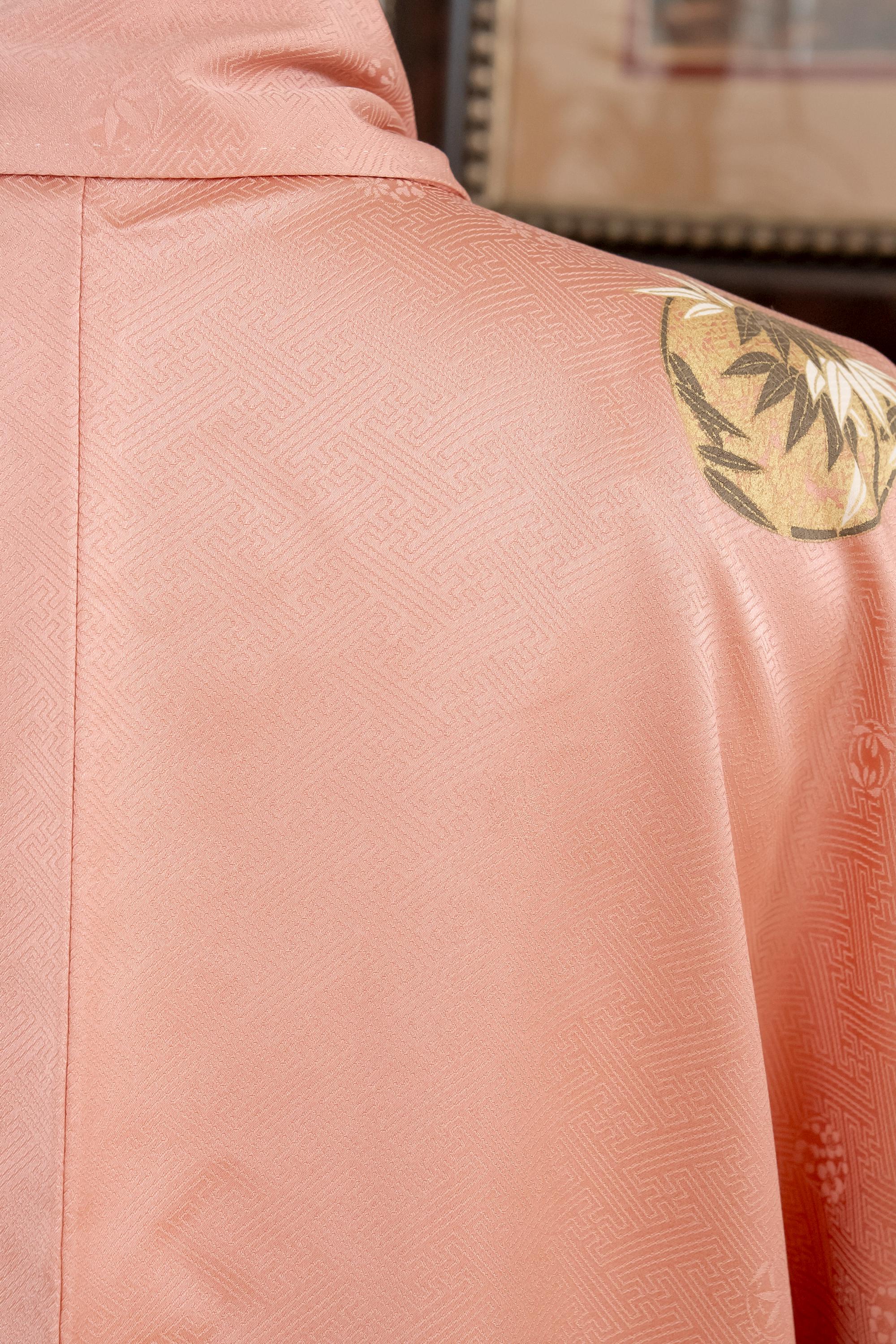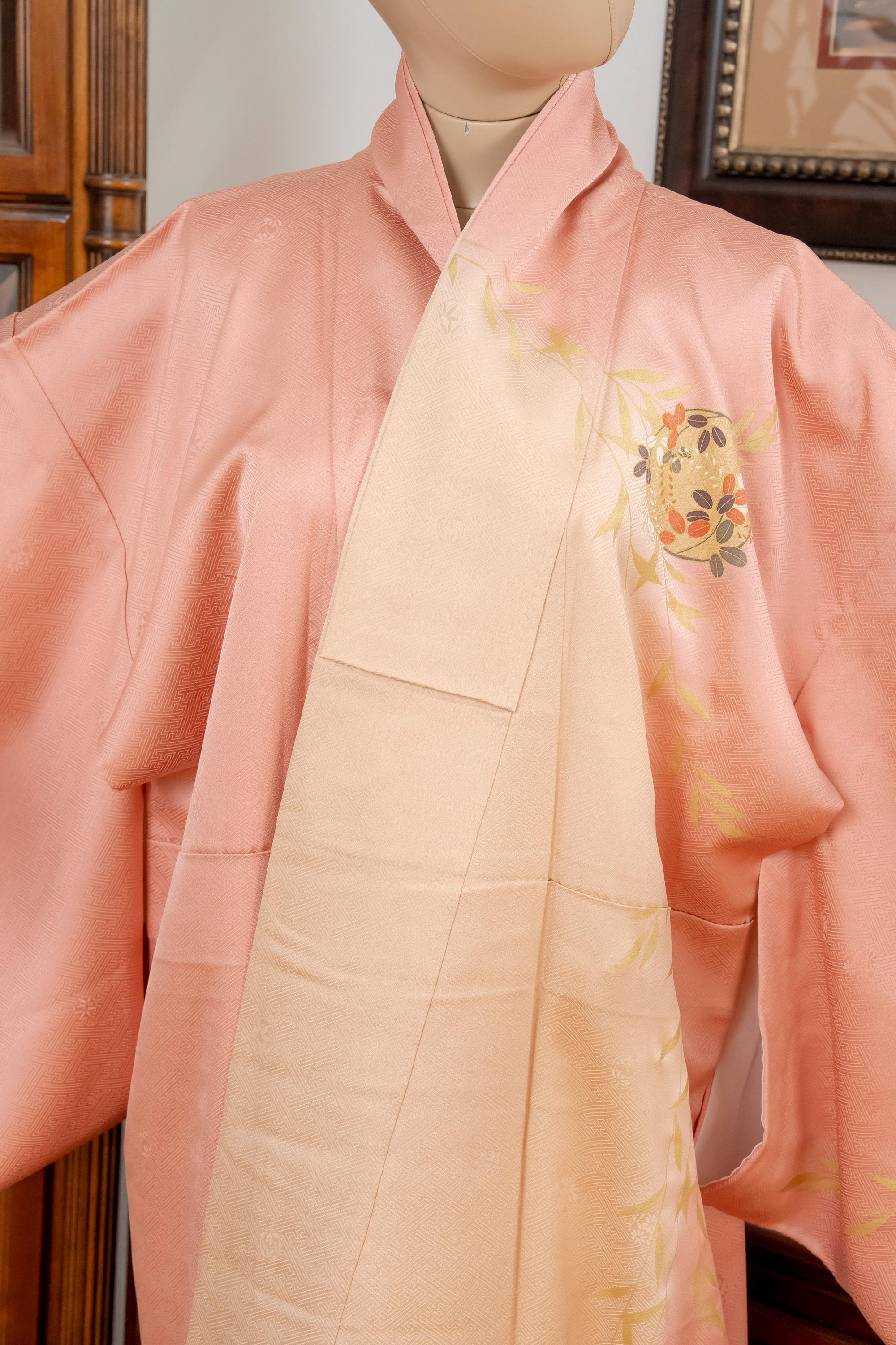 Homongi is a high-class formal Kimono for official visits that became very popular in Meiji period among upper-class females. It is commonly worn as a festive garment for ceremonies and parties by both married and unmarried women. Linked patterns on the chest, shoulder, sleeves and family crests are distinct characteristics of Homongi Kimono.