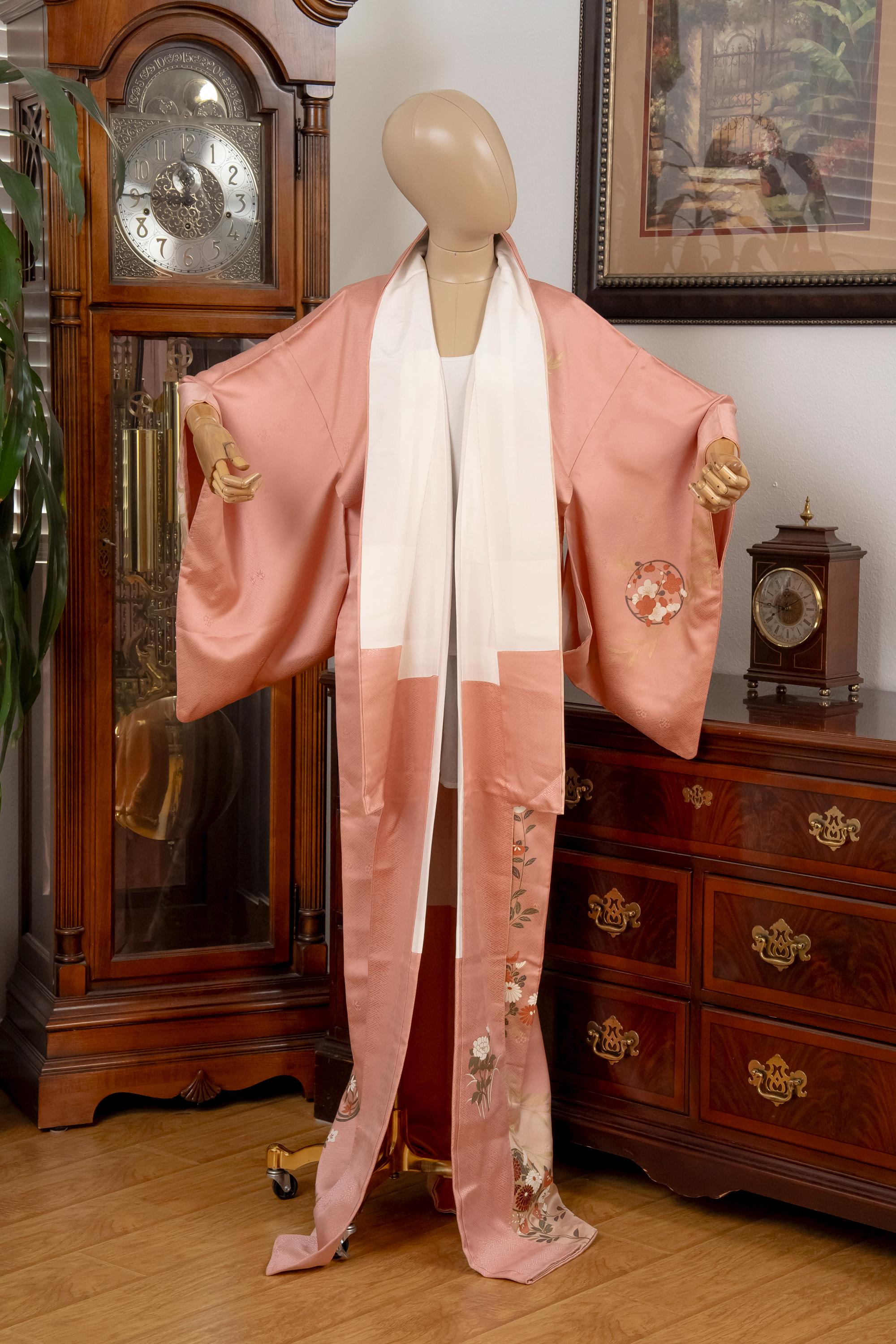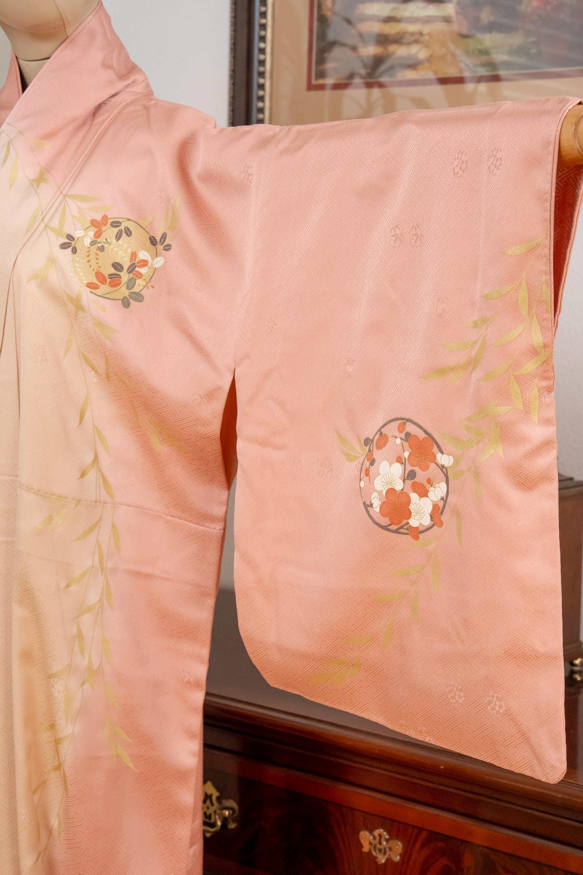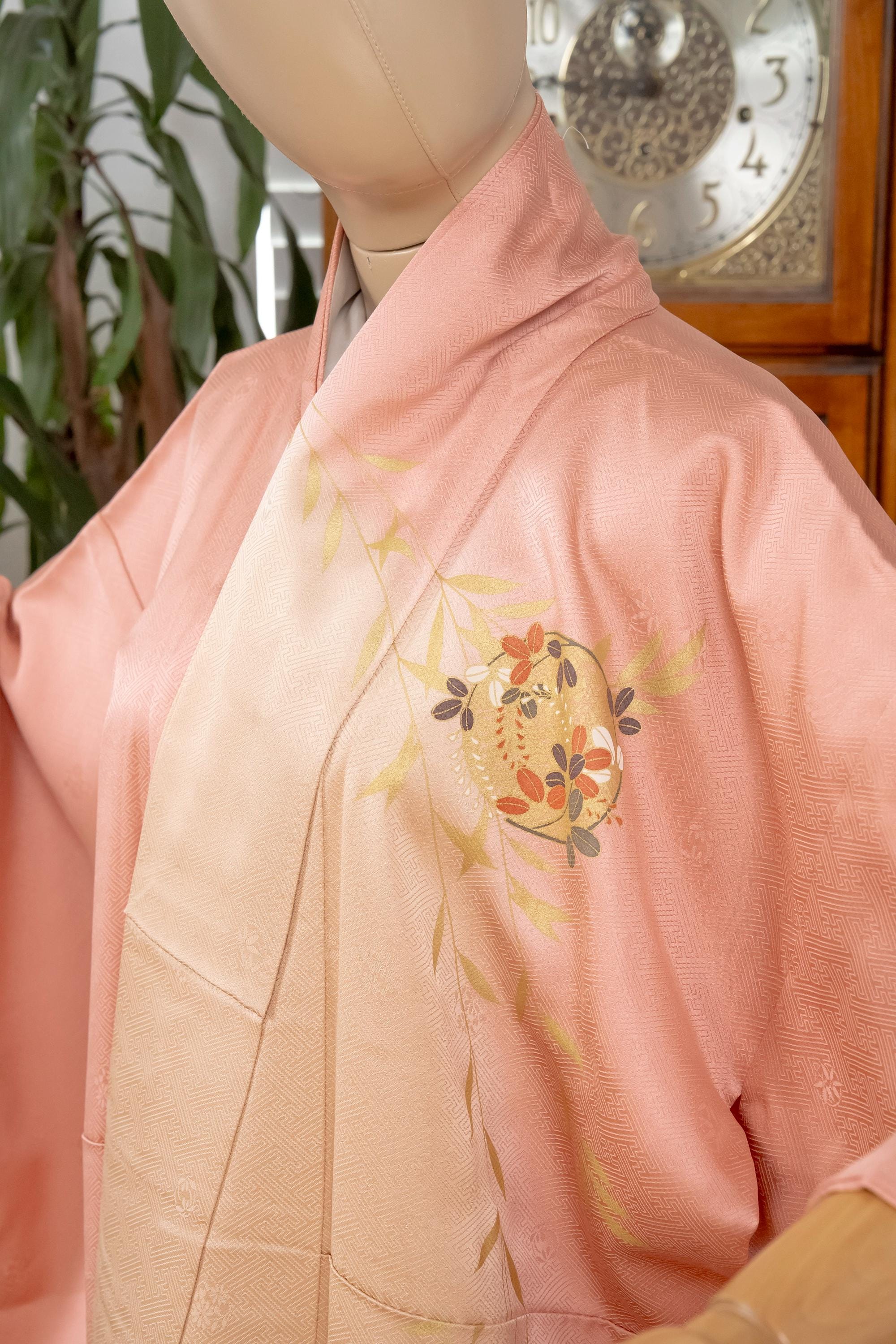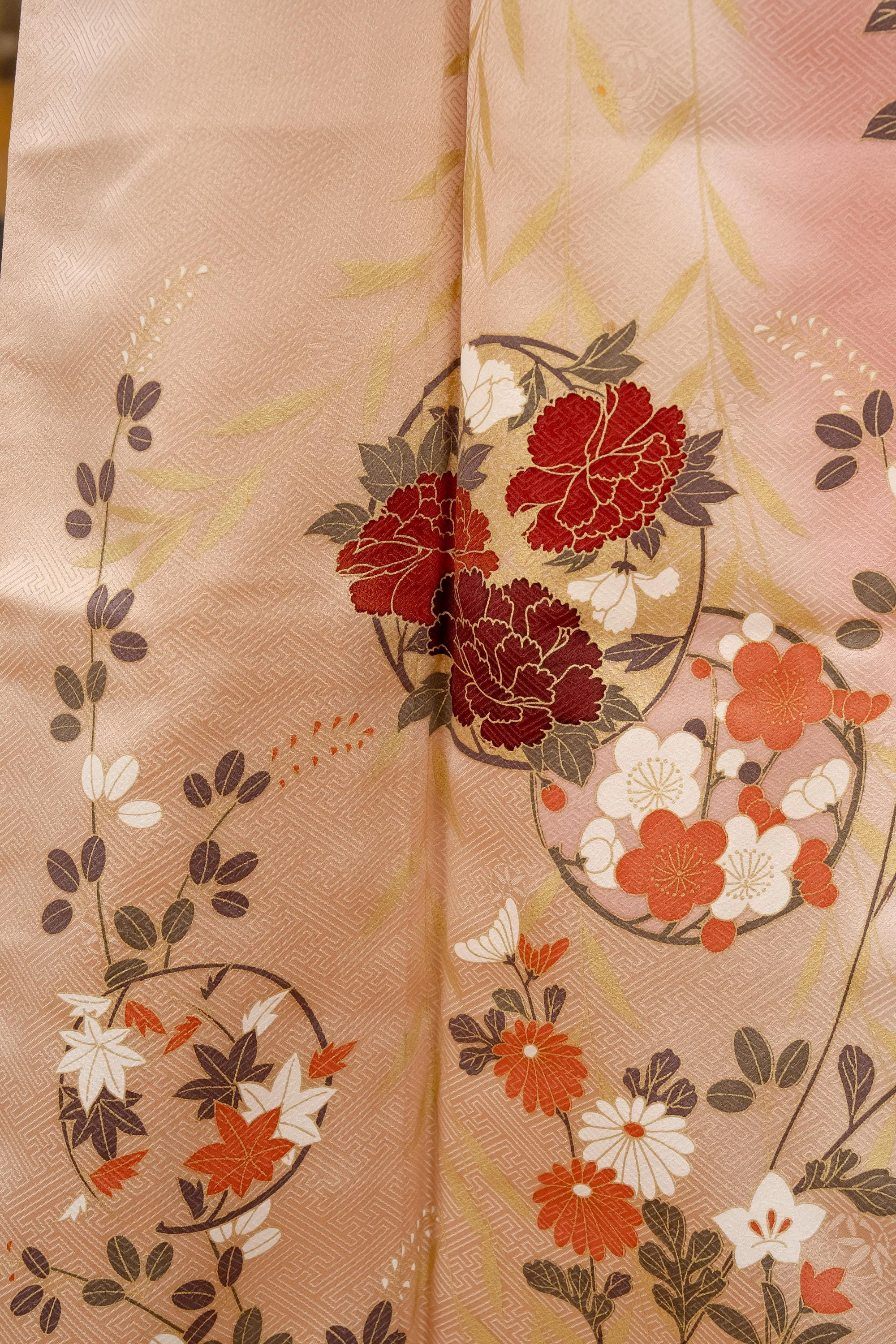 Homongi is a high-class formal Kimono for official visits that became very popular in Meiji period among upper-class females. It is commonly worn as a festive garment for ceremonies and parties by both married and unmarried women. Linked patterns on the chest, shoulder, sleeves and family crests are distinct characteristics of Homongi Kimono.