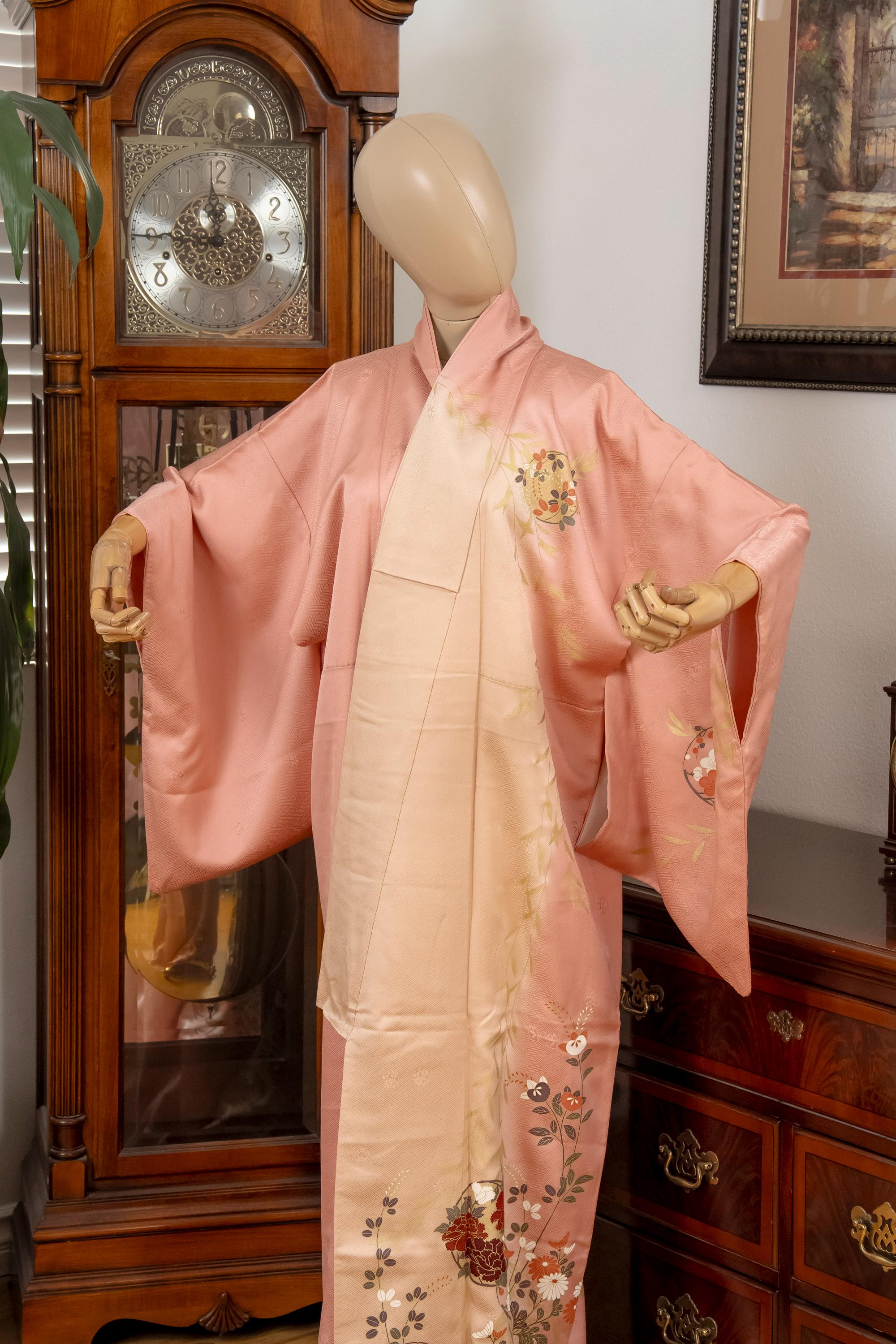 Please keep in mind that female Kimonos are supposed to fit long. You will need to adjust the length to your size by tying with Kitsuke accessories and Obi belt.