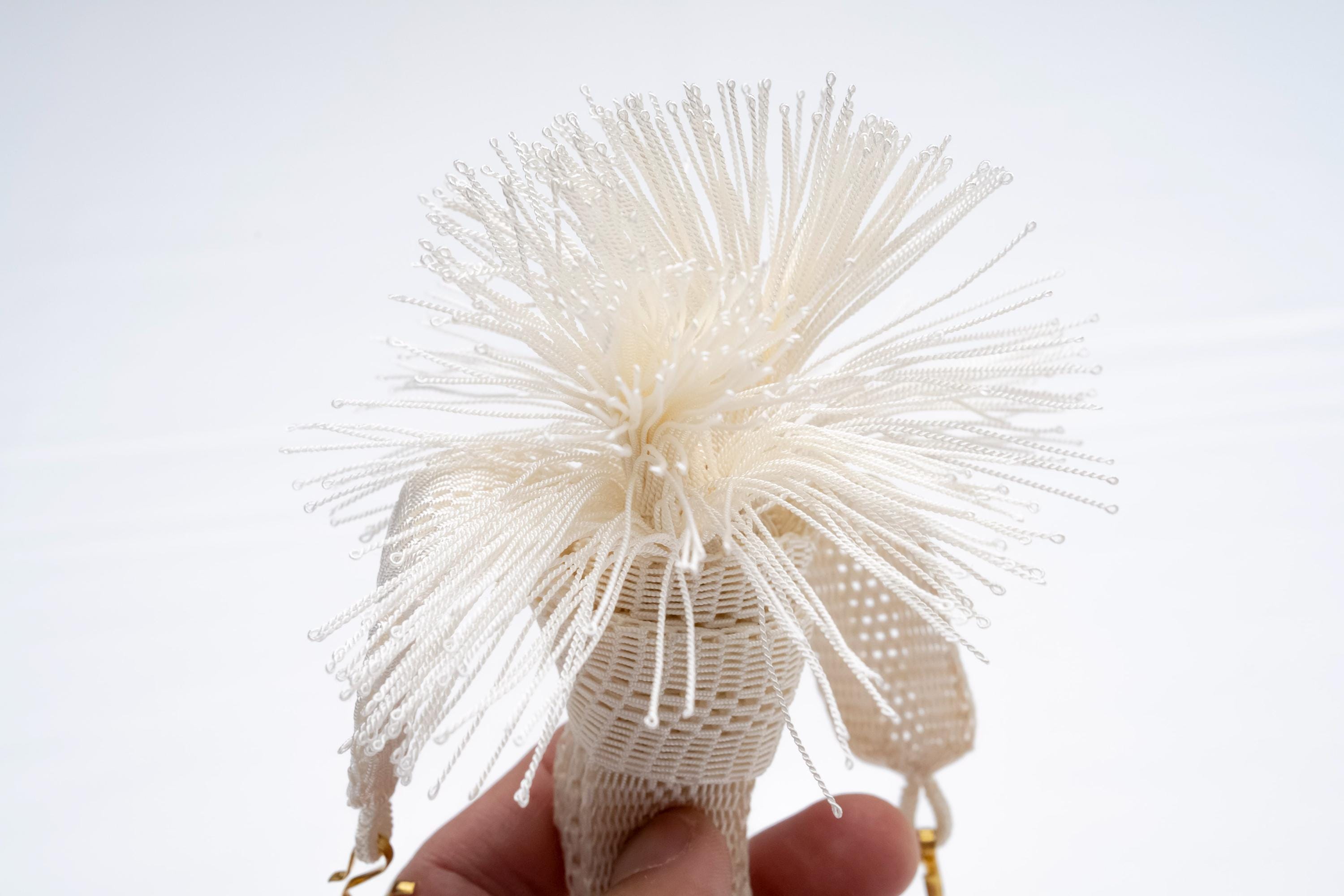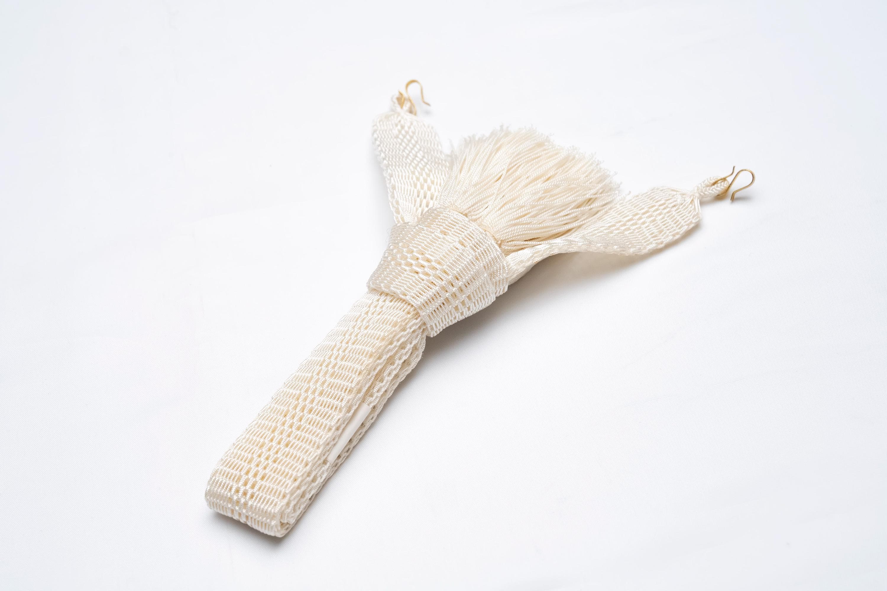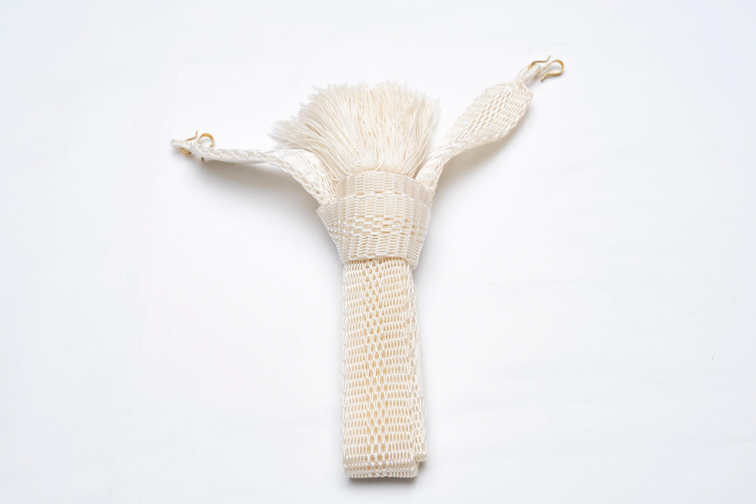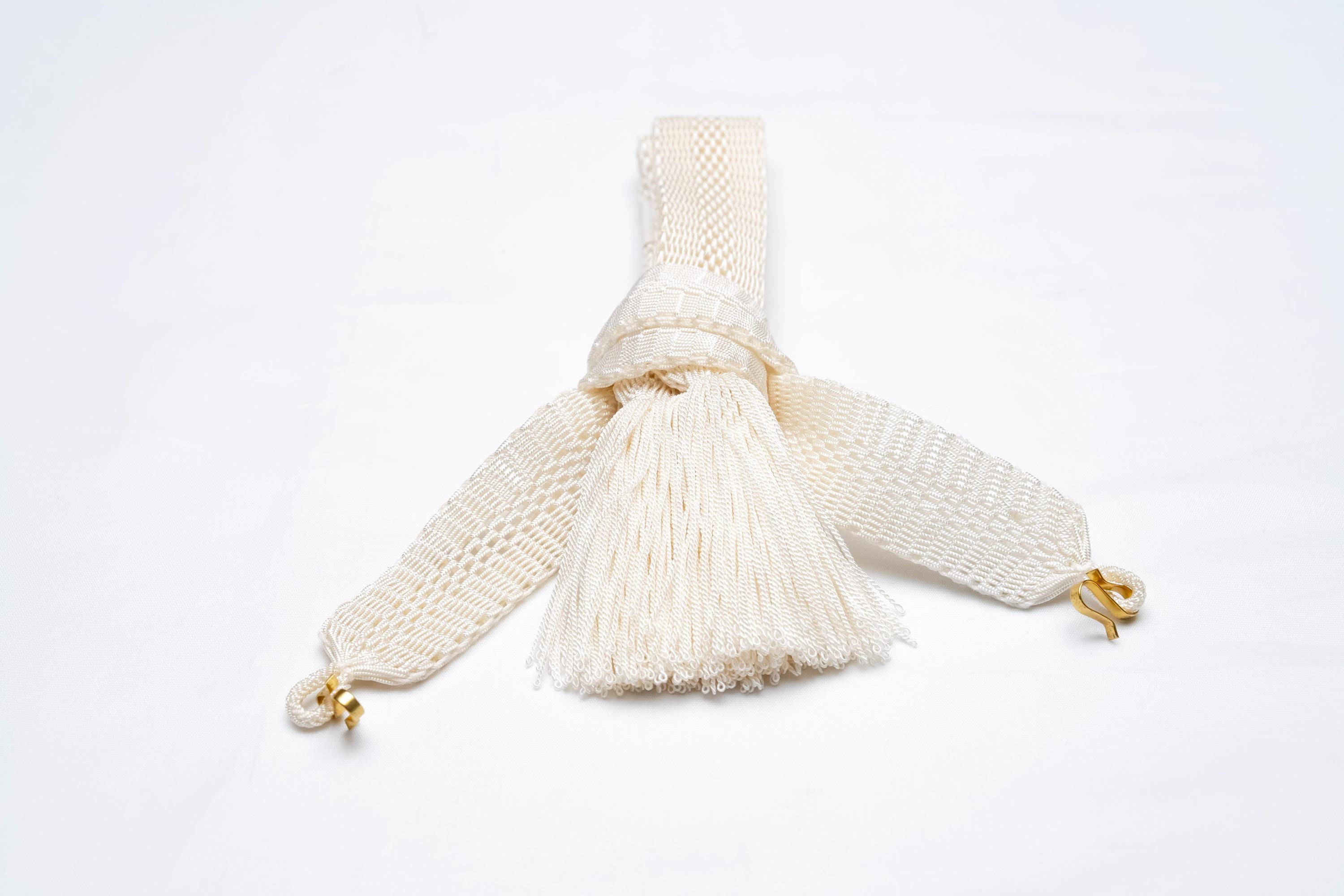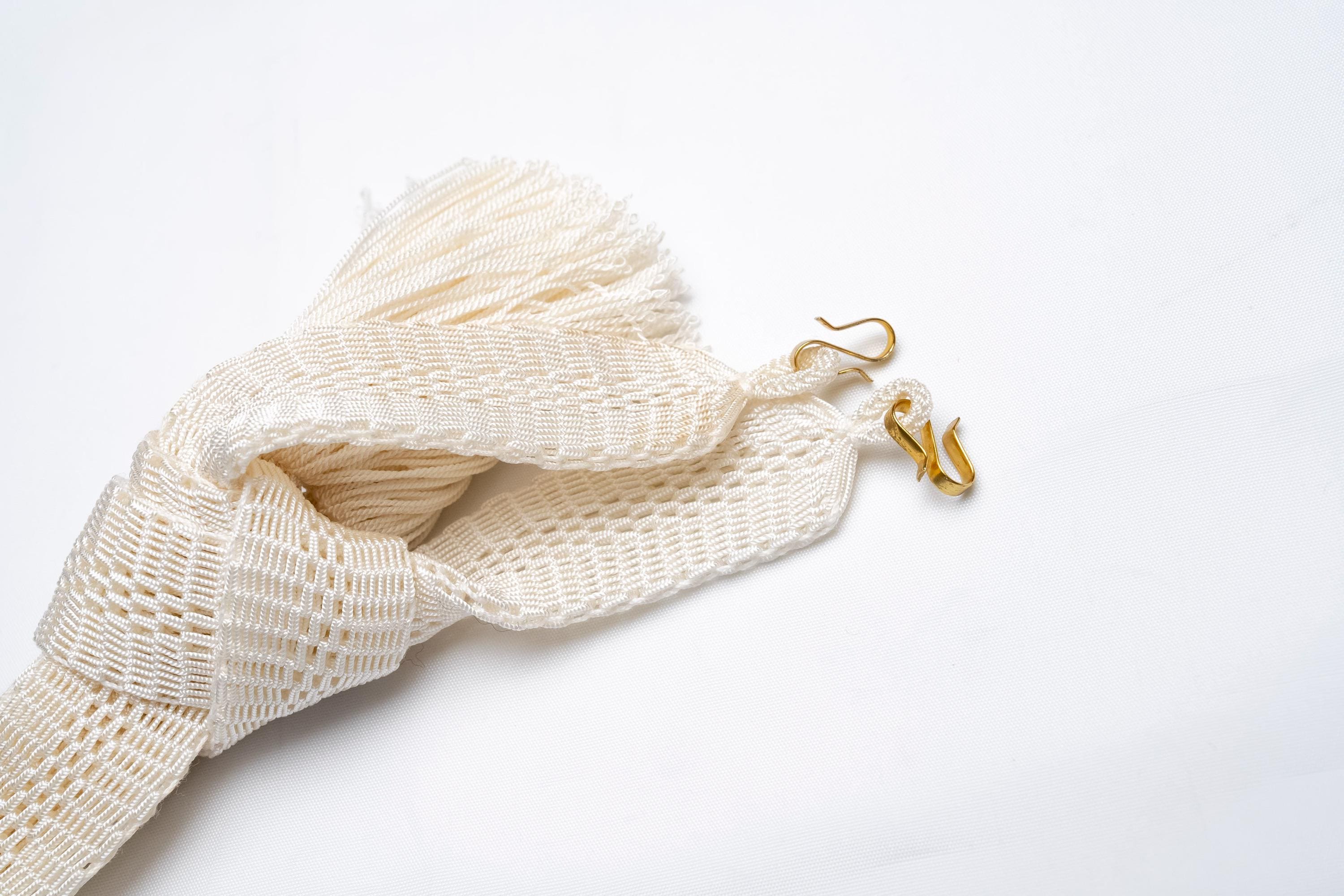 Haorihimos are short, woven cords being attached to inside seam of Haori collar as a formal accessory. They generally come with hooks on ends of the cord that will hang on to the loops on each side of Haori collar making a floating tassel decoration in the center.