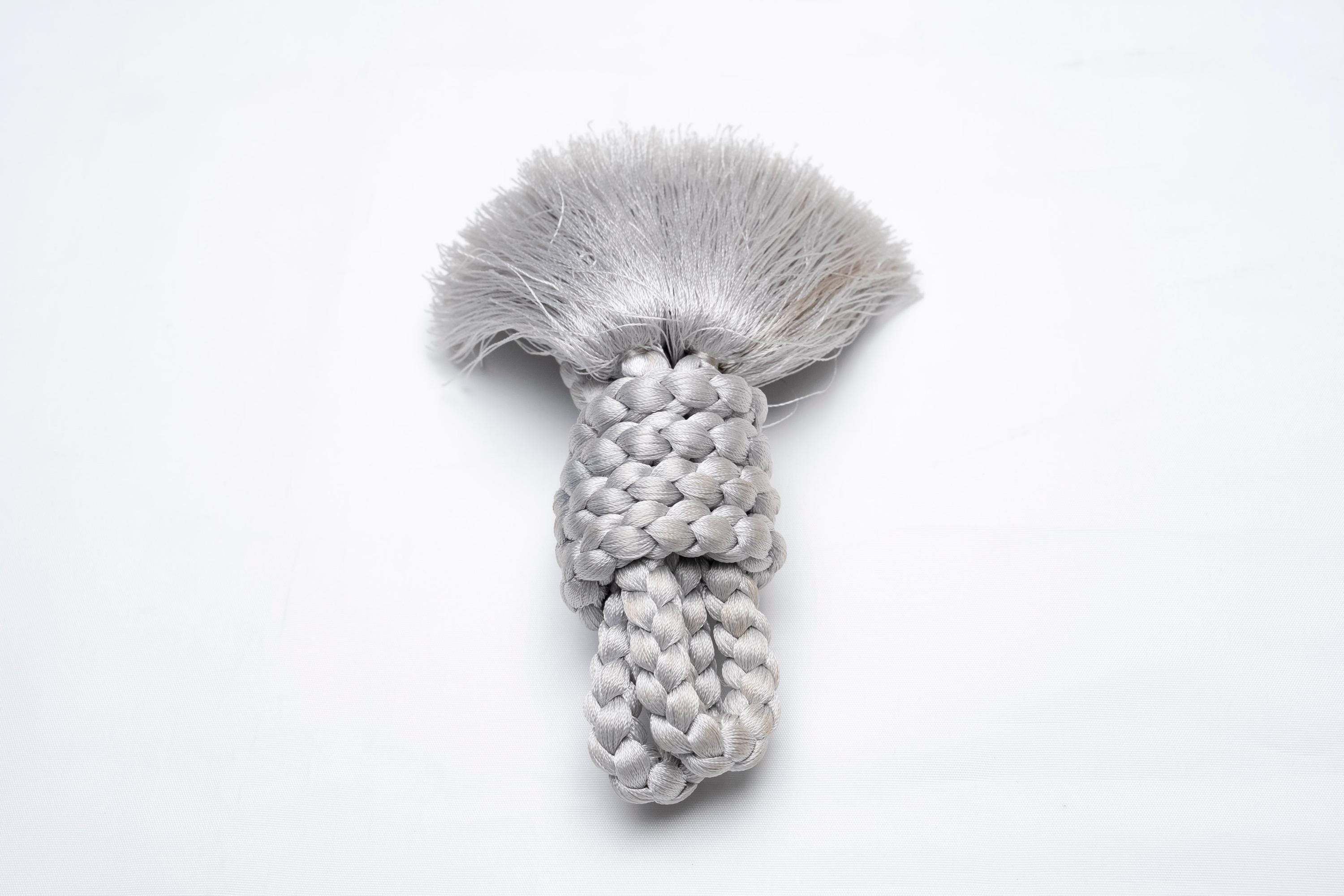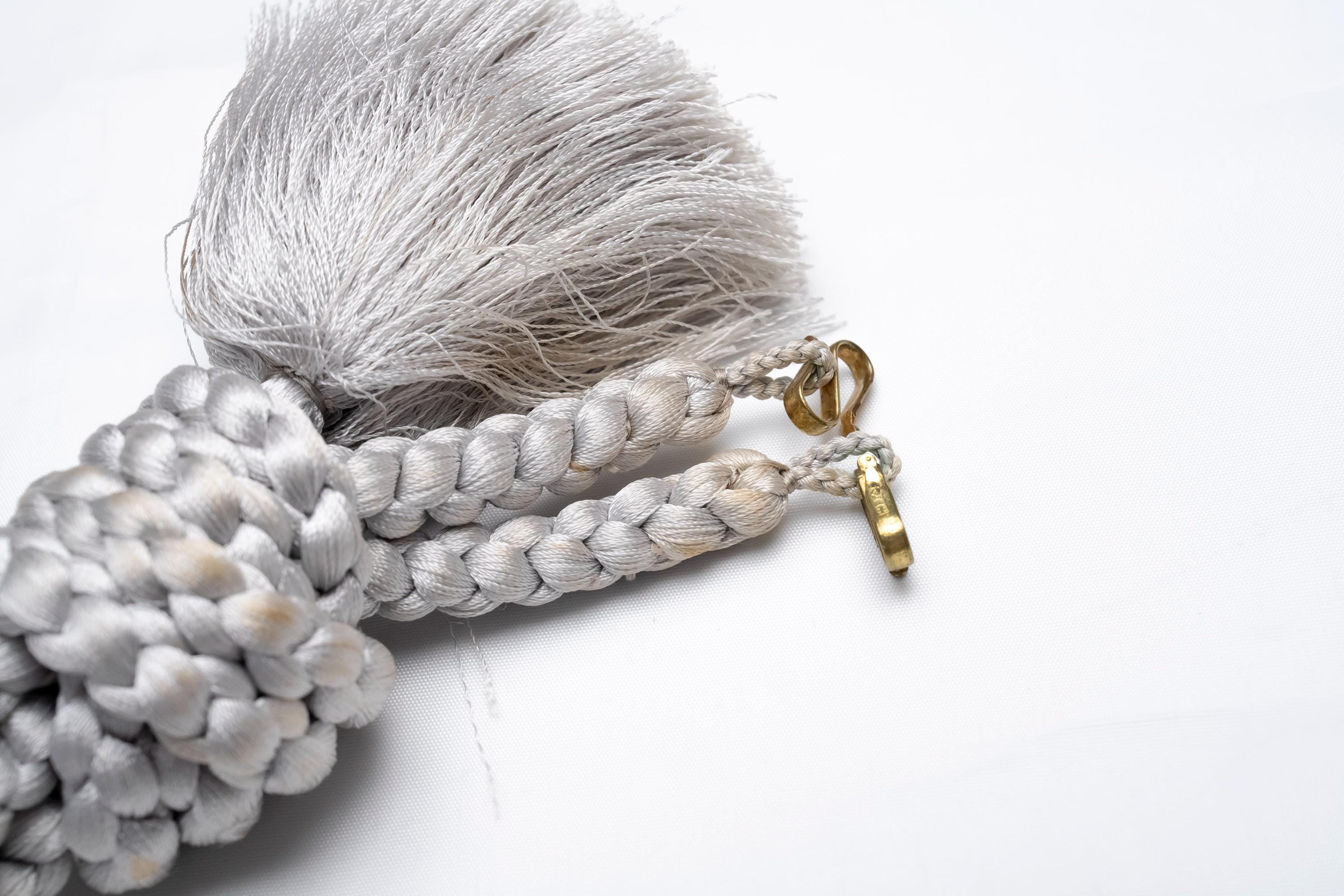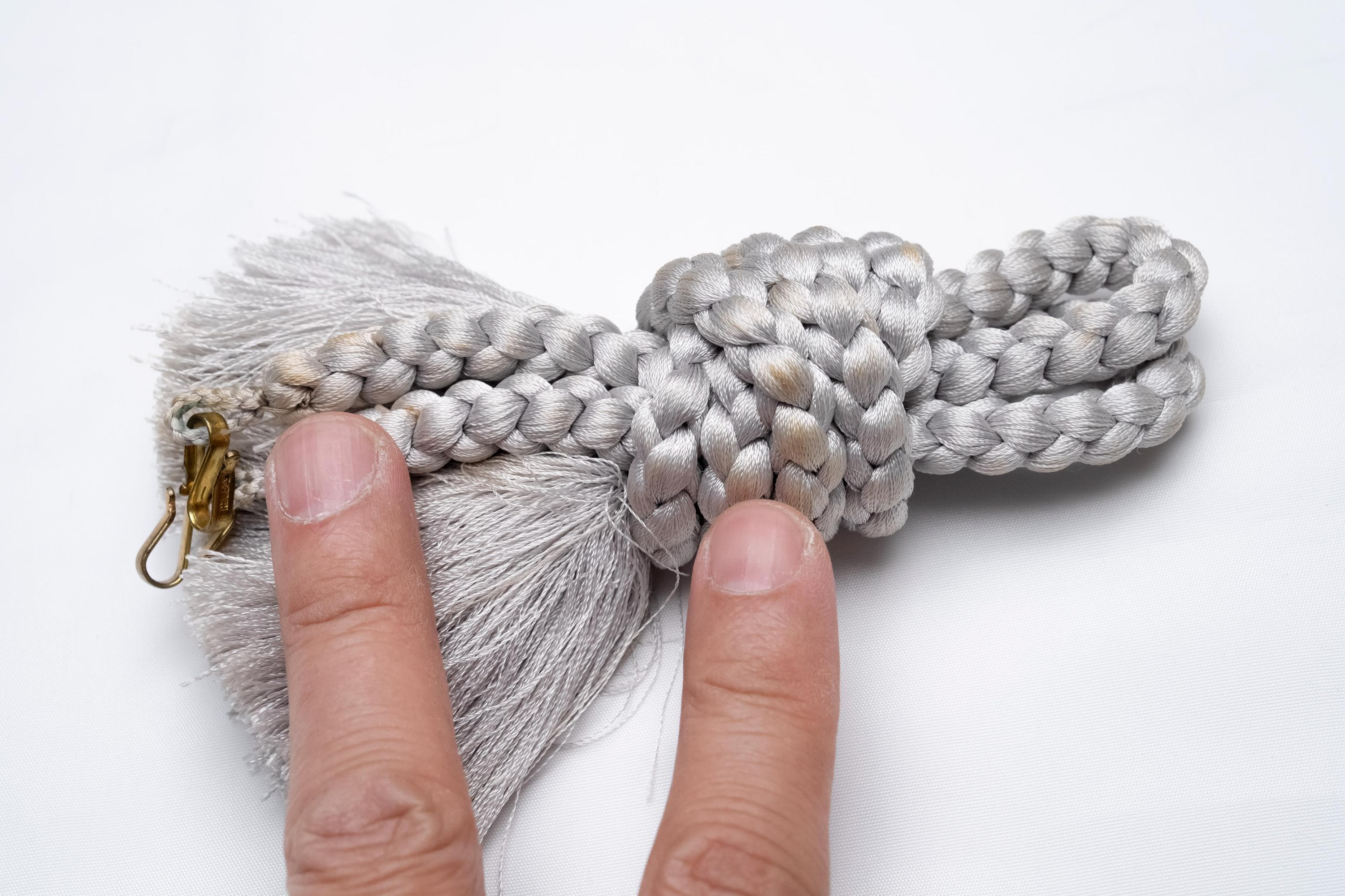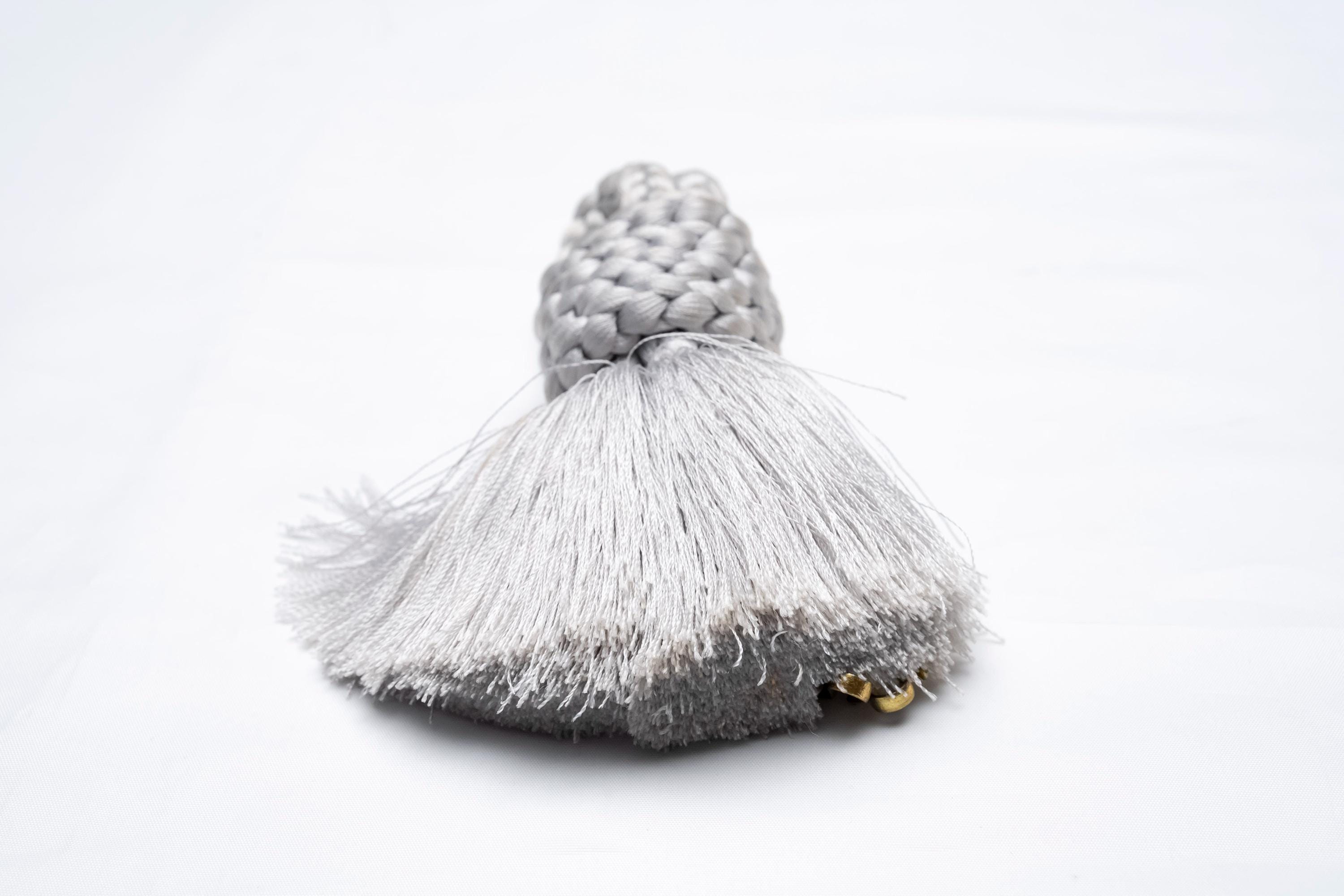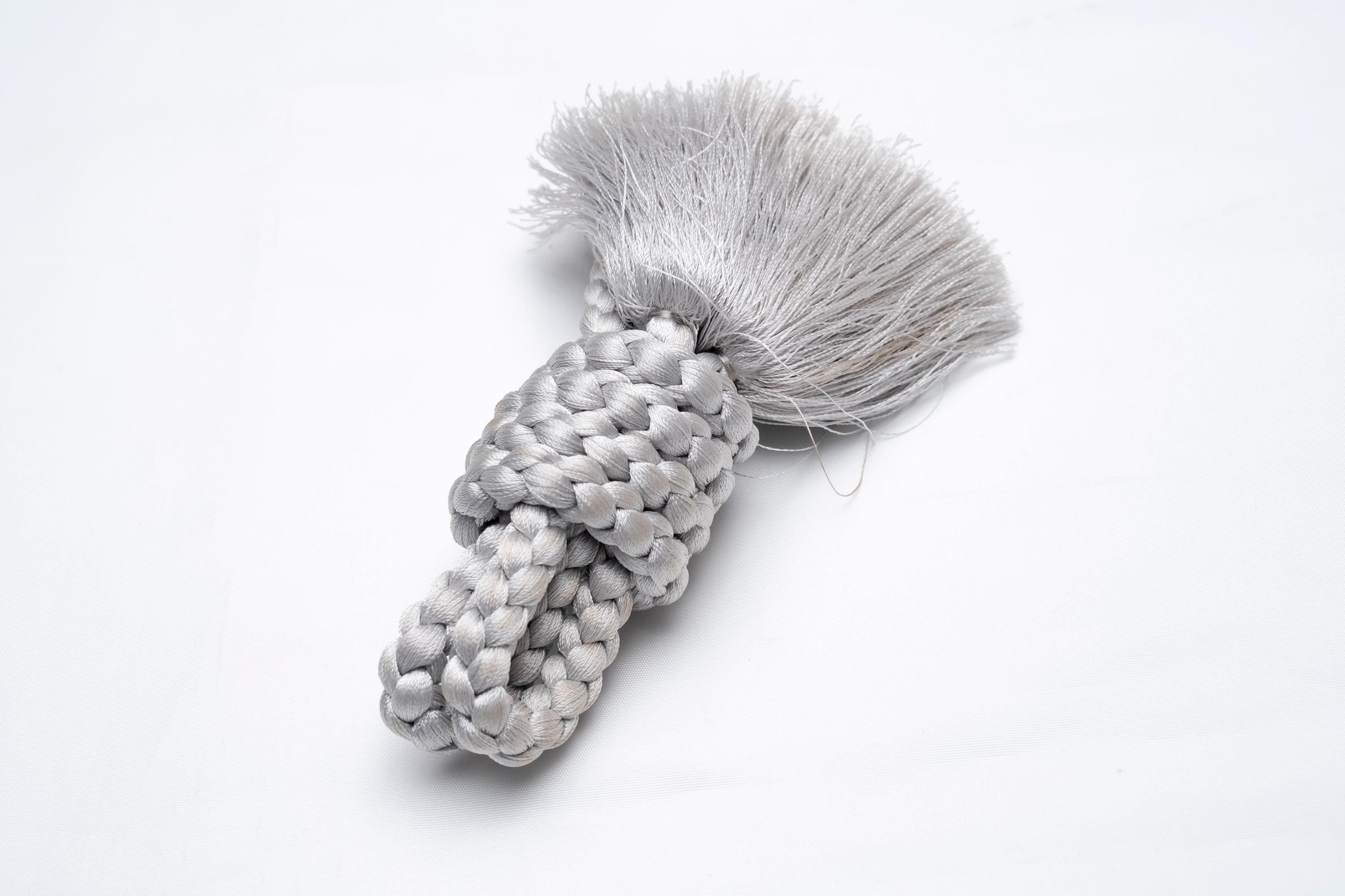 Haorihimos are short, woven cords being attached to inside seam of Haori collar as a formal accessory. They generally come with hooks on ends of the cord that will hang on to the loops on each side of Haori collar making a floating tassel decoration in the center.
