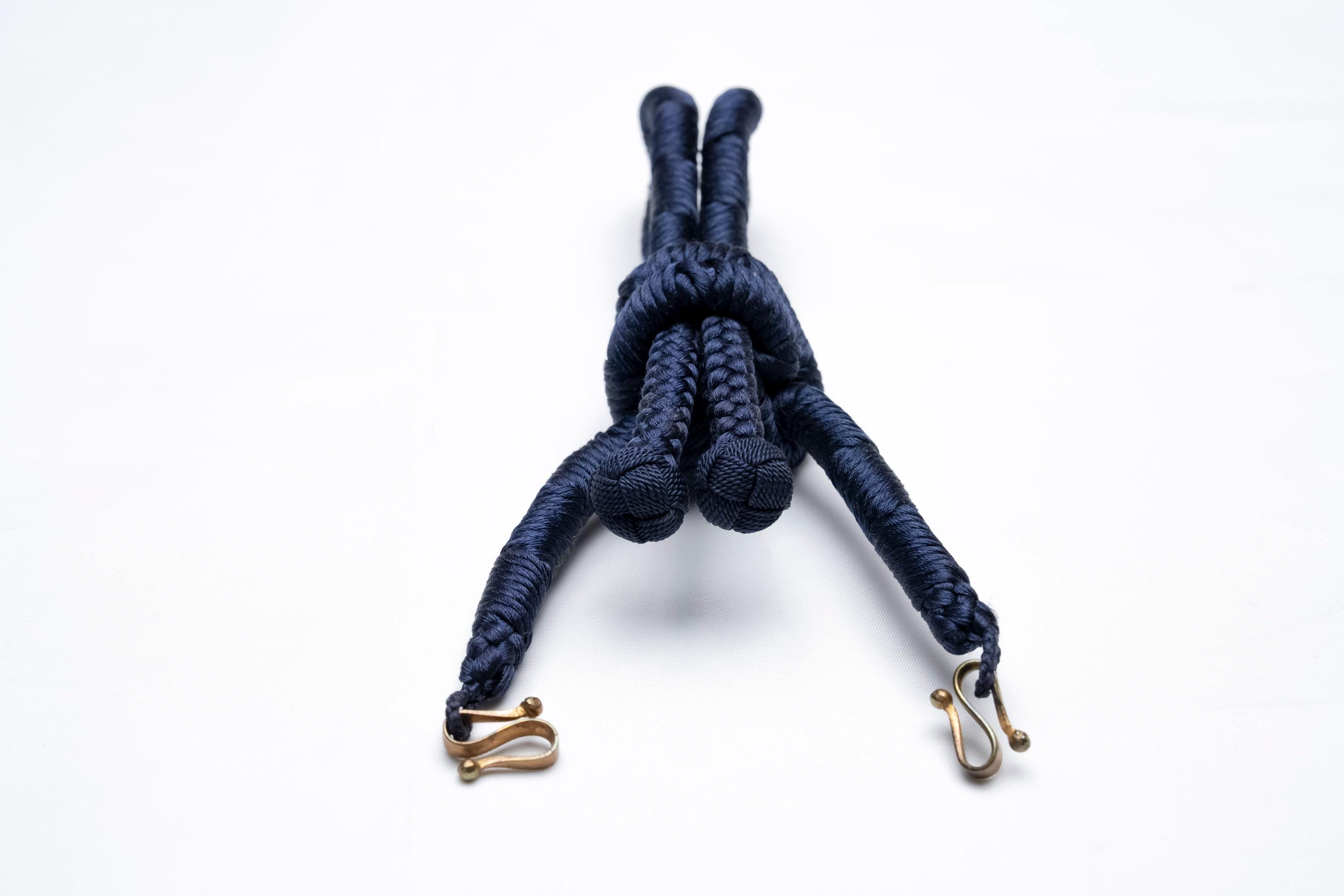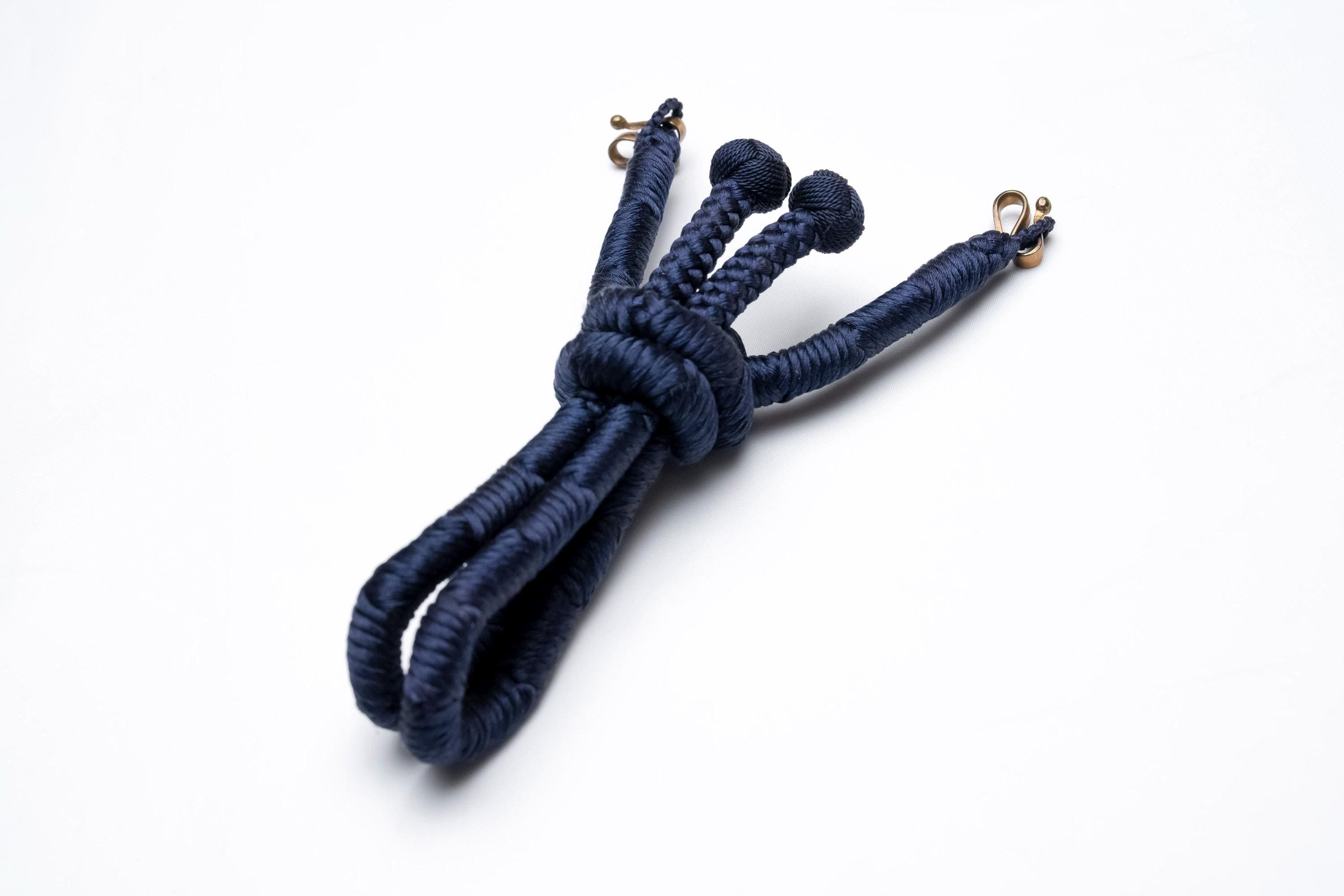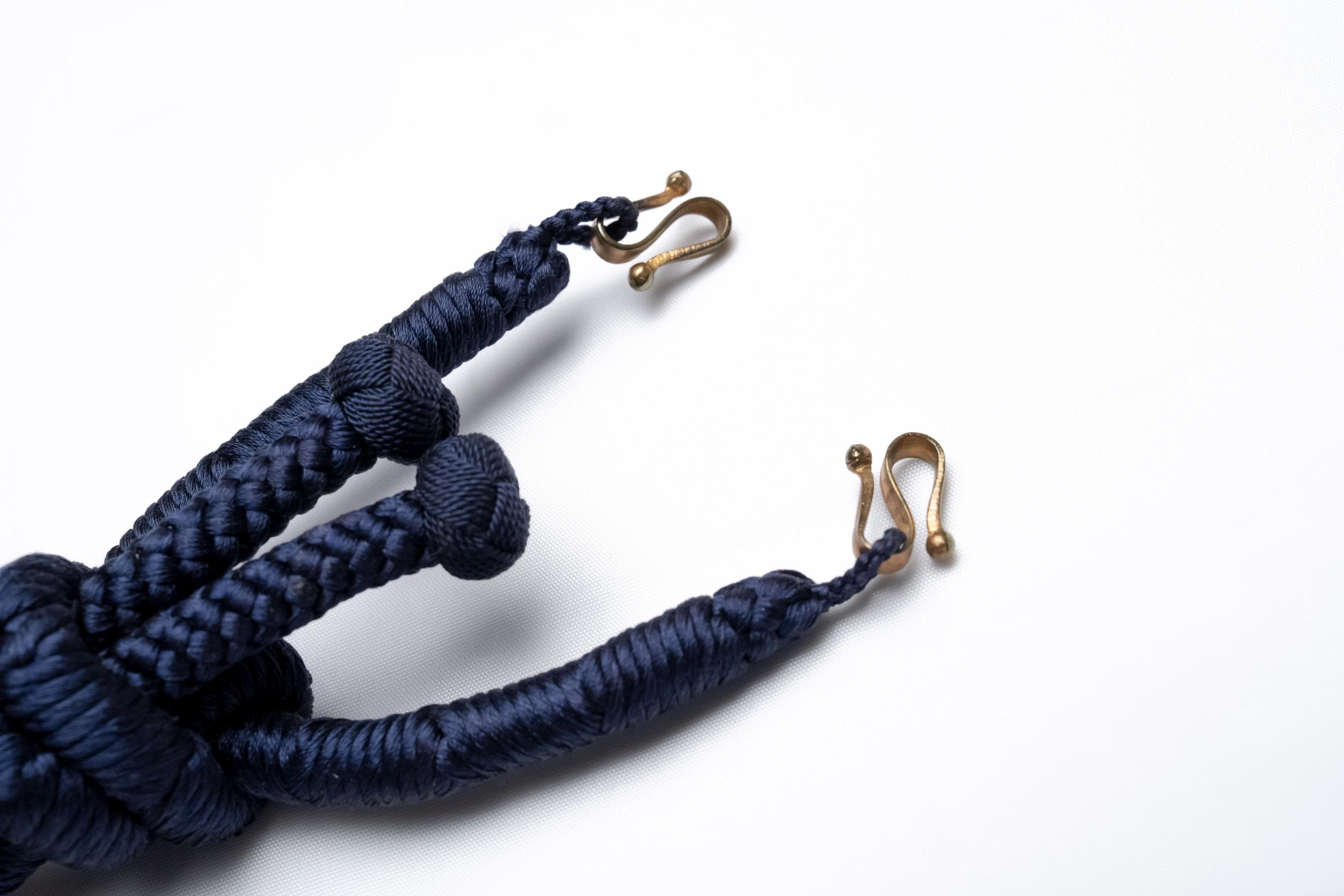 Haorihimos are short, woven cords being attached to inside seam of Haori collar as a formal accessory. They generally come with hooks on ends of the cord that will hang on to the loops on each side of Haori collar making a floating tassel decoration in the center.