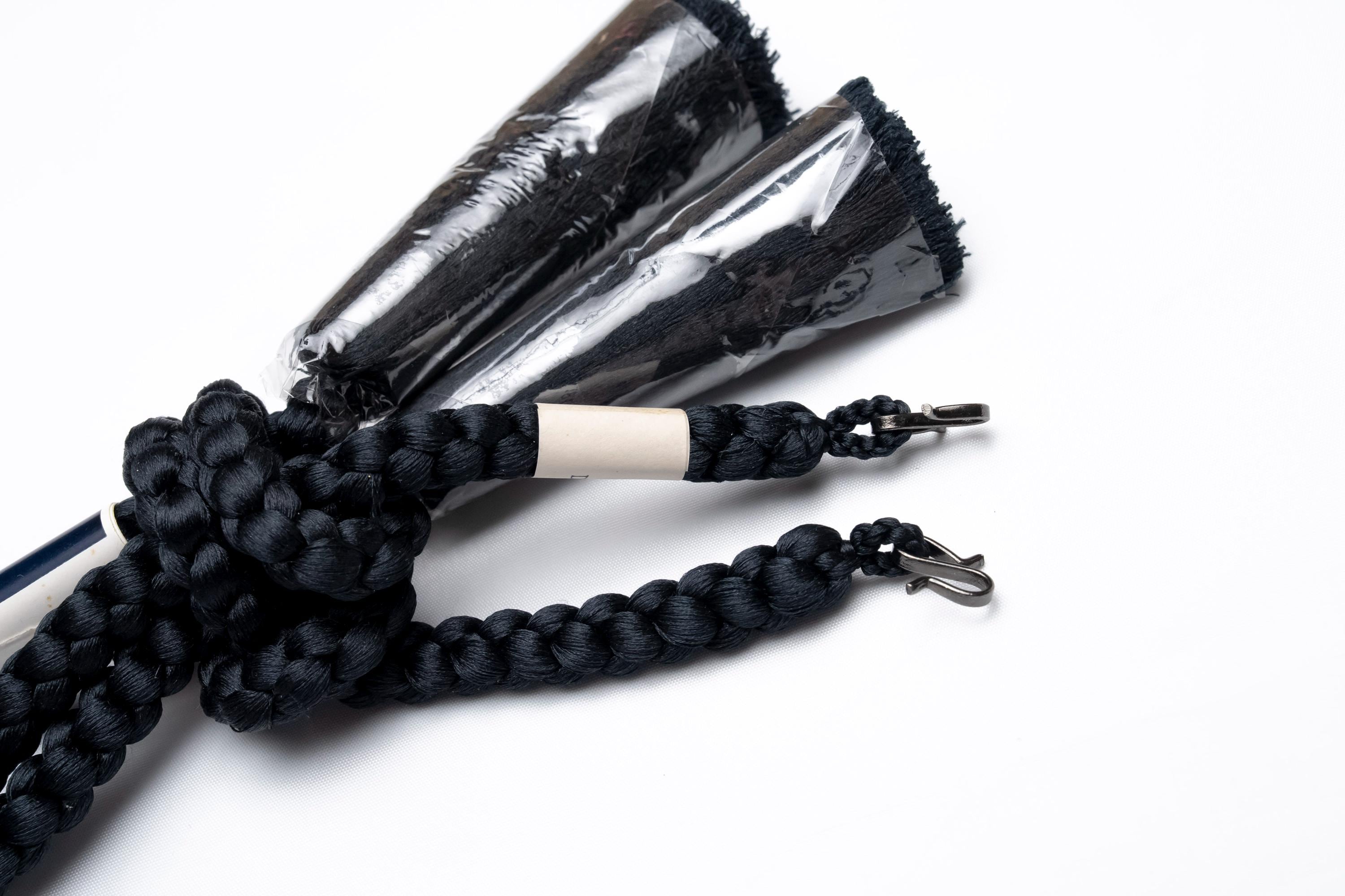 Haorihimos are short, woven cords being attached to inside seam of Haori collar as a formal accessory. They generally come with hooks on ends of the cord that will hang on to the loops on each side of Haori collar making a floating tassel decoration in the center.