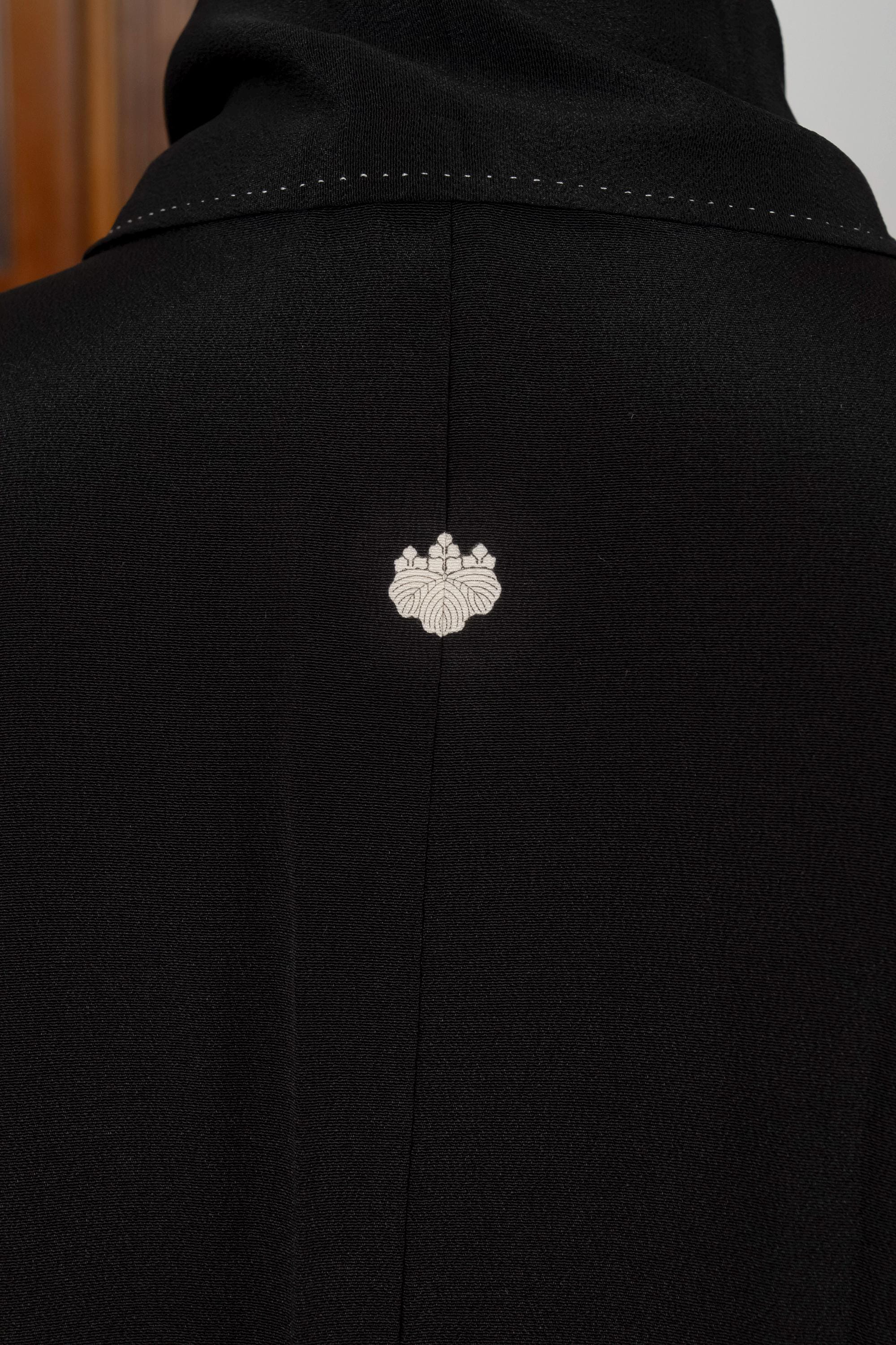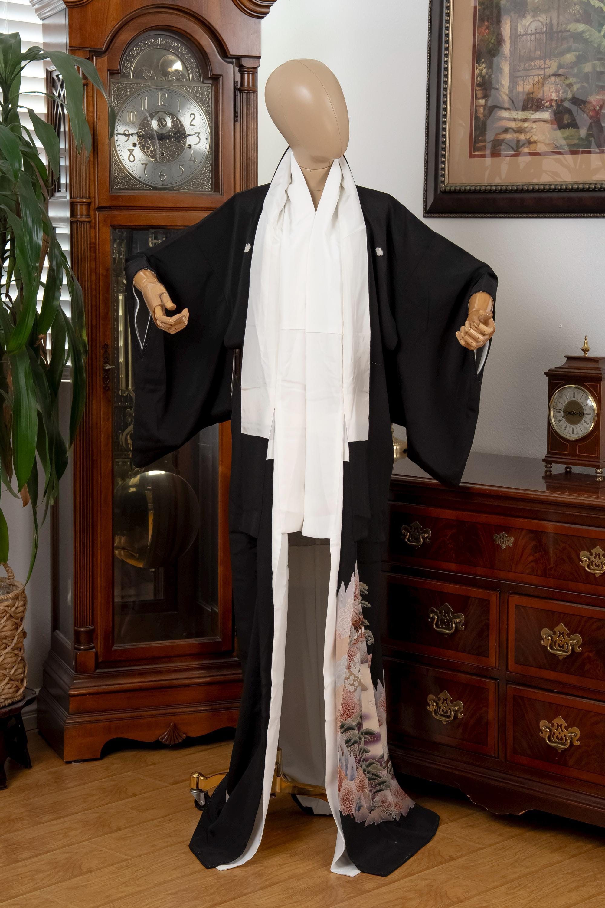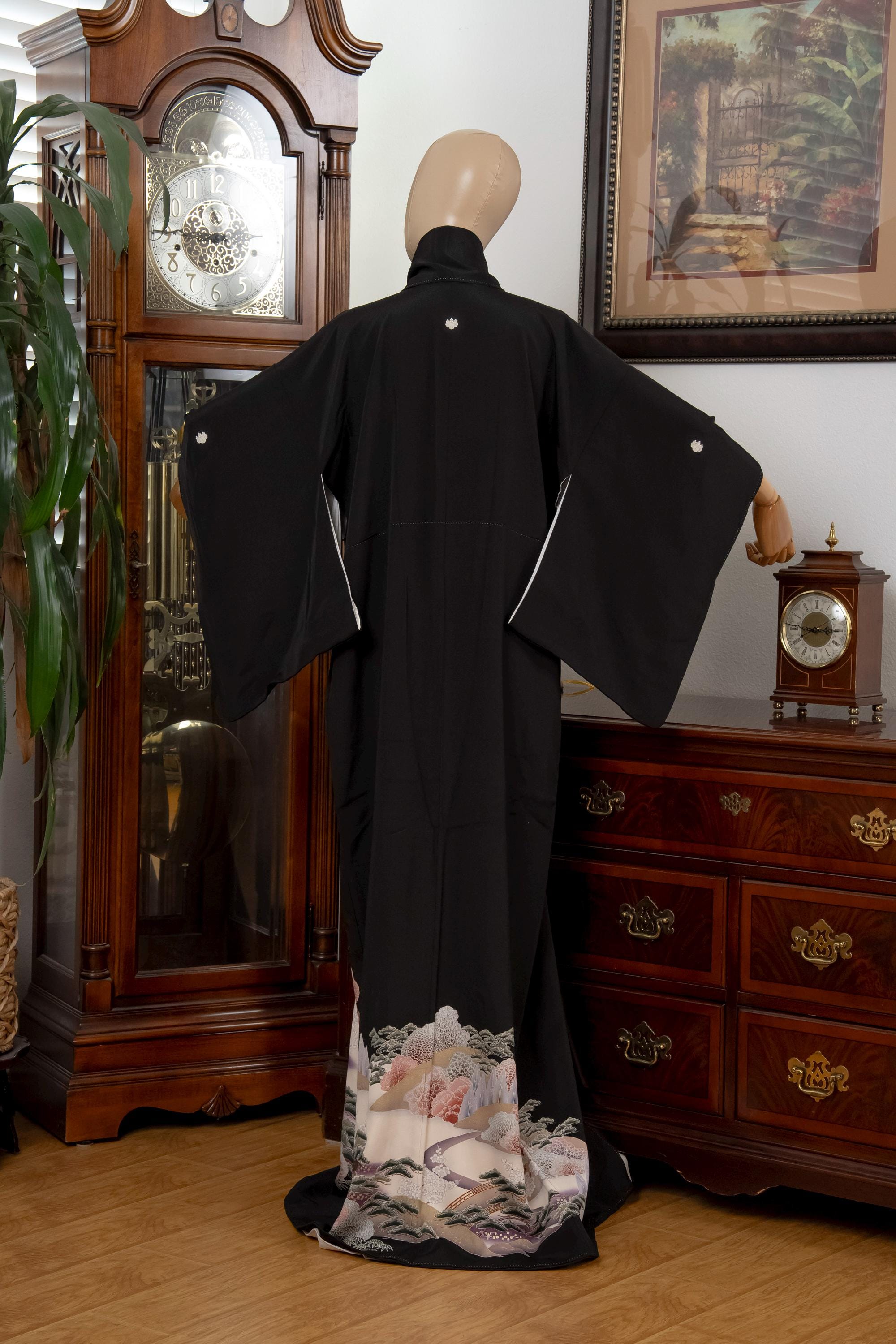 Tomesode is the most formal, high class Kimono for all ceremonies and occasions. Black ones are worn by married women and colored ones are worn by both married and unmarried women. Distinct characteristics of Tomesode are family crests and surrounding patterns around the hem. Numbers of family crests specify formality and rank.