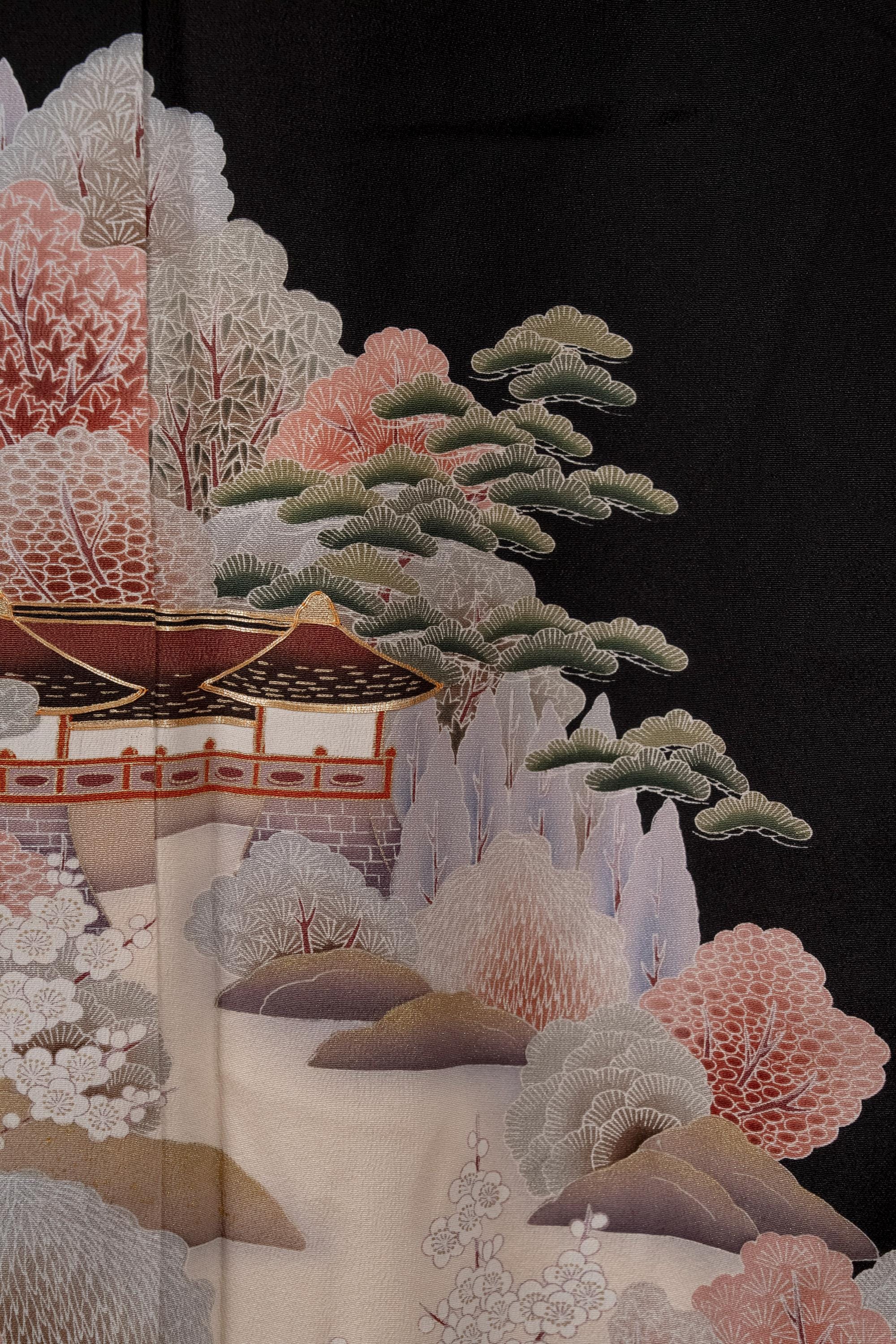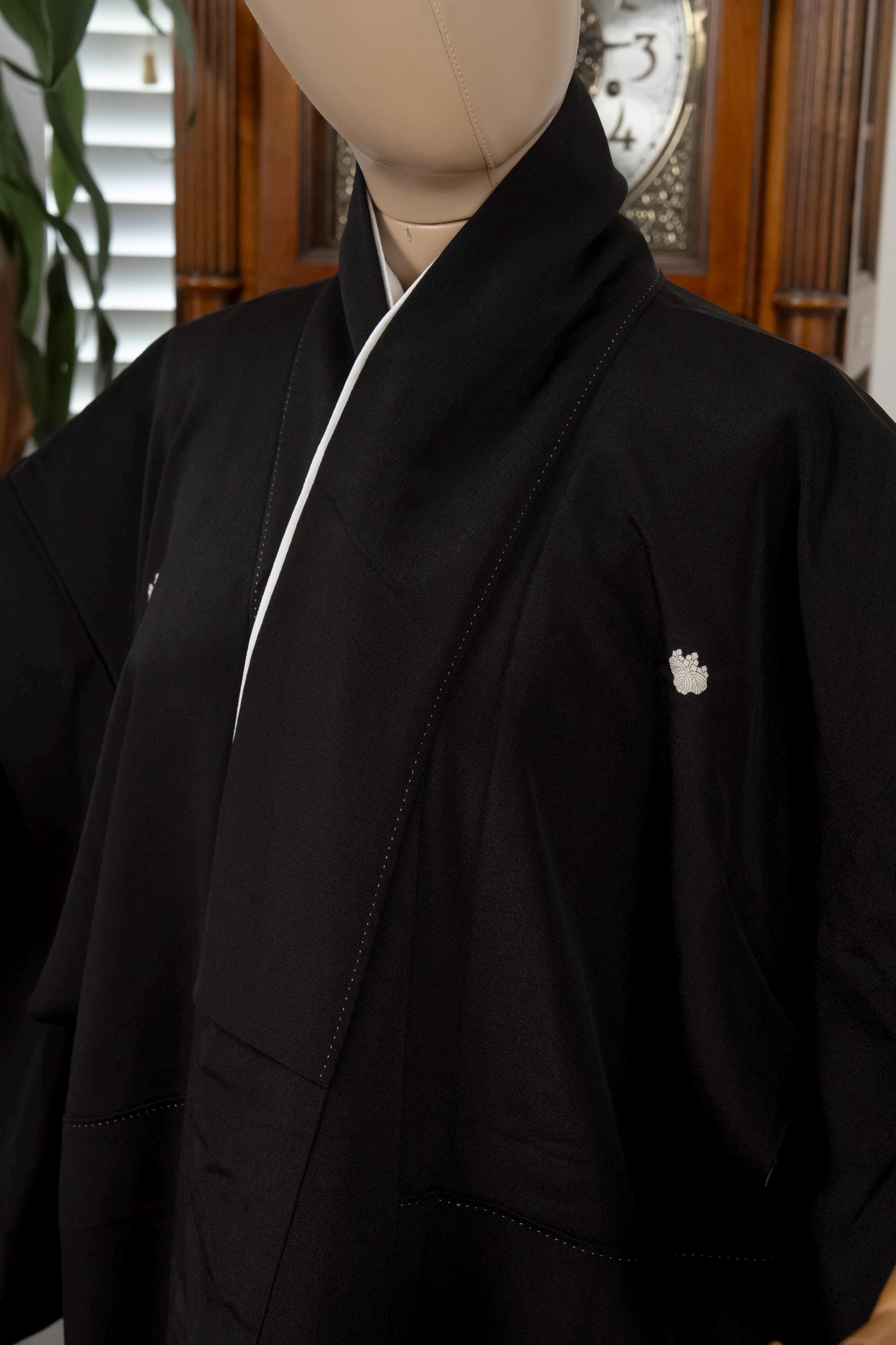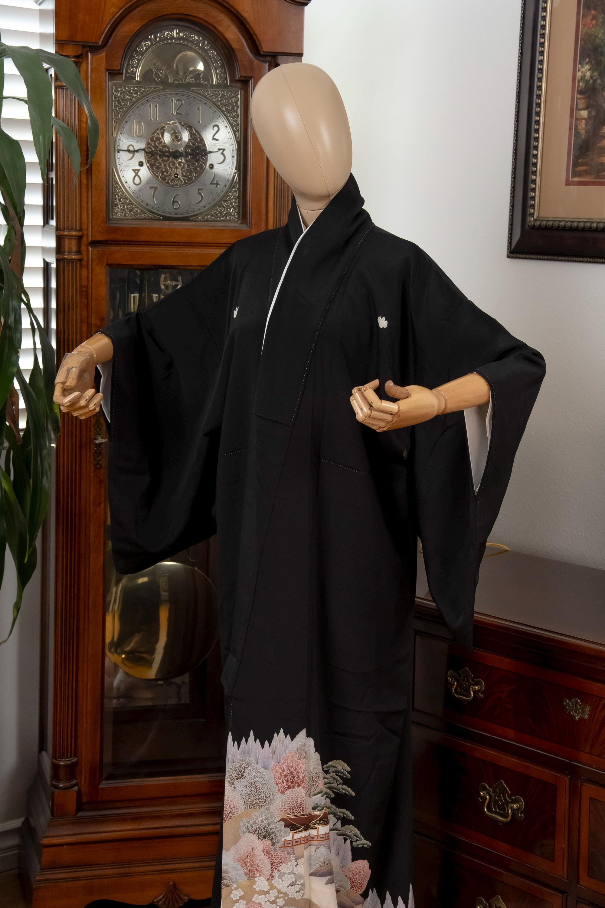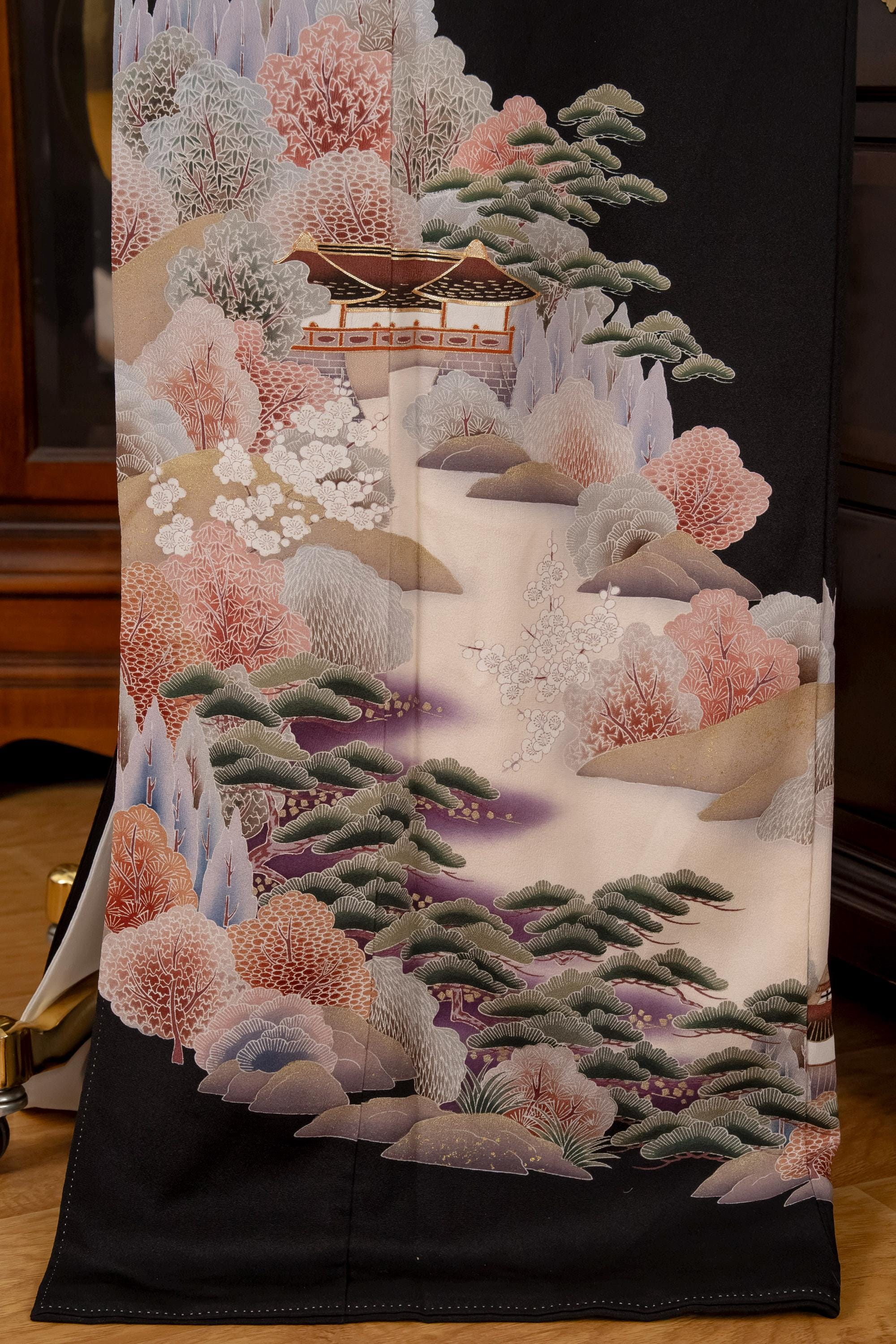 Tomesode is the most formal, high class Kimono for all ceremonies and occasions. Black ones are worn by married women and colored ones are worn by both married and unmarried women. Distinct characteristics of Tomesode are family crests and surrounding patterns around the hem. Numbers of family crests specify formality and rank.