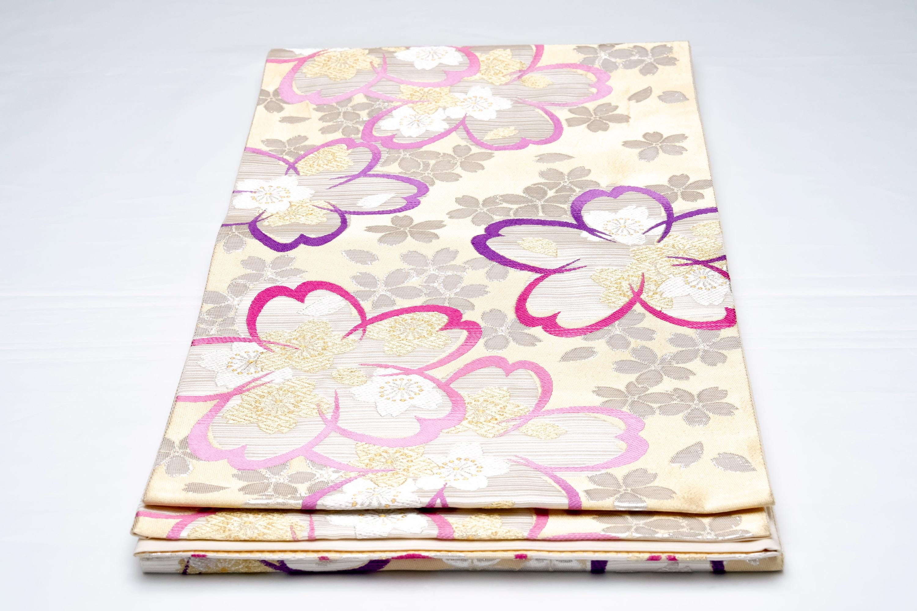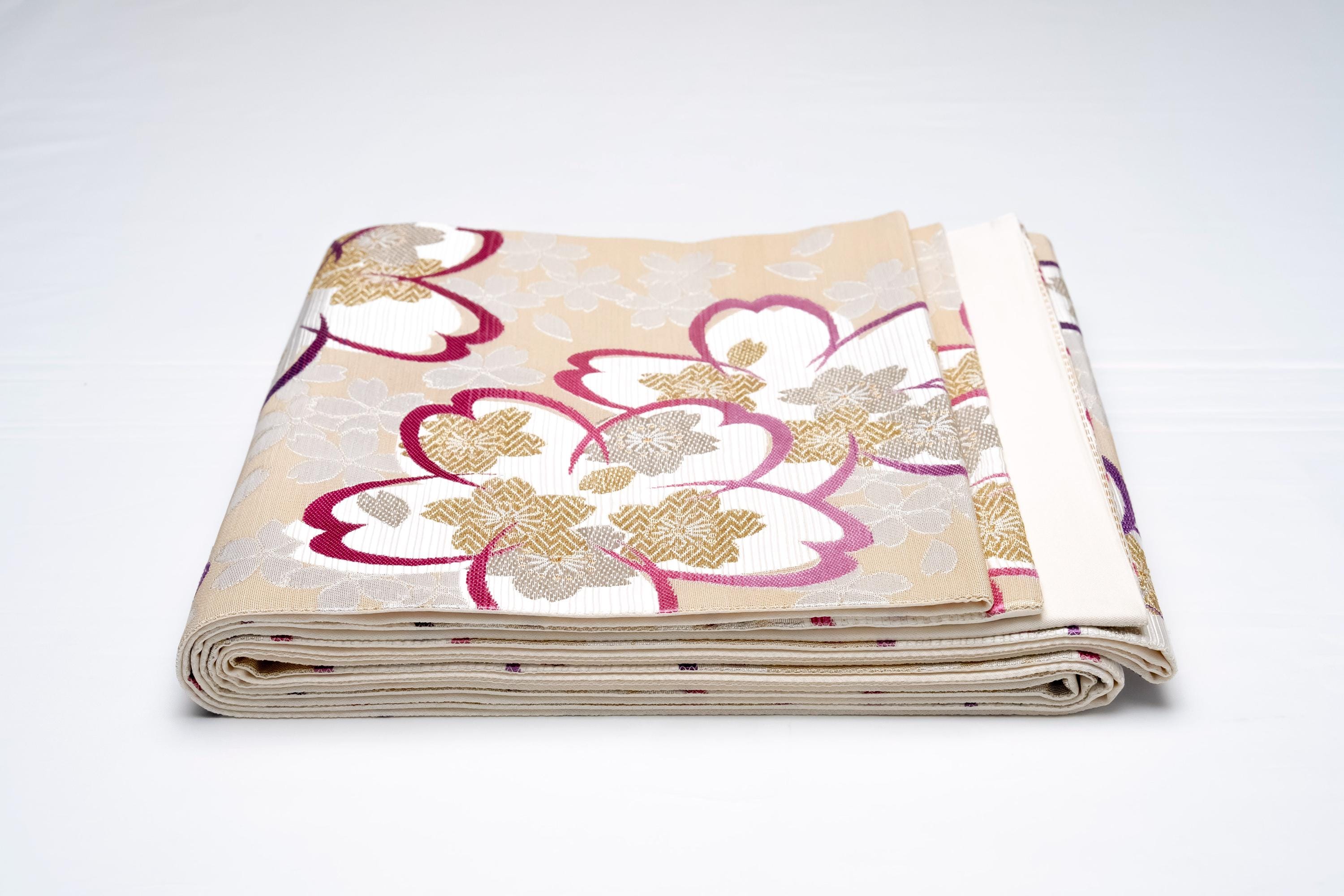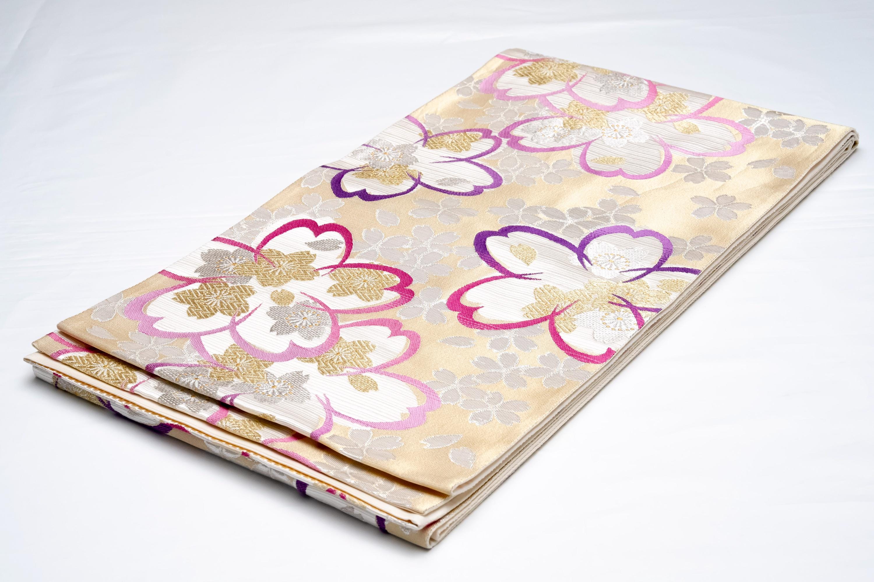 Fukuro Obi is a full-size sash belt that wraps around the torso in women's formal Kimono wearing. It is wider, longer and heavier than other informal Obis and serves the purpose of keeping the Kimono front closed securely, drawing up excess fabric to adjust the length of Kimono, and decorative expressions.
