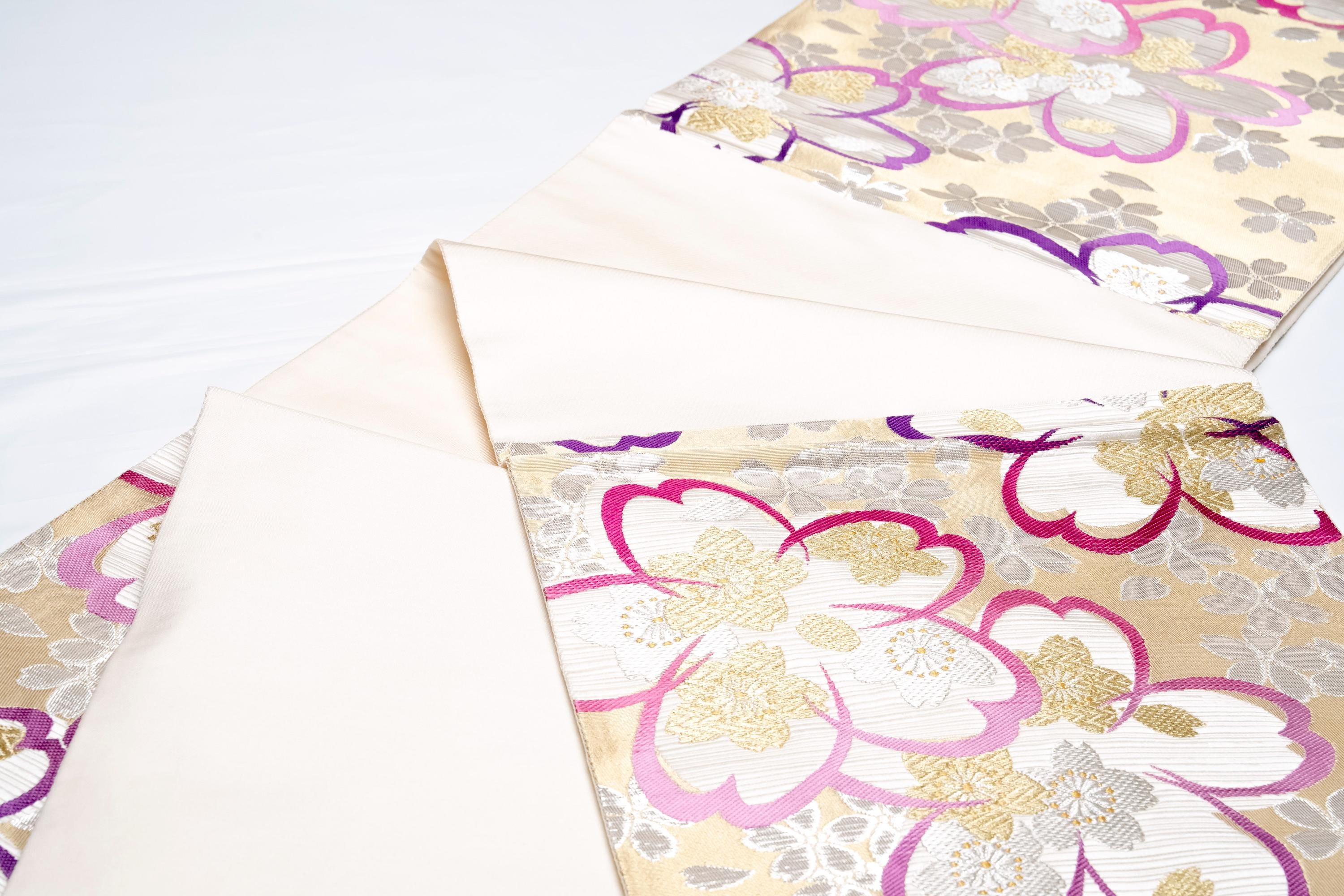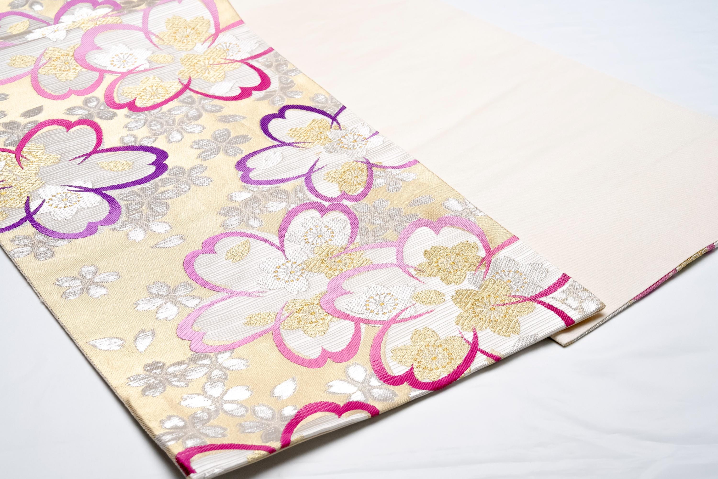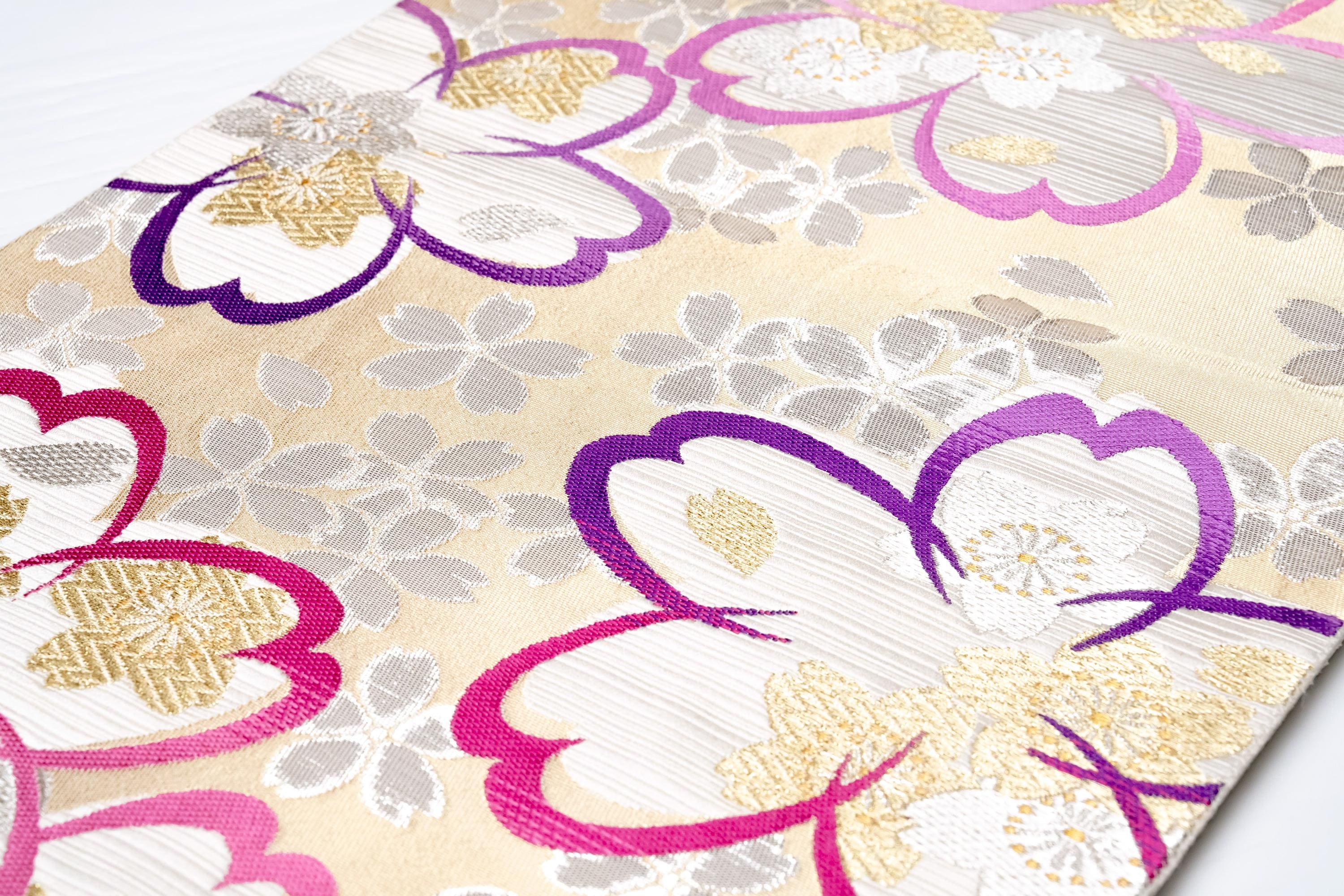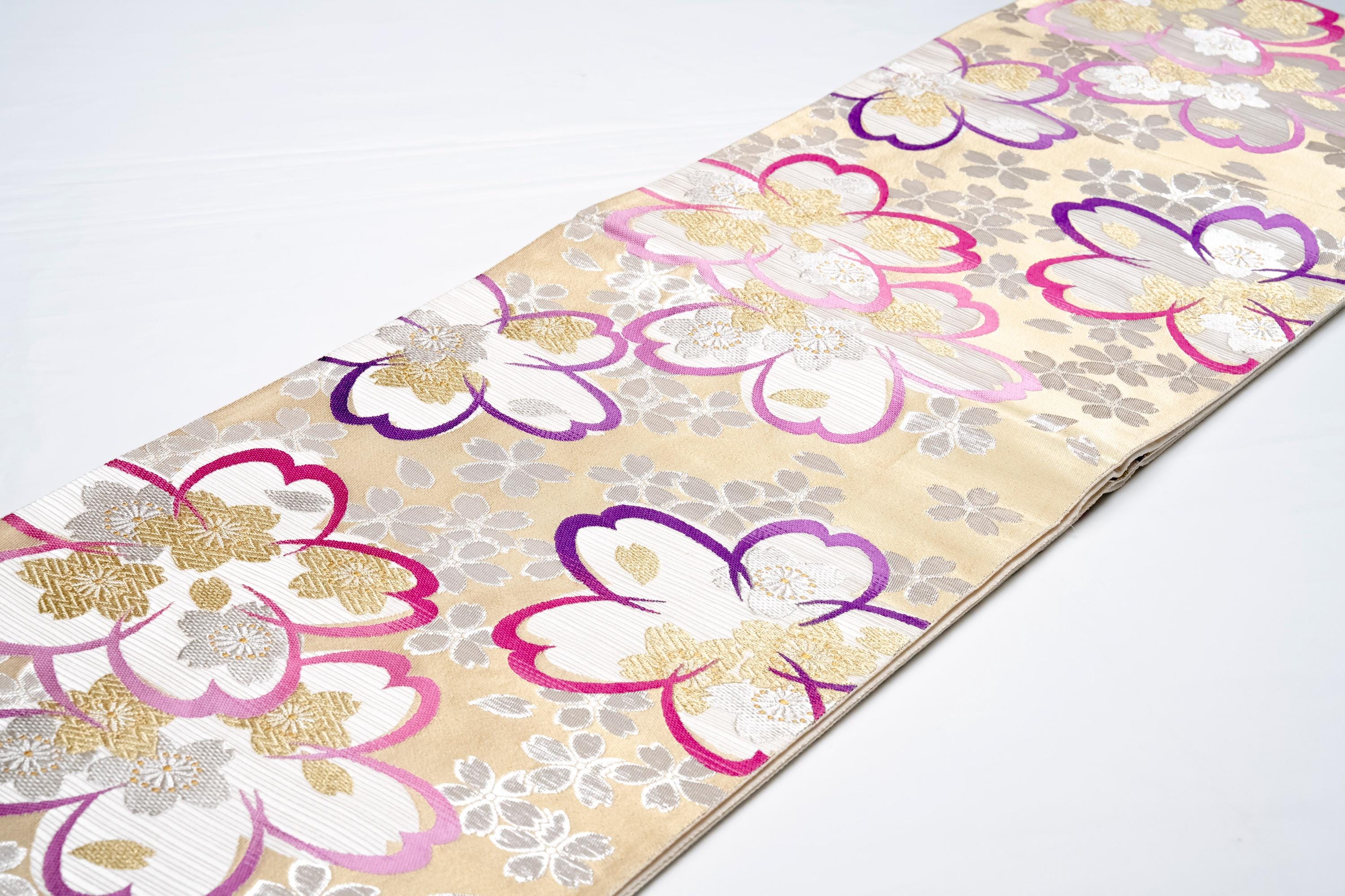 Fukuro Obi is a full-size sash belt that wraps around the torso in women's formal Kimono wearing. It is wider, longer and heavier than other informal Obis and serves the purpose of keeping the Kimono front closed securely, drawing up excess fabric to adjust the length of Kimono, and decorative expressions.