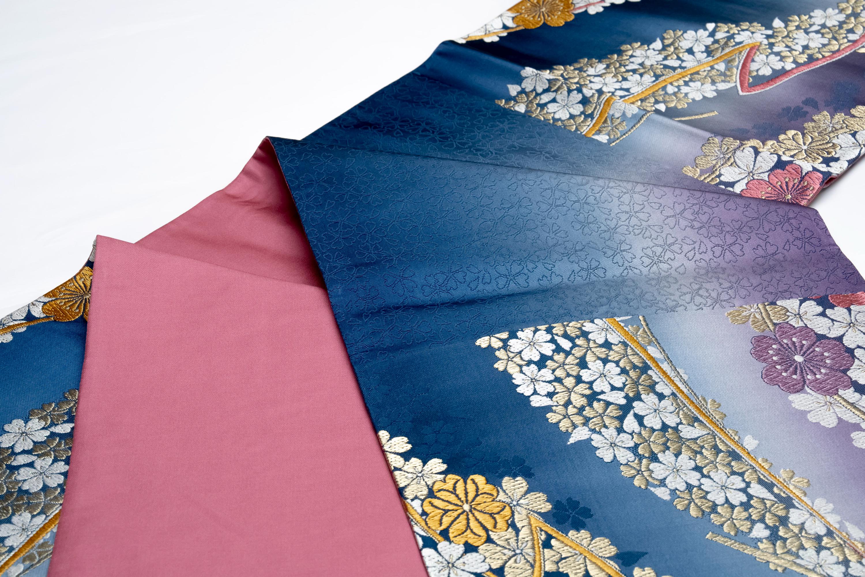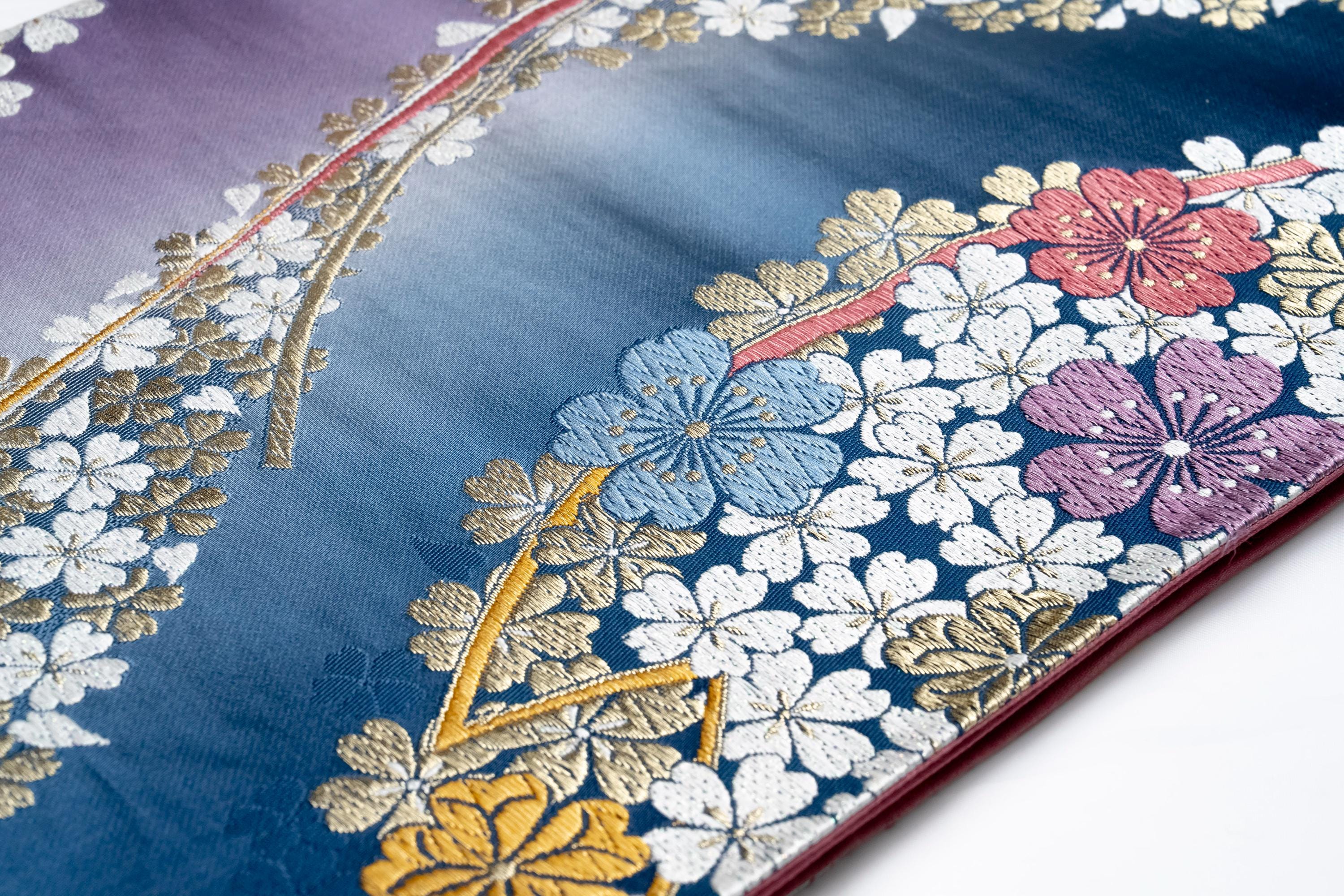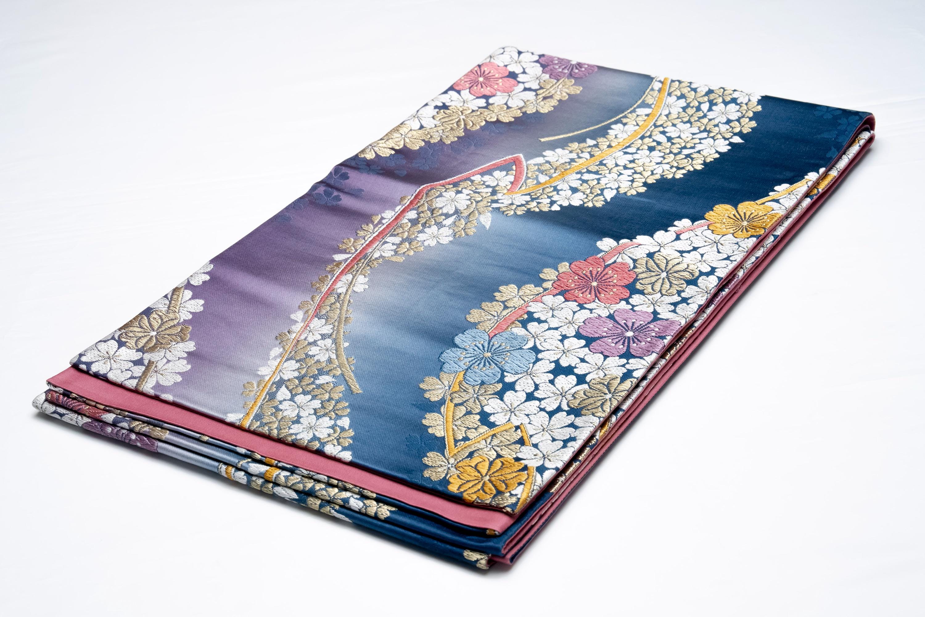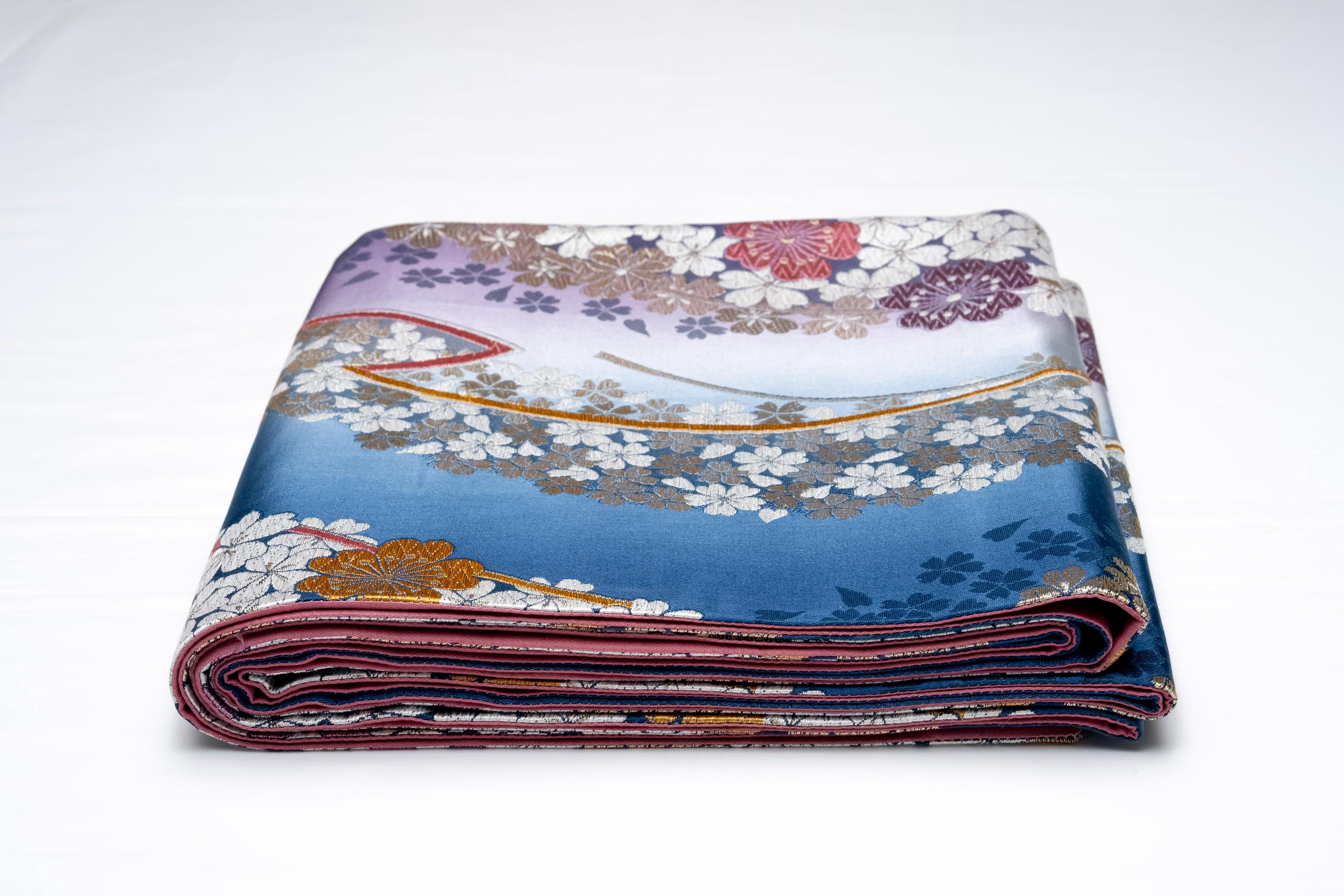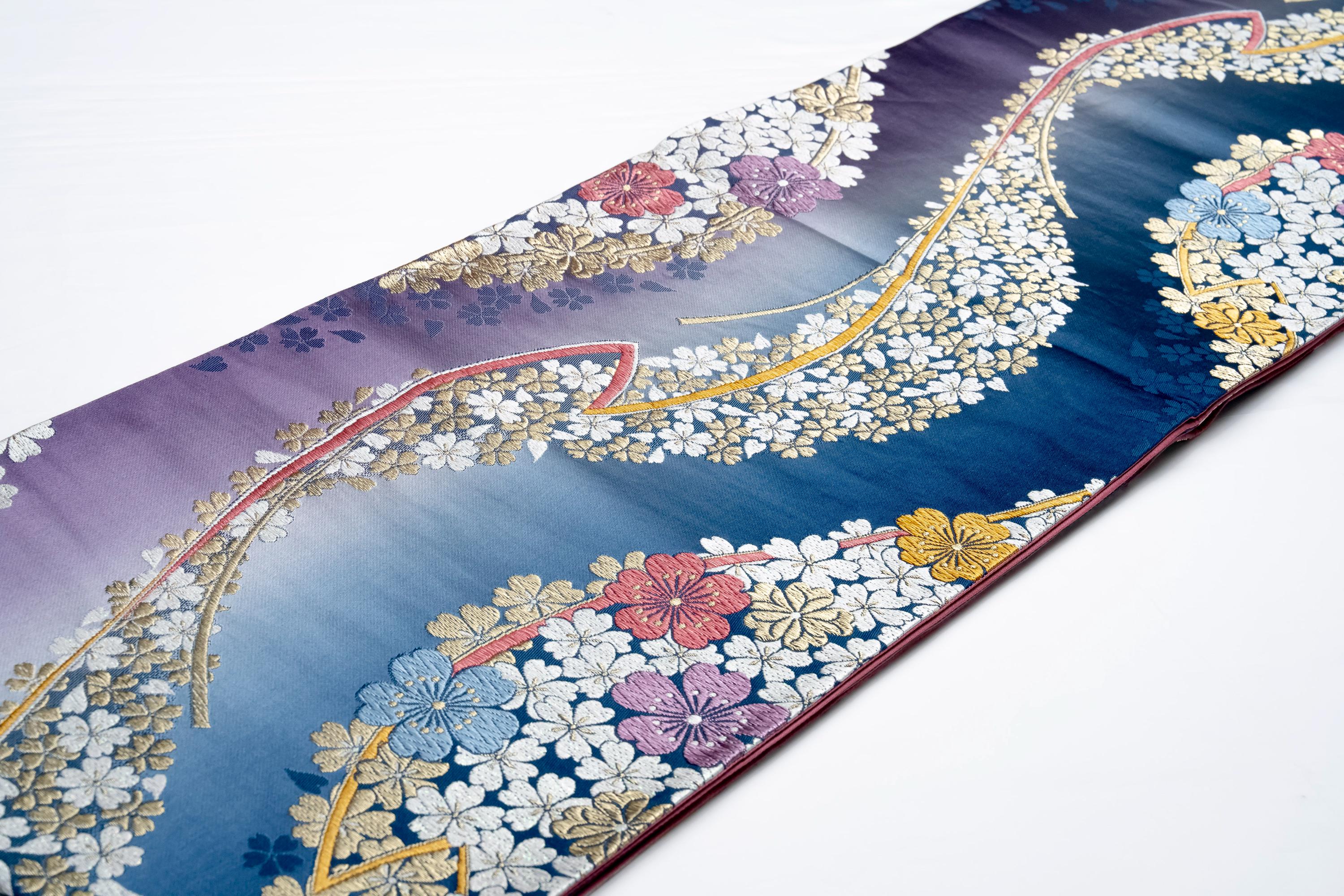 Fukuro Obi is a full-size sash belt that wraps around the torso in women's formal Kimono wearing. It is wider, longer and heavier than other informal Obis and serves the purpose of keeping the Kimono front closed securely, drawing up excess fabric to adjust the length of Kimono, and decorative expressions.