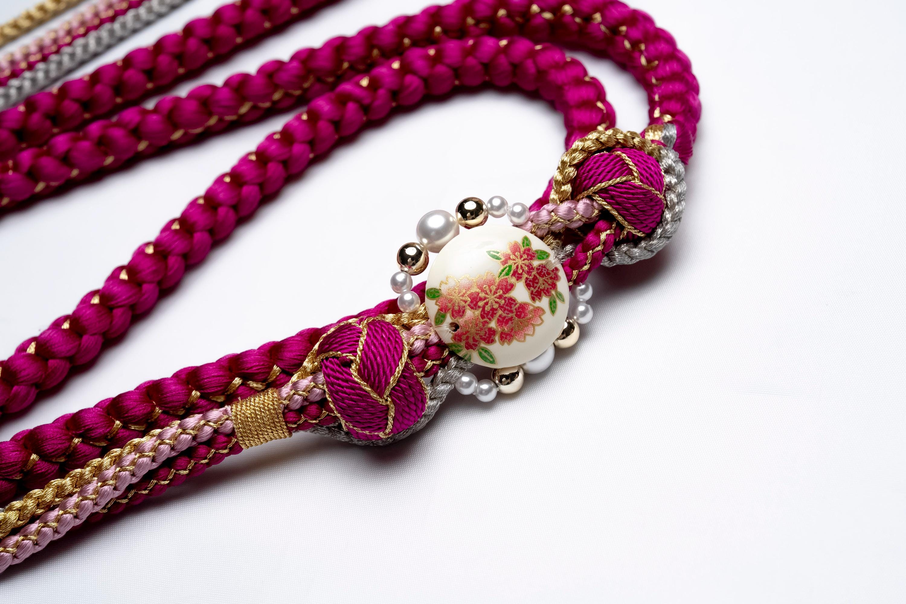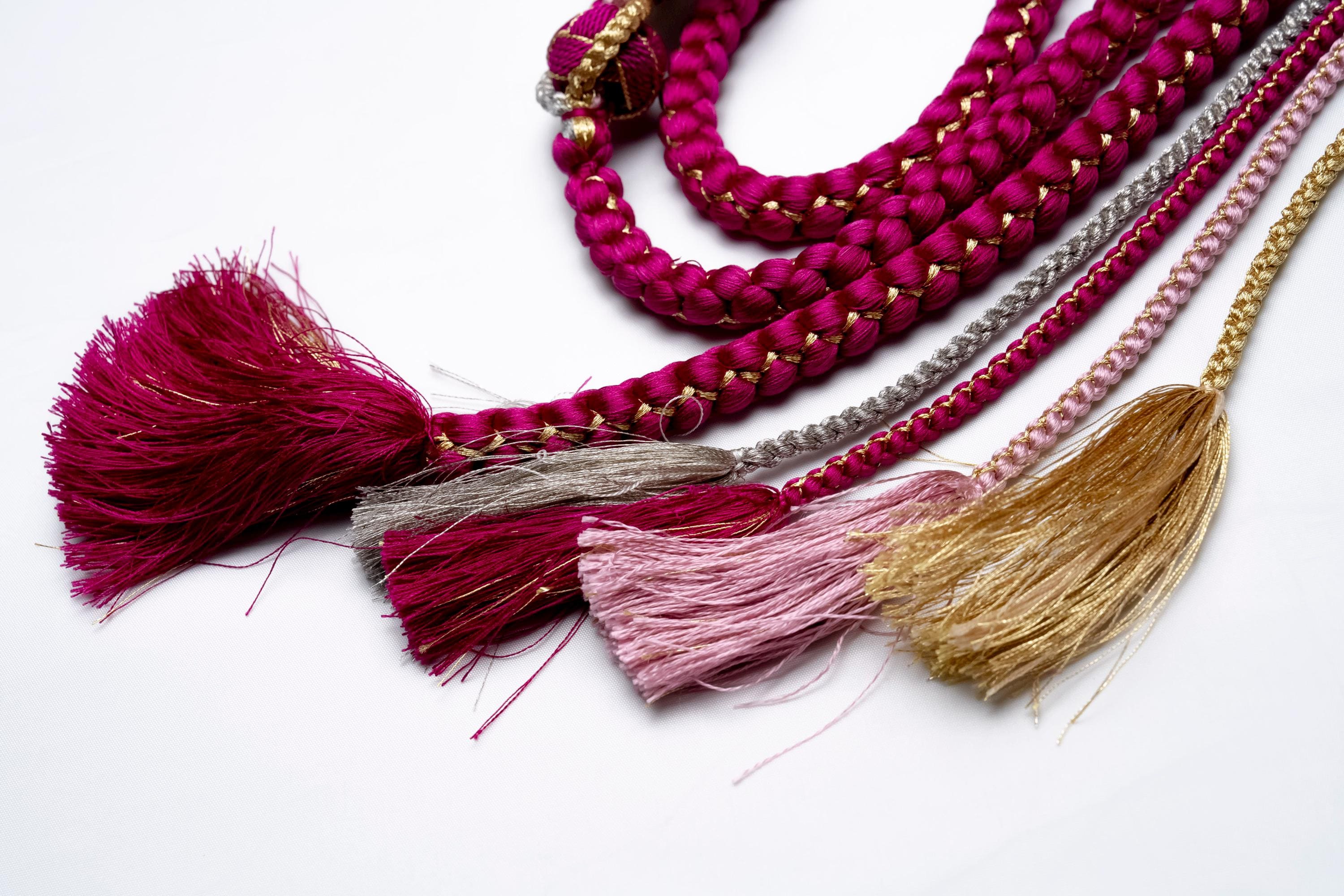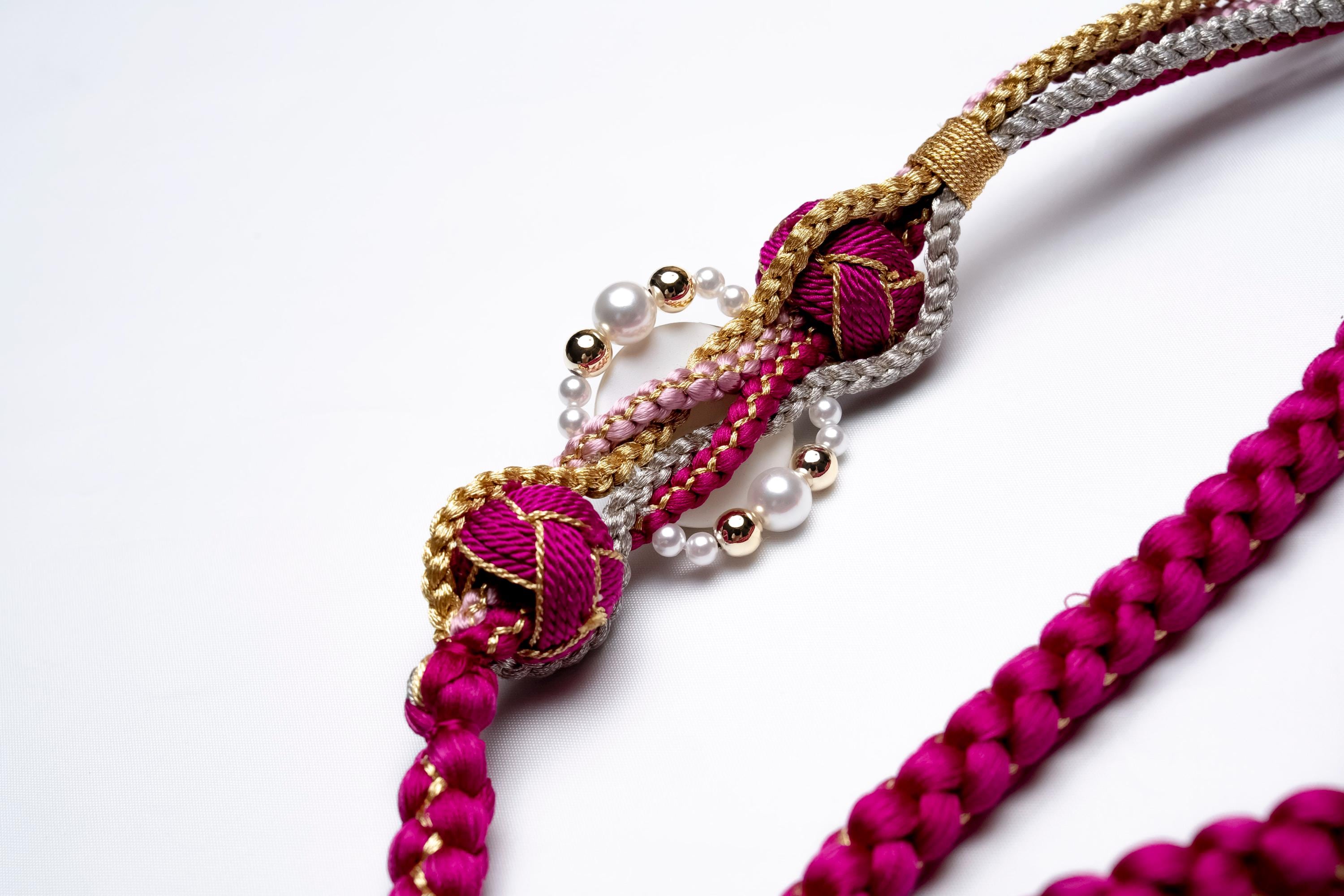 Obijime is one of the essentials in wearing women's Kimonos. Obijime is a fastener string used to hold Kimono Obi in place by tying over it. It's also called Obijime cord.