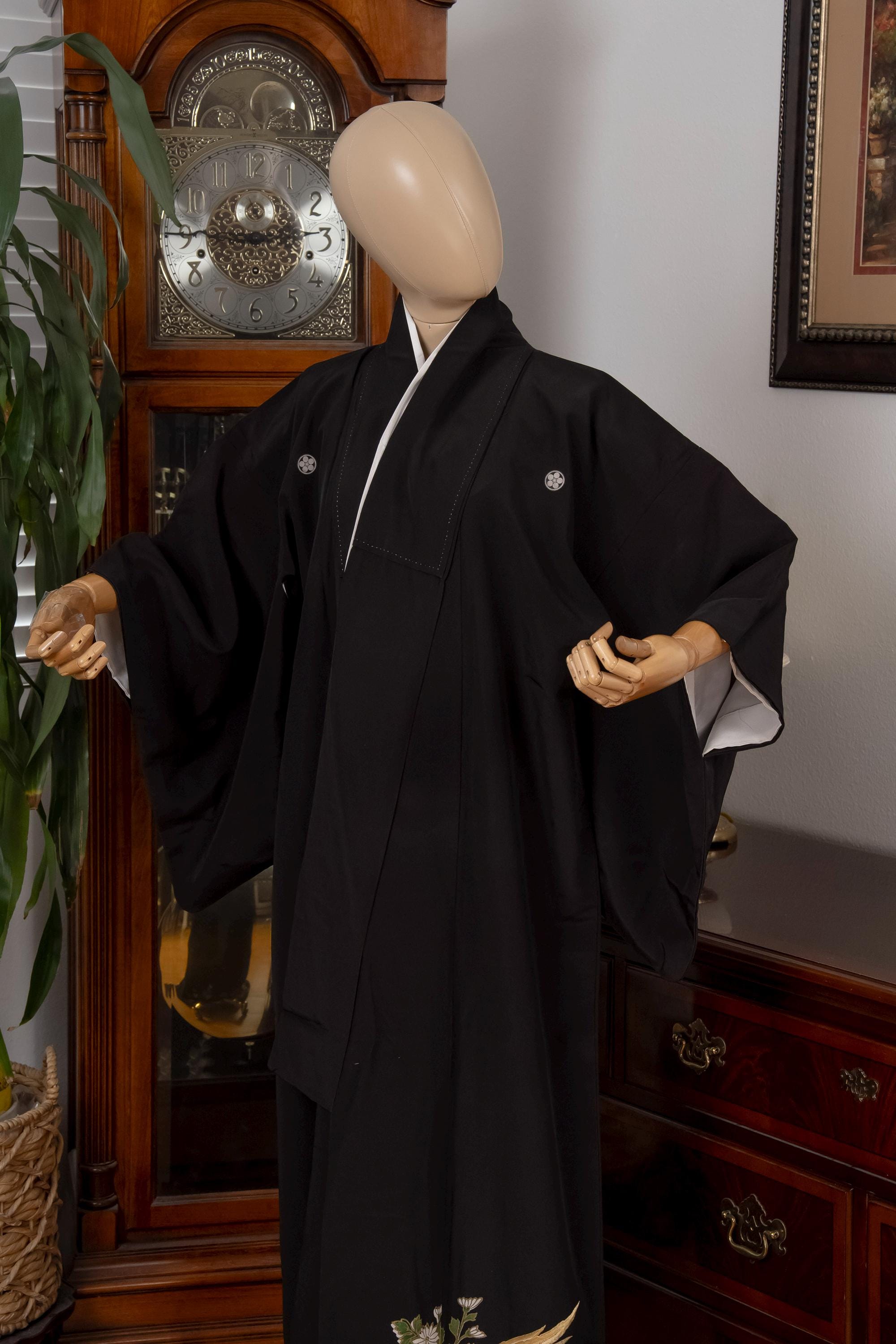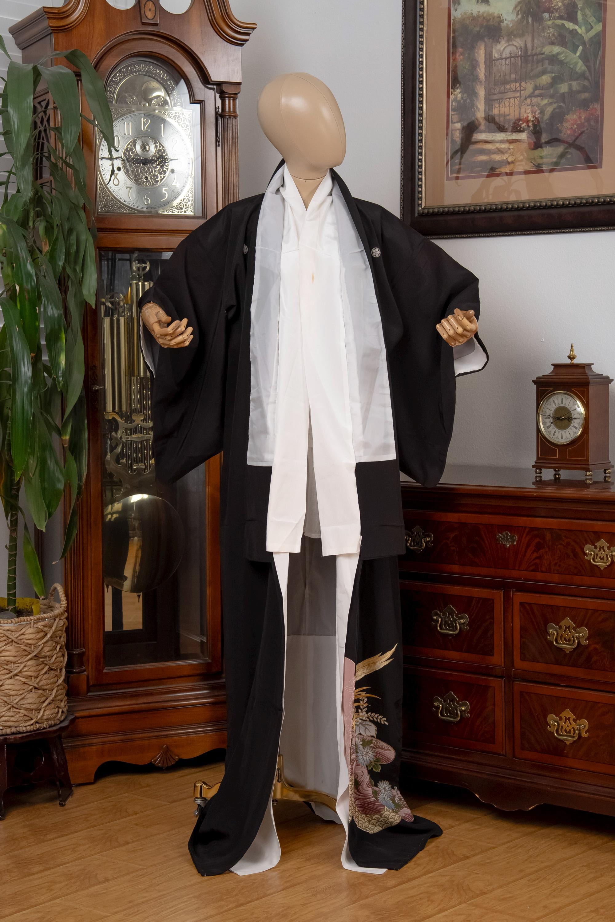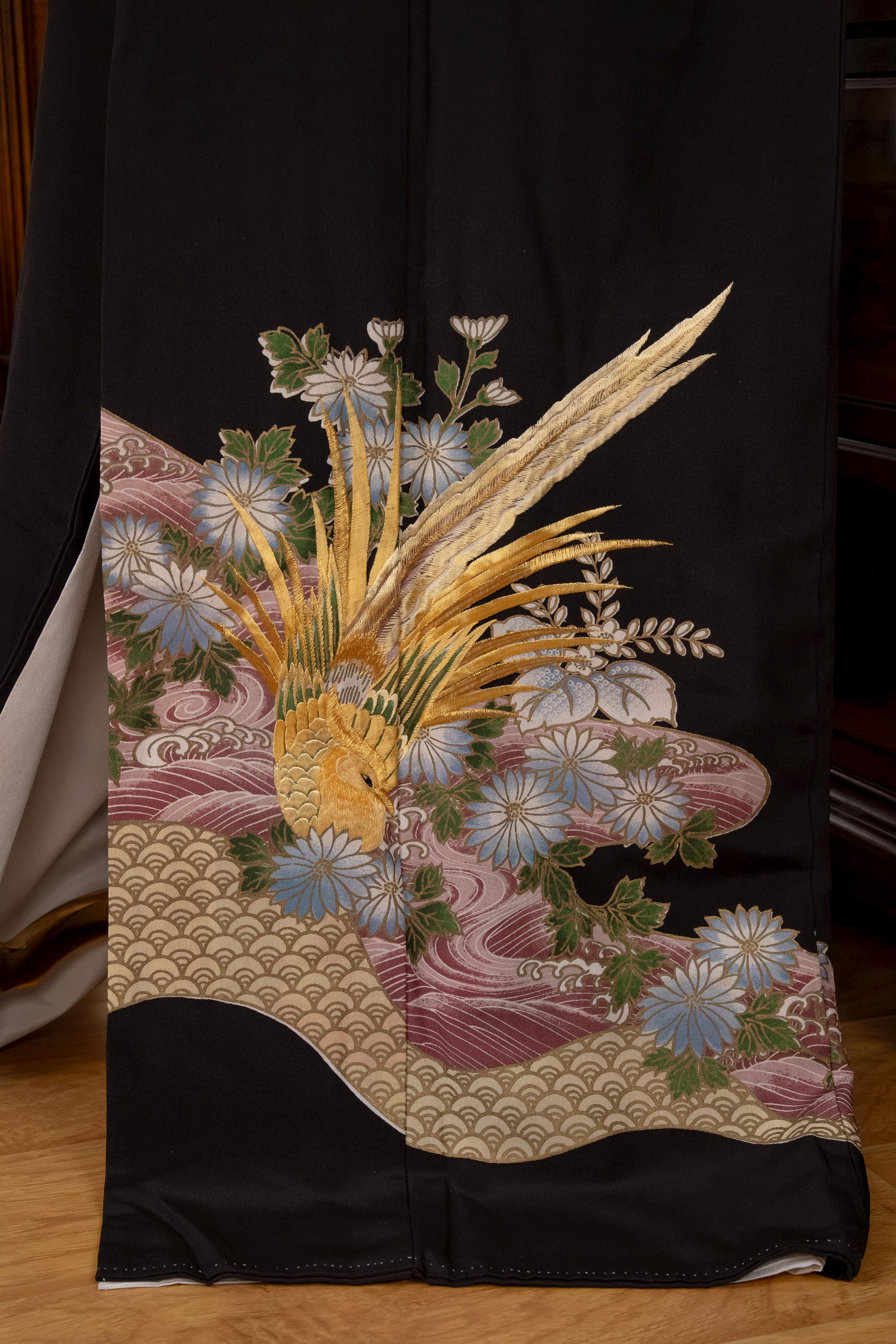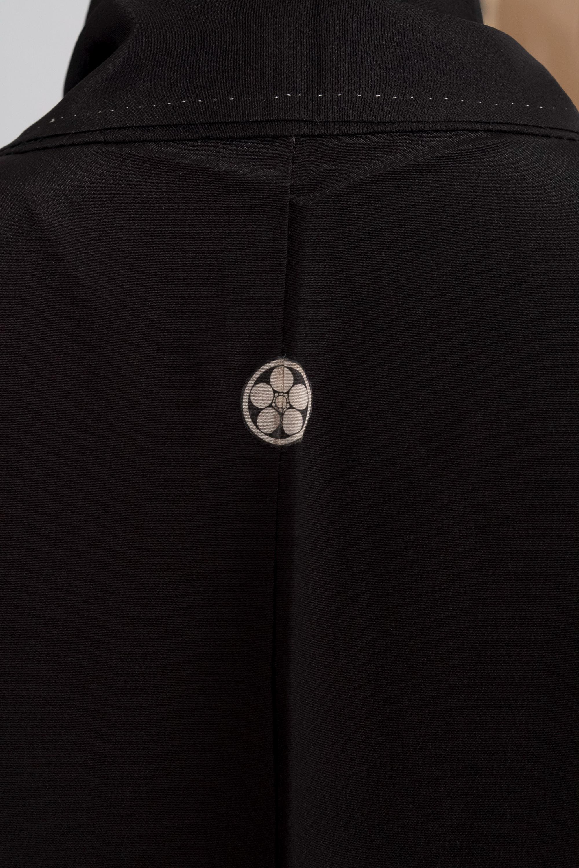 Tomesode is the most formal, high class Kimono for all ceremonies and occasions. Black ones are worn by married women and colored ones are worn by both married and unmarried women. Distinct characteristics of Tomesode are family crests and surrounding patterns around the hem. Numbers of family crests specify formality and rank.