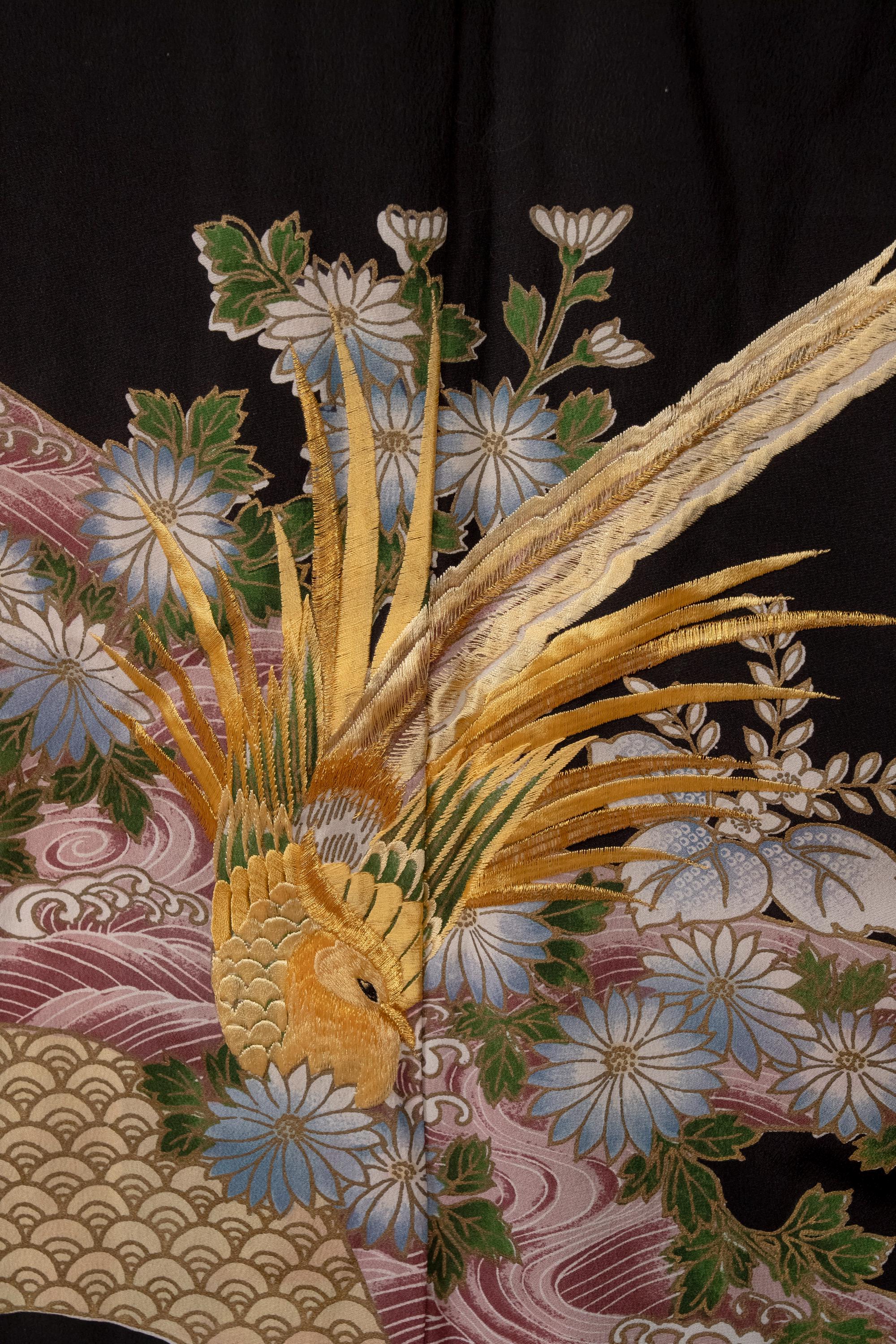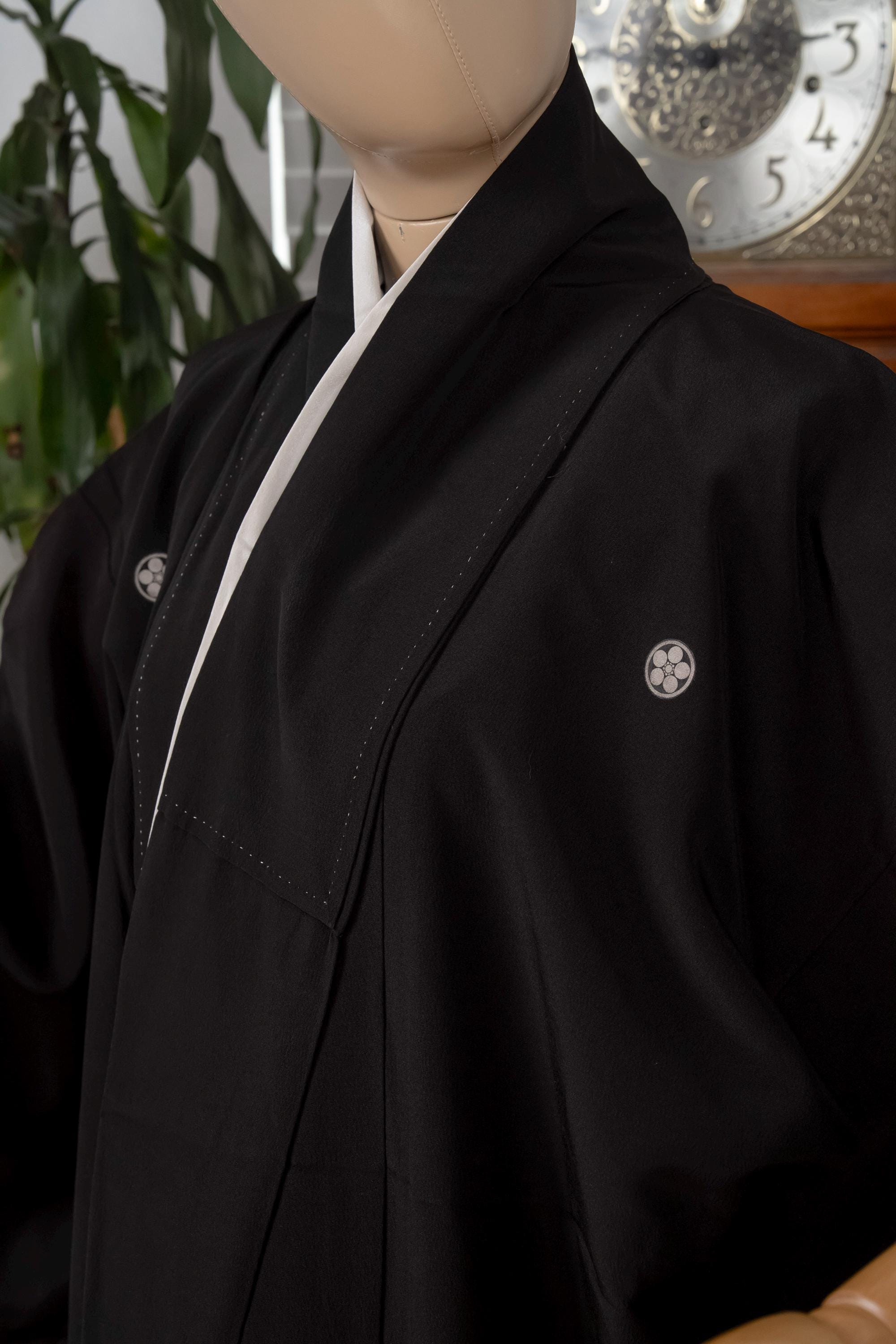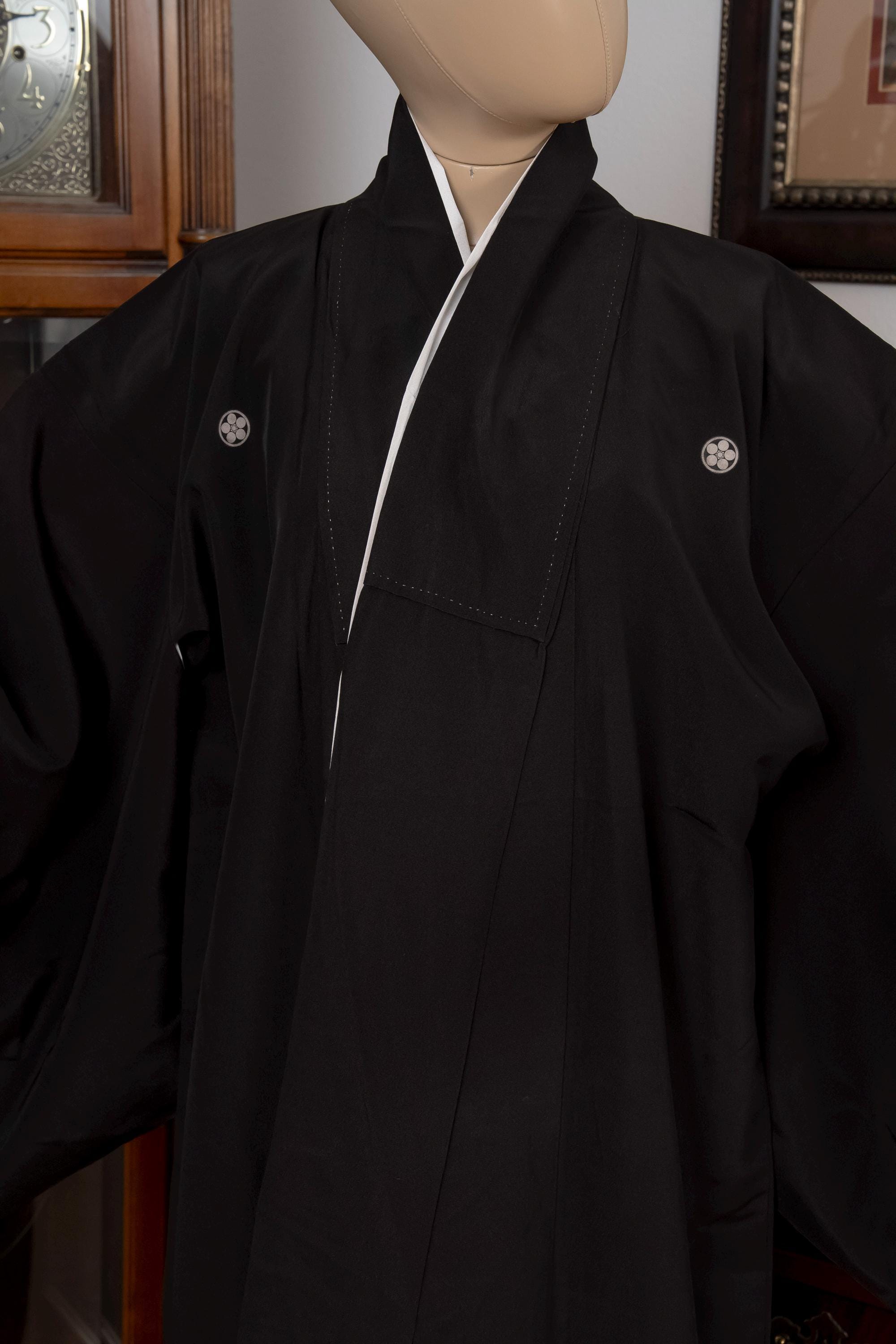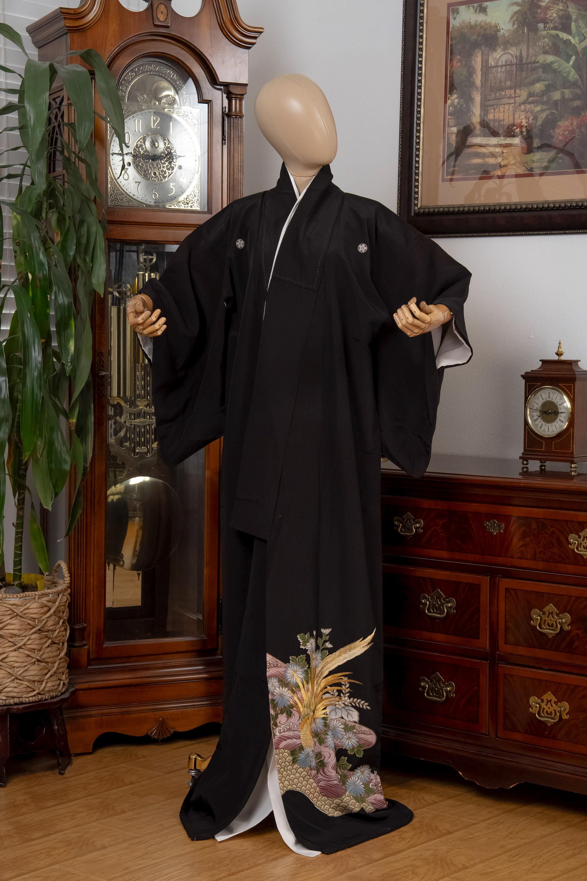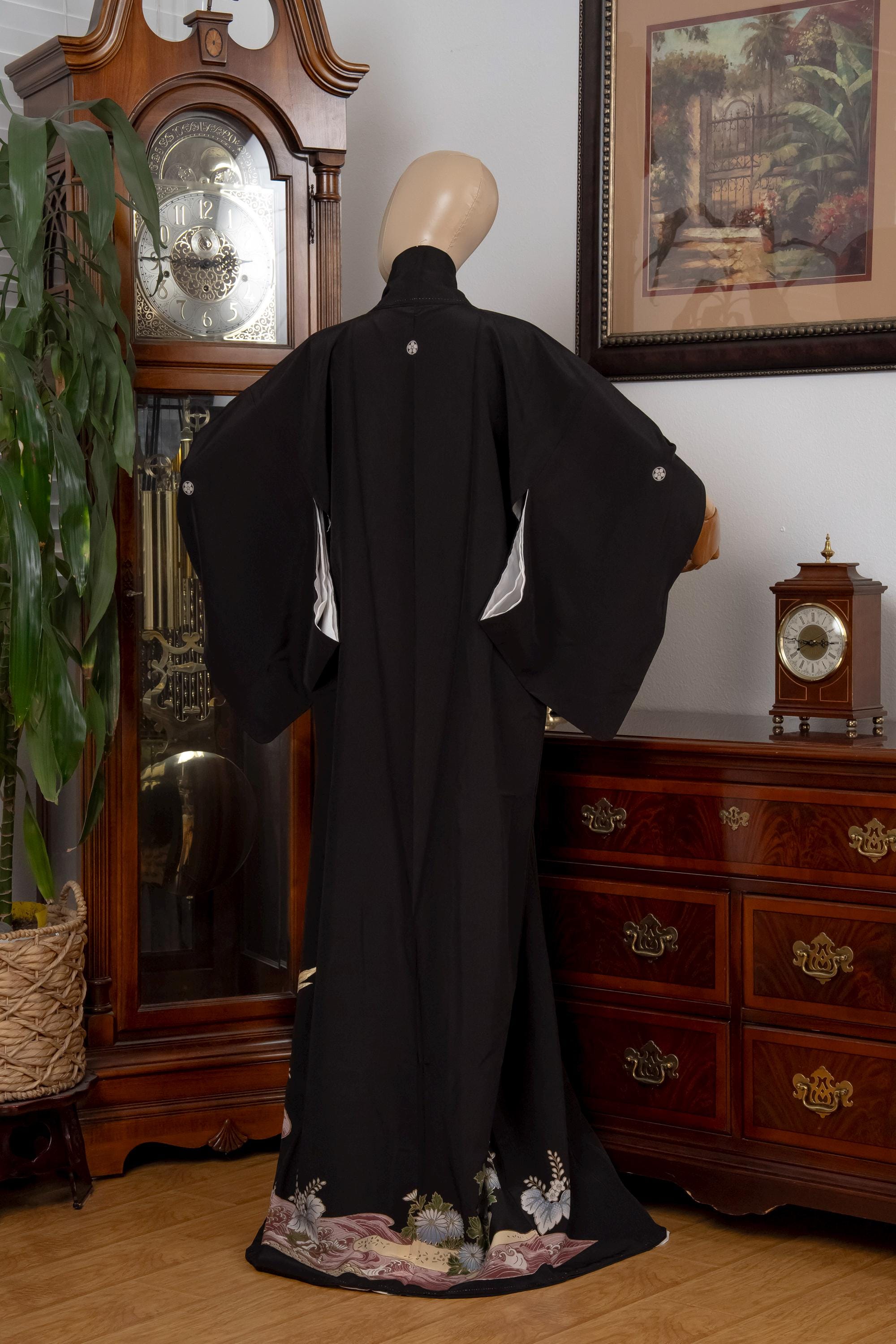 Tomesode is the most formal, high class Kimono for all ceremonies and occasions. Black ones are worn by married women and colored ones are worn by both married and unmarried women. Distinct characteristics of Tomesode are family crests and surrounding patterns around the hem. Numbers of family crests specify formality and rank.